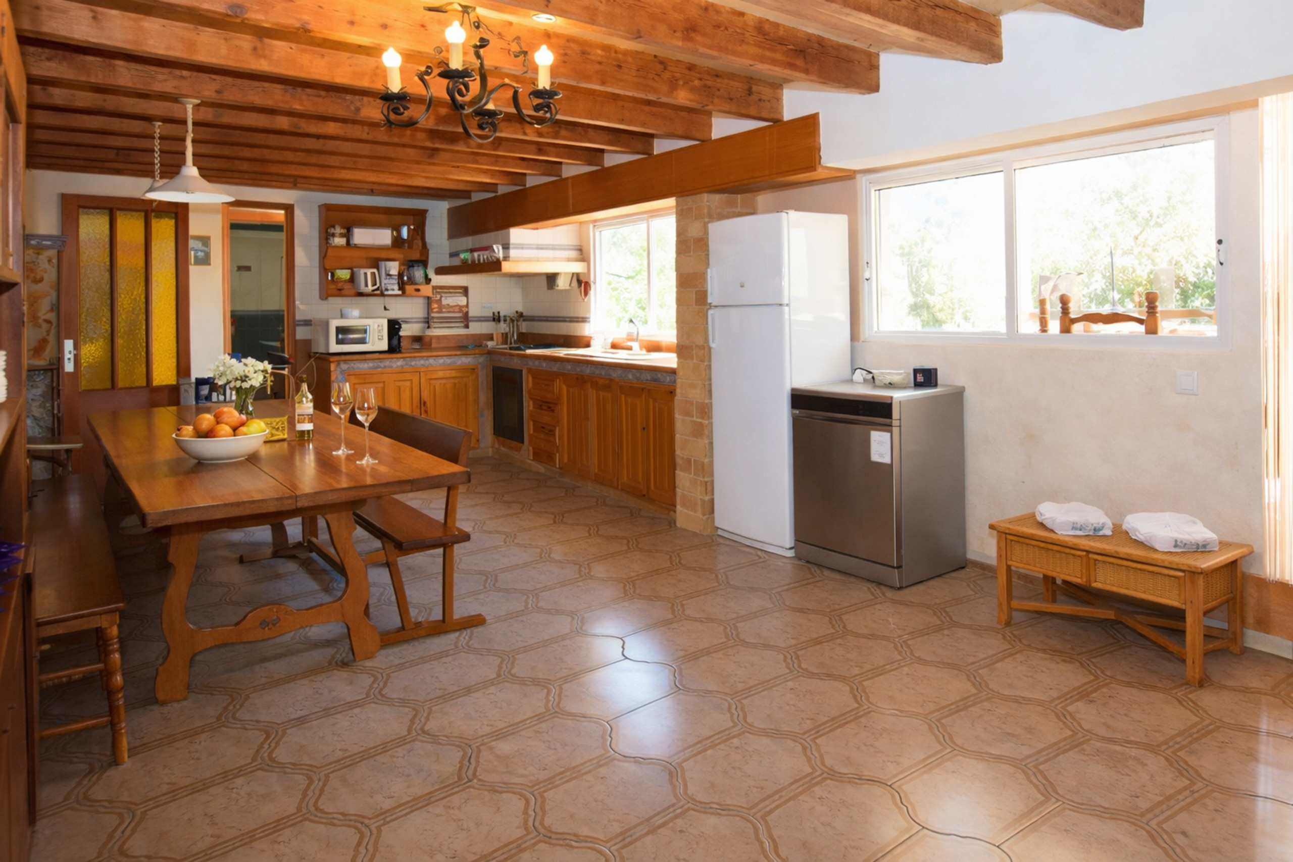 Un salon / salle à manger ouvert vous accueillera à l'entrée de la maison, avec des canapés, TV par satellite, lecteur DVD et WiFi, une grande table de salle à manger et la climatisation chaud / froid. La cuisine, moderne et entièrement équipée, facilite la préparation de délicieux repas et aidera sûrement à faire de ces vacances un moment spécial pour la famille.