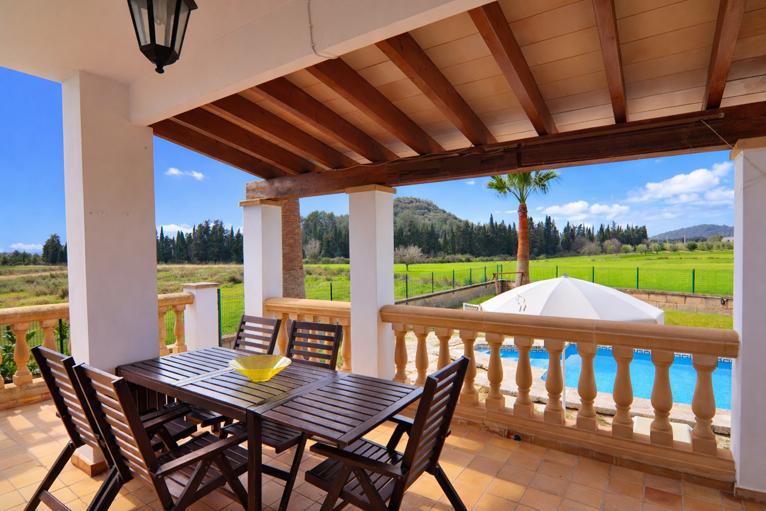 Belle et moderne Villa près de Sa Pobla avec une belle vue sur la montagne. La maison a une surface habitable d'environ 250 m². Au rez-de-chaussée, à côté de l'entrée à droite, se trouvent les escaliers menant au deuxième étage. À gauche se trouve la première chambre et devant une salle de bain, la salle à manger dans un concept ouvert avec le salon entièrement équipé, la cuisine est également super moderne. Il y a une autre salle à manger avec barbecue. Au premier étage, il y a deux salles de bain supplémentaires et trois chambres. Depuis le balcon, on peut profiter des fantastiques vues sur la campagne majorquine. La maison dispose de la climatisation et du chauffage central.