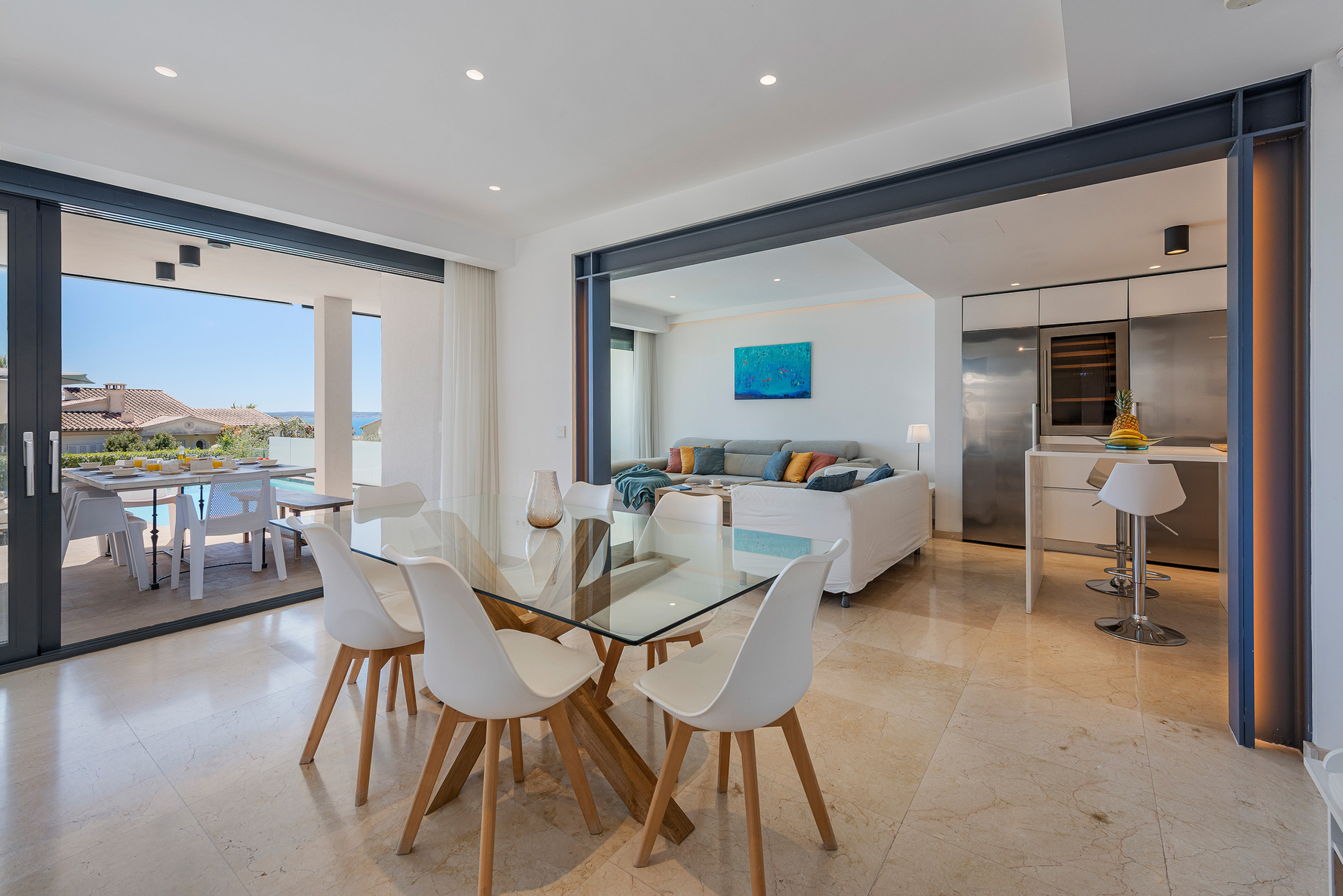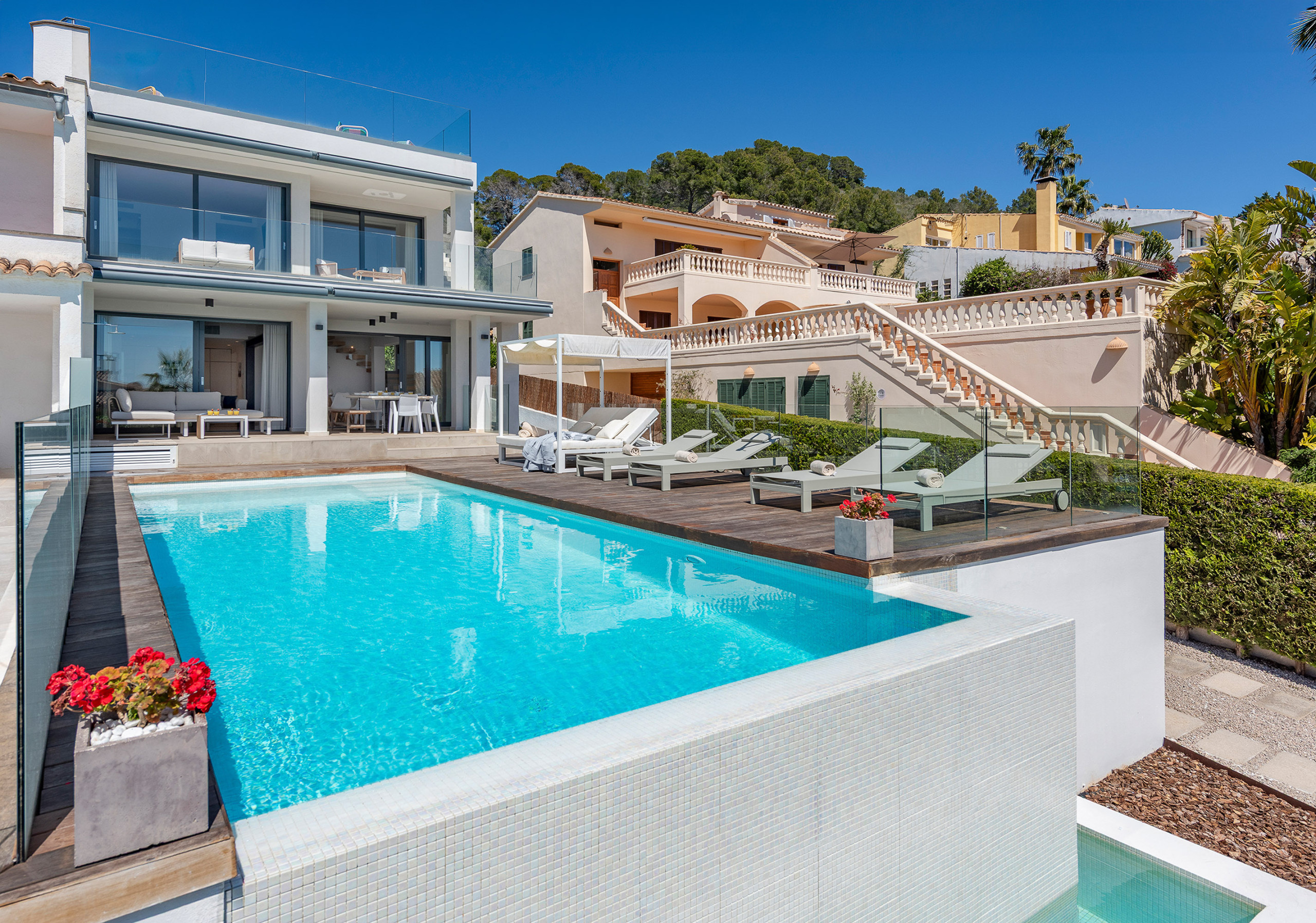 L’intérieur présente un design moderne et chaleureux, avec des tons neutres, des matériaux de qualité et un éclairage soigneusement étudié qui met en valeur les volumes. La cuisine ouverte, entièrement équipée, s’intègre parfaitement au salon-salle à manger, créant un espace ouvert avec accès direct à la terrasse extérieure. Le salon-salle à manger se distingue par son amplitude et sa luminosité, sa cheminée, sa télévision et son accès direct à l’extérieur, idéal pour profiter du climat méditerranéen. À l’extérieur, la propriété dispose d’une spectaculaire piscine à débordement chauffée, entourée d’un vaste solarium avec transats et espaces de détente. Une terrasse couverte avec coin repas extérieur, une zone barbecue et un jardin complètent cet espace, parfait pour profiter de moments en plein air de jour comme de nuit. Le stationnement est facile dans la rue juste devant la villa.