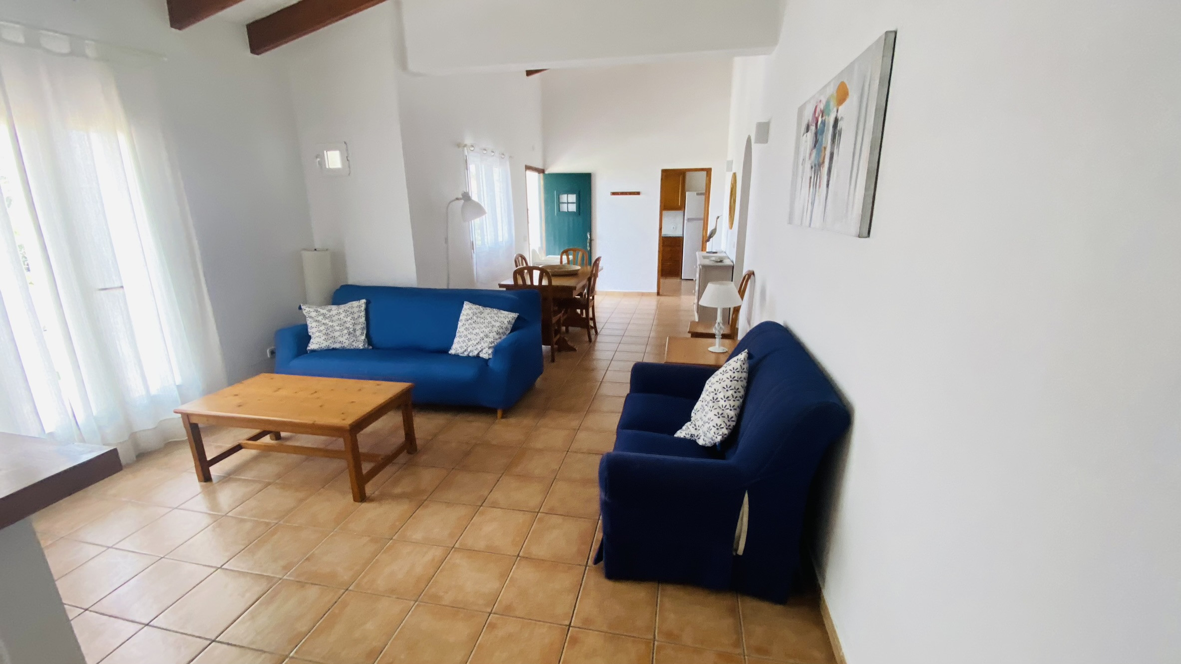 La maison a été décorée avec des meubles confortables en bois de pin et toutes les pièces se trouvent sur un seul niveau : salon/salle à manger, cuisine, buanderie, 1 chambre principale avec salle de bain complète attenante, 2 chambres doubles et 1 salle de bain complète.