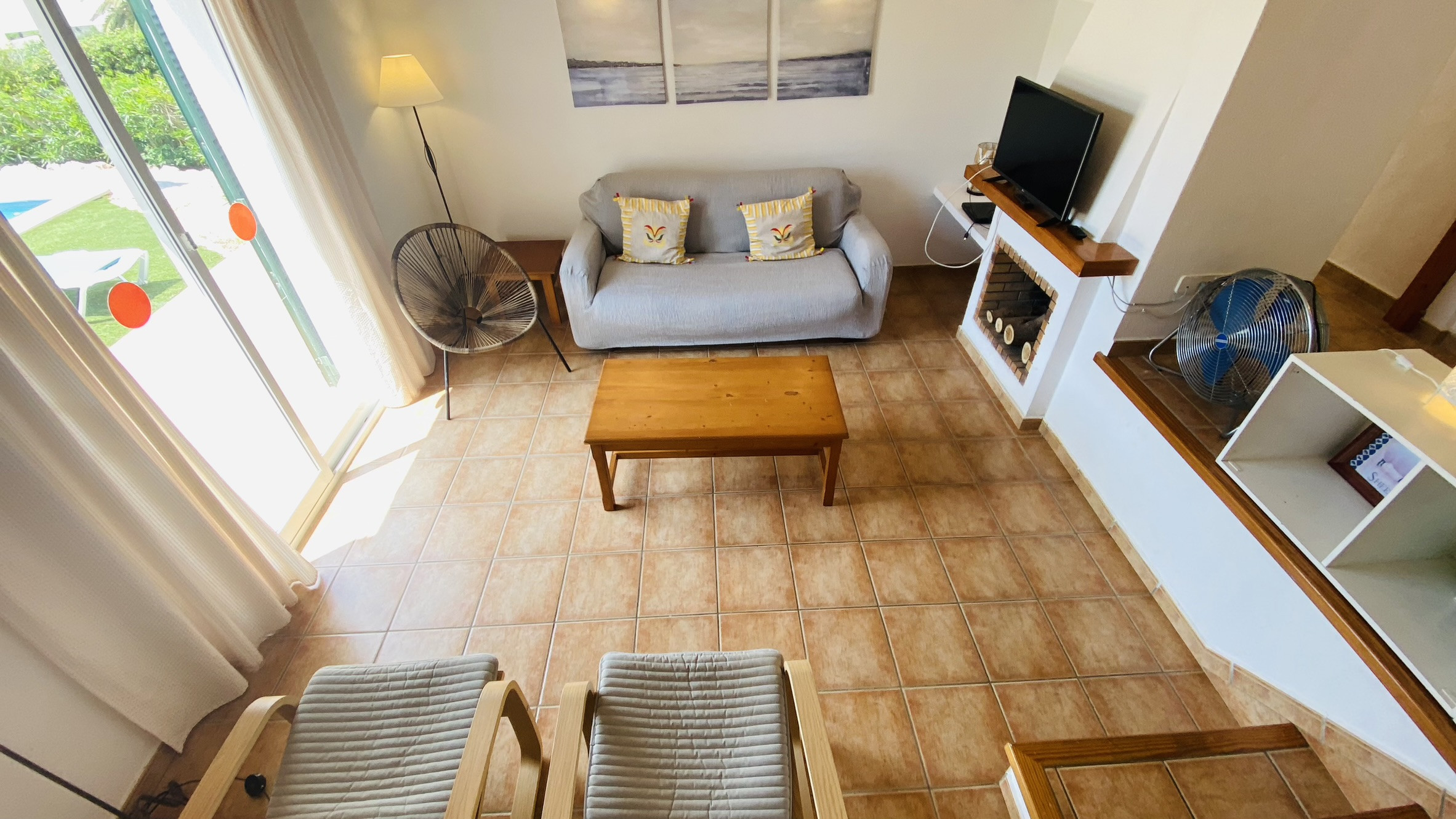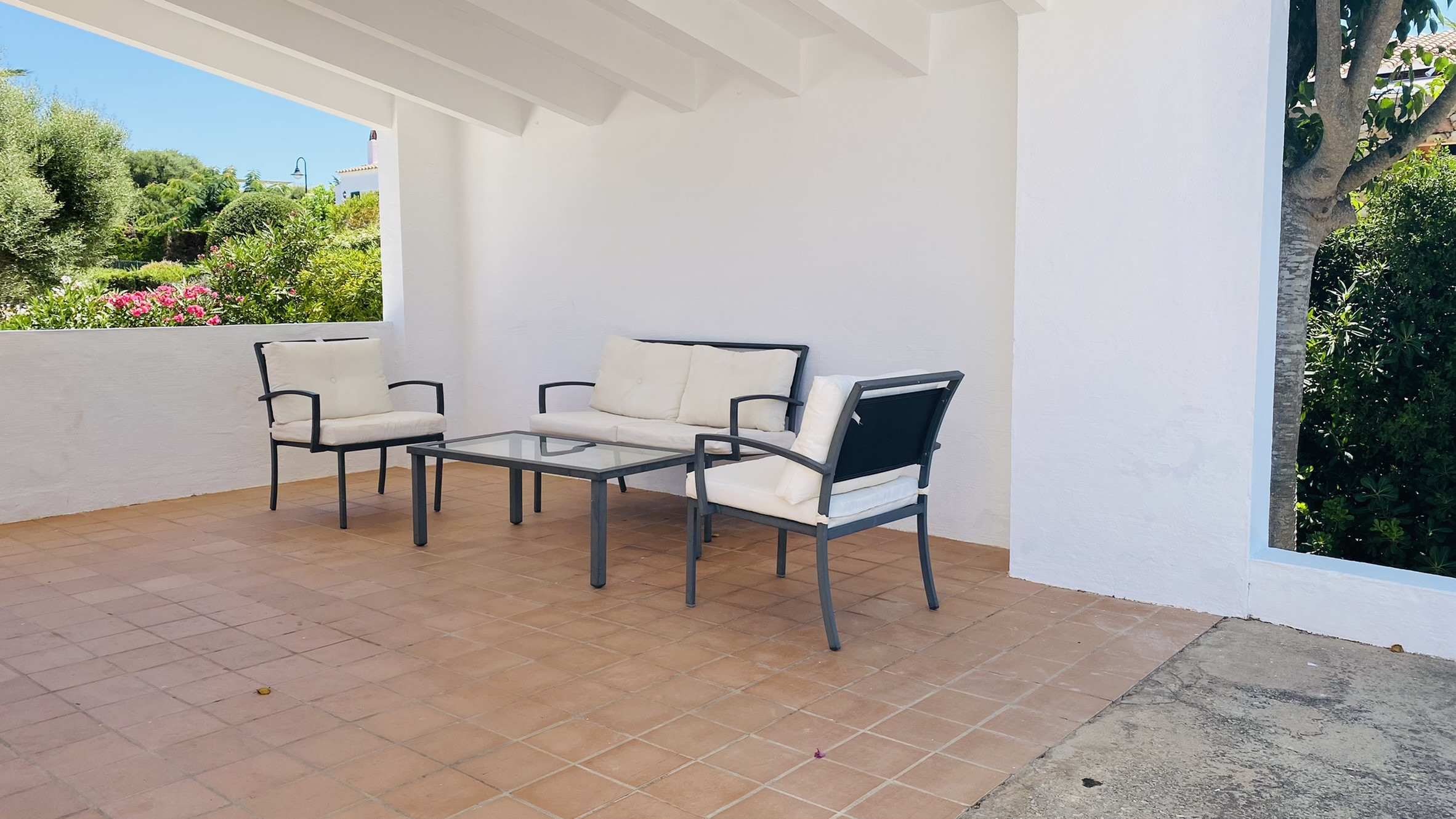 La maison dispose d'une terrasse avec une table et des chaises pour manger en plein air et des canapés pour se détendre à l'ombre. Elle possède une zone d'herbe artificielle avec de la végétation locale et la piscine, de 7m x 3m, est entourée d'un sol de terrasse. Il y a un barbecue en maçonnerie et un porche pour se garer à l'ombre.