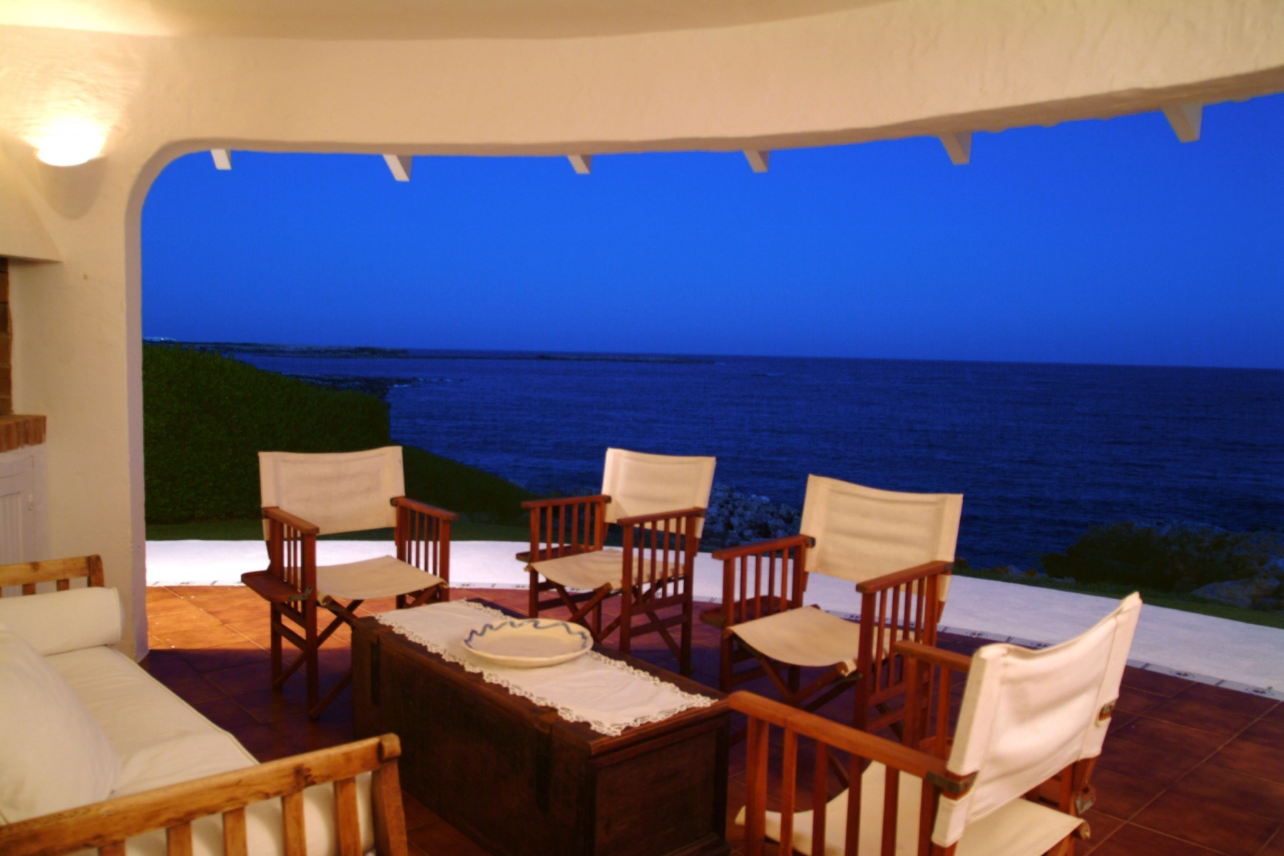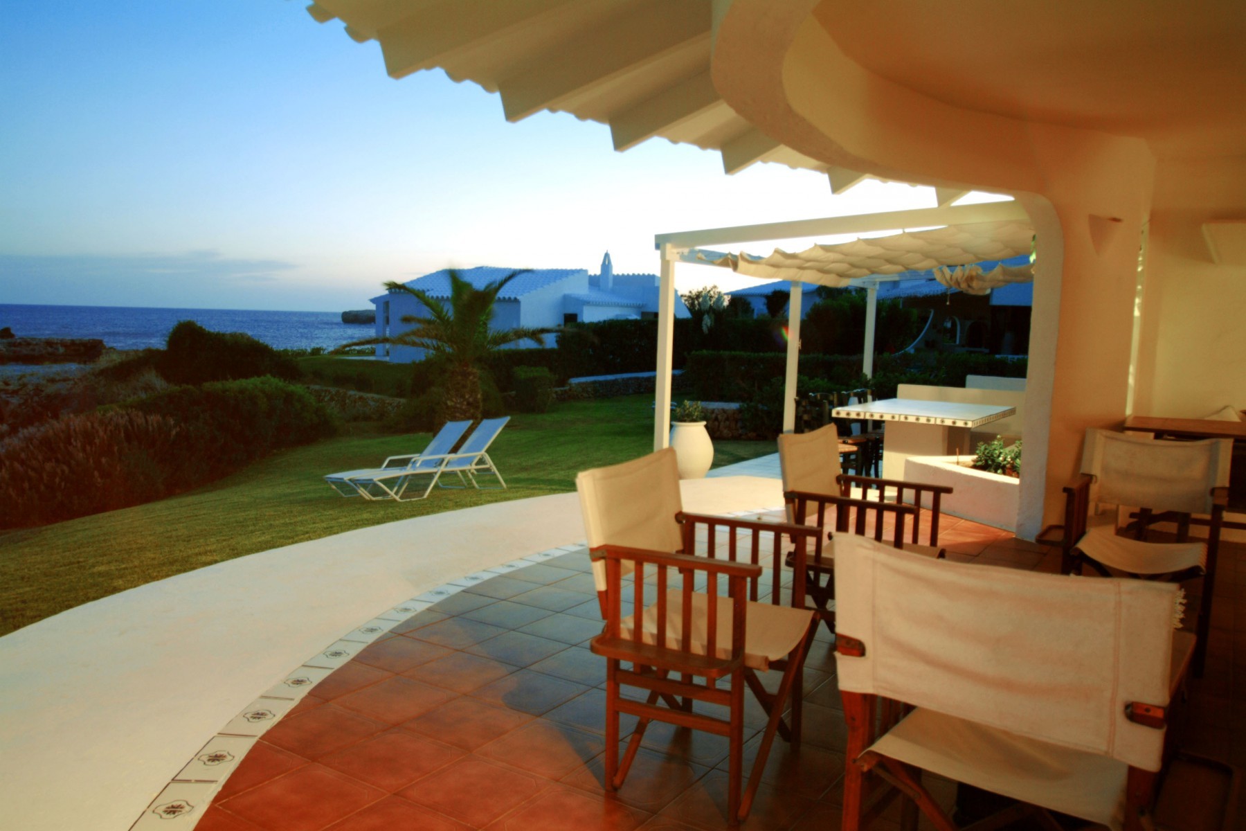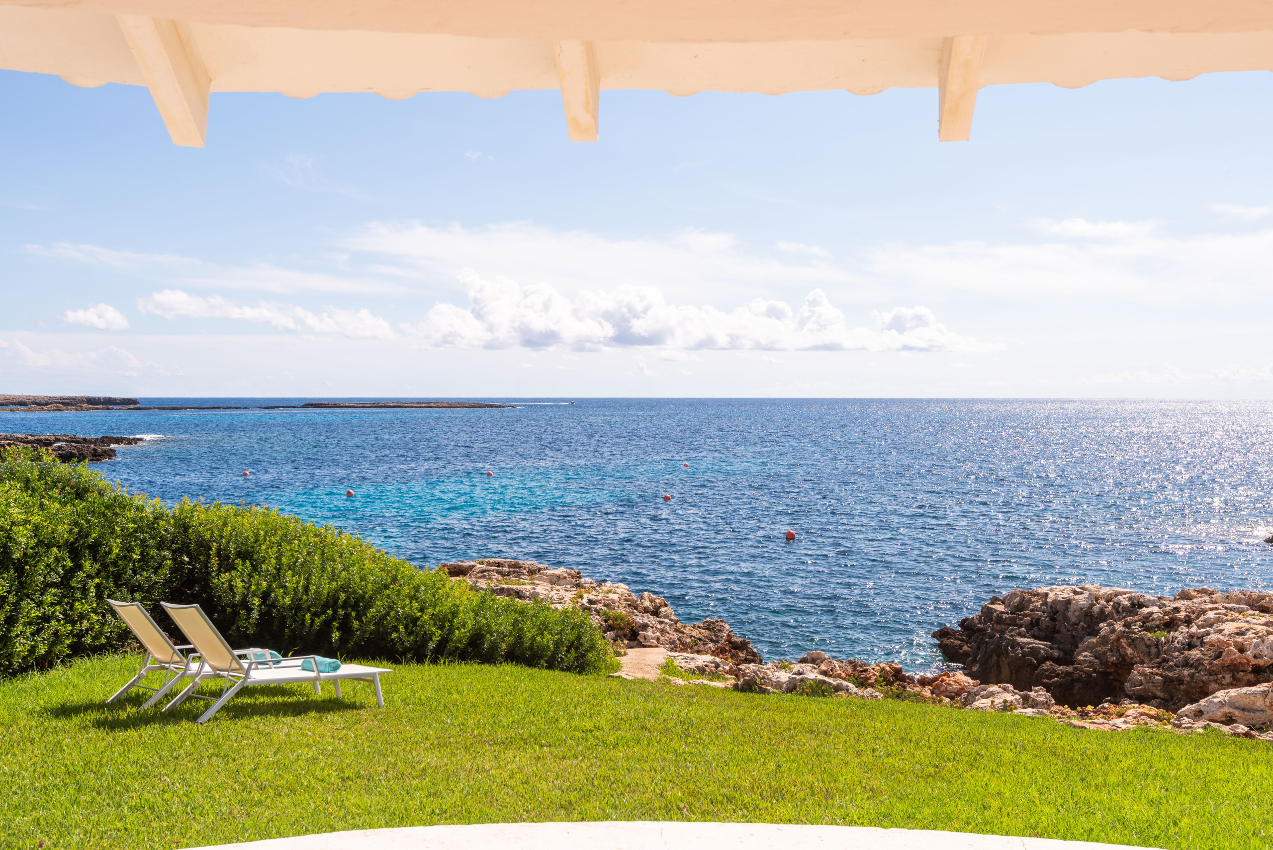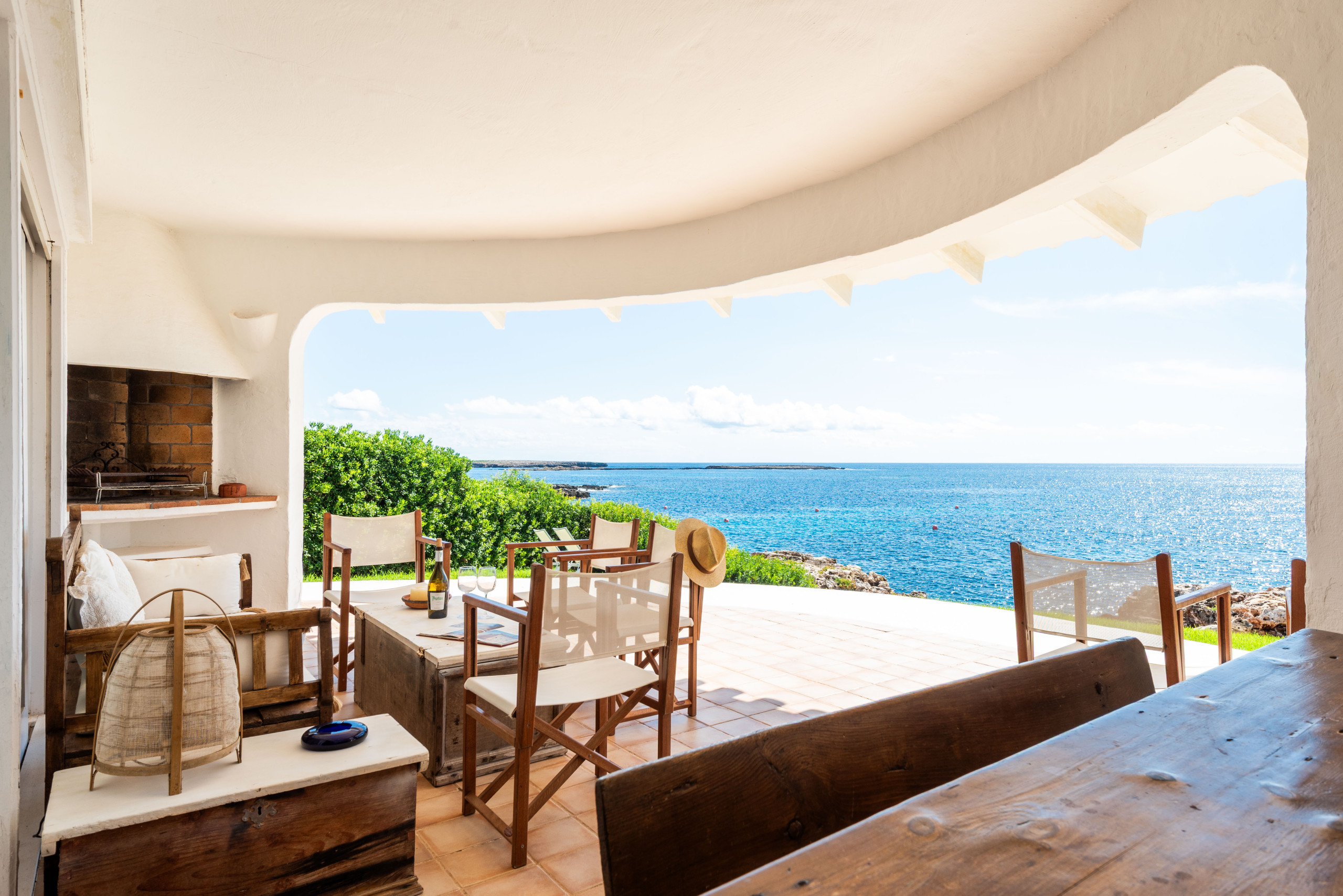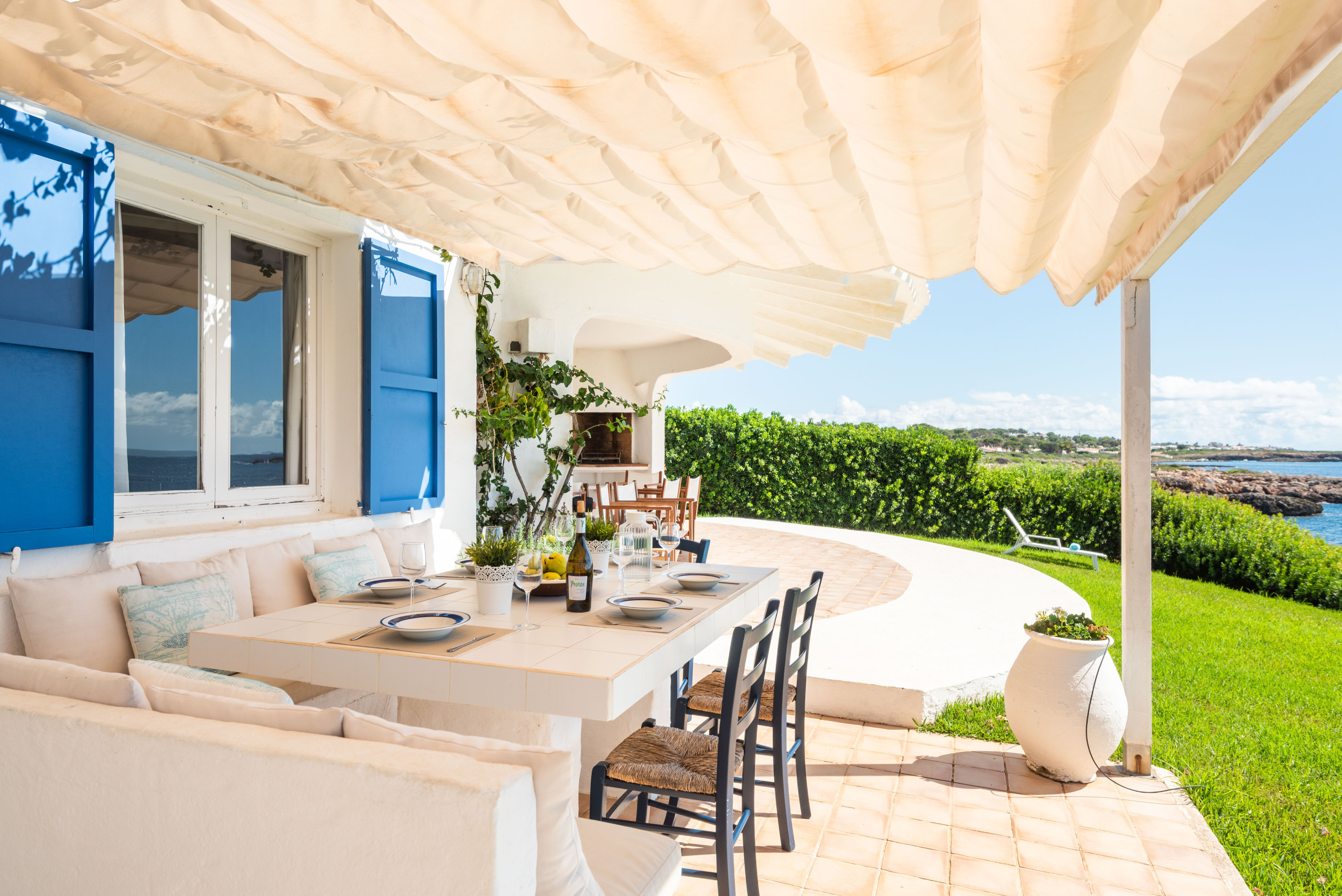 Le jardin a de l'herbe jusqu'aux rochers qui donnent sur la mer, où il est possible d'accéder aux eaux cristallines par quelques escaliers. Il y a deux grandes terrasses couvertes, avec un canapé, des chaises et une table pour manger ou se détendre. Depuis elles, on peut profiter de magnifiques vues sur la mer ouverte.