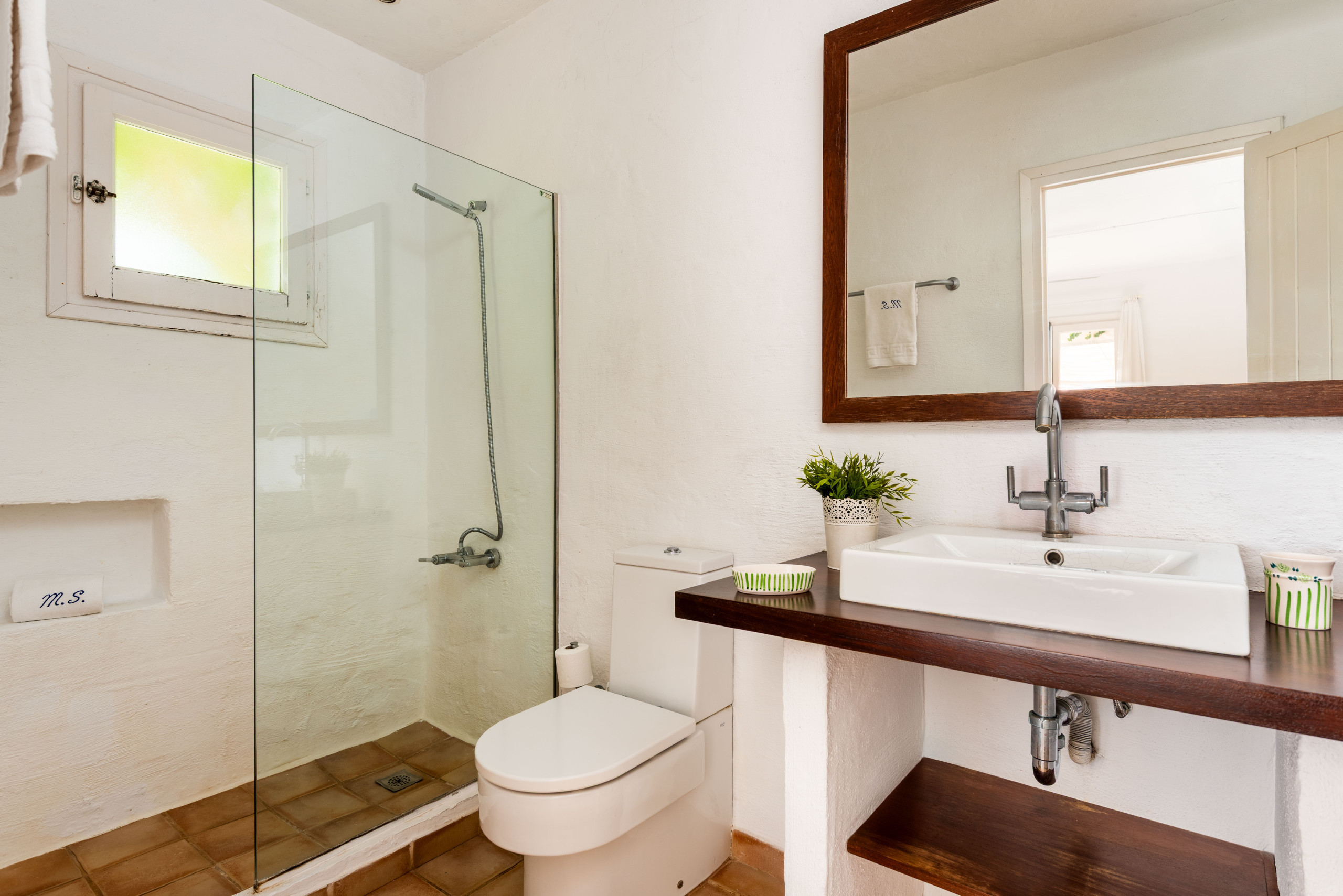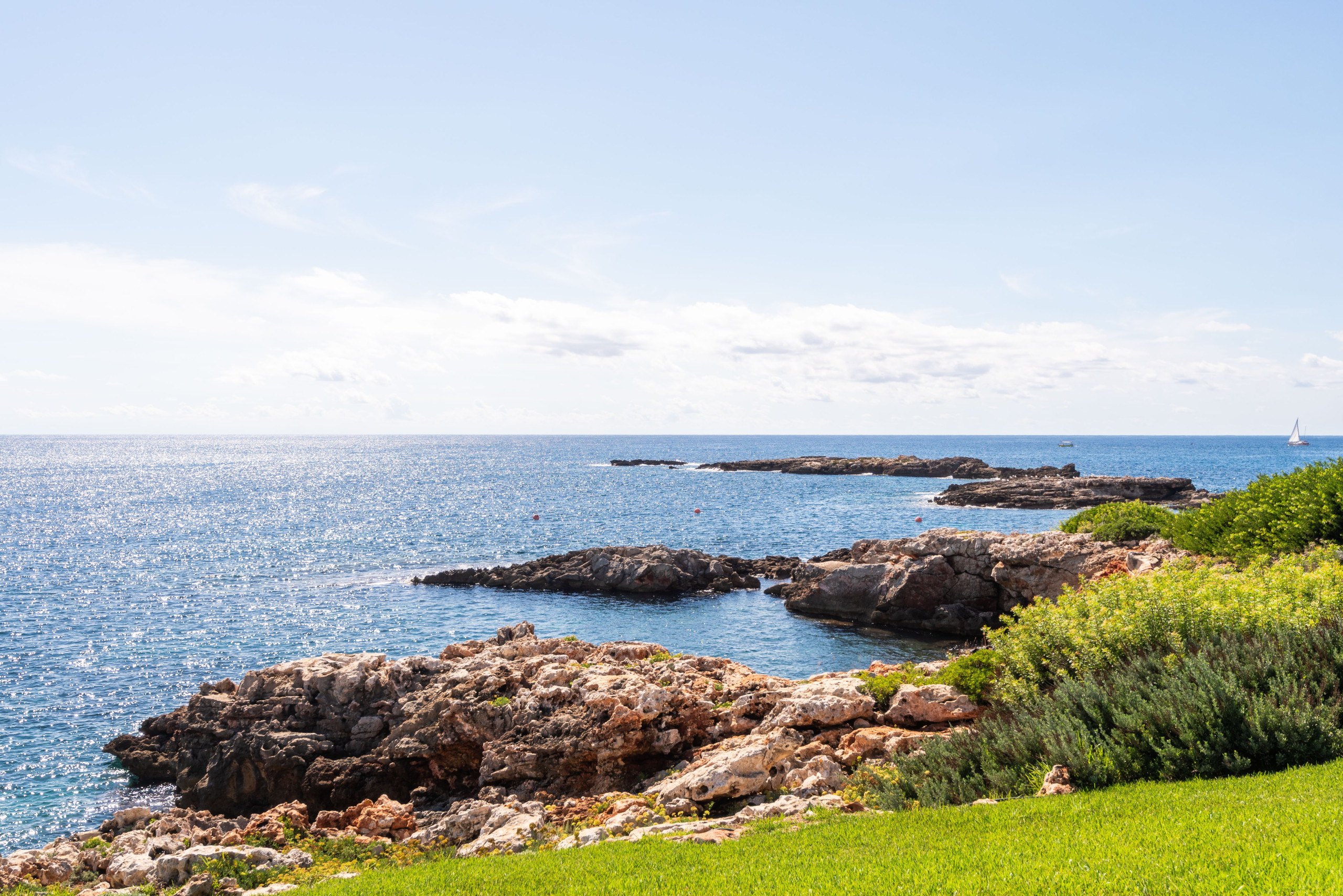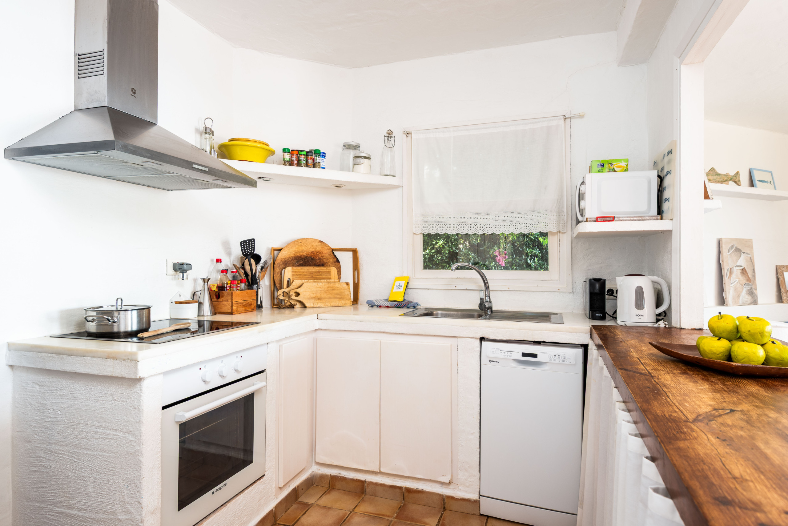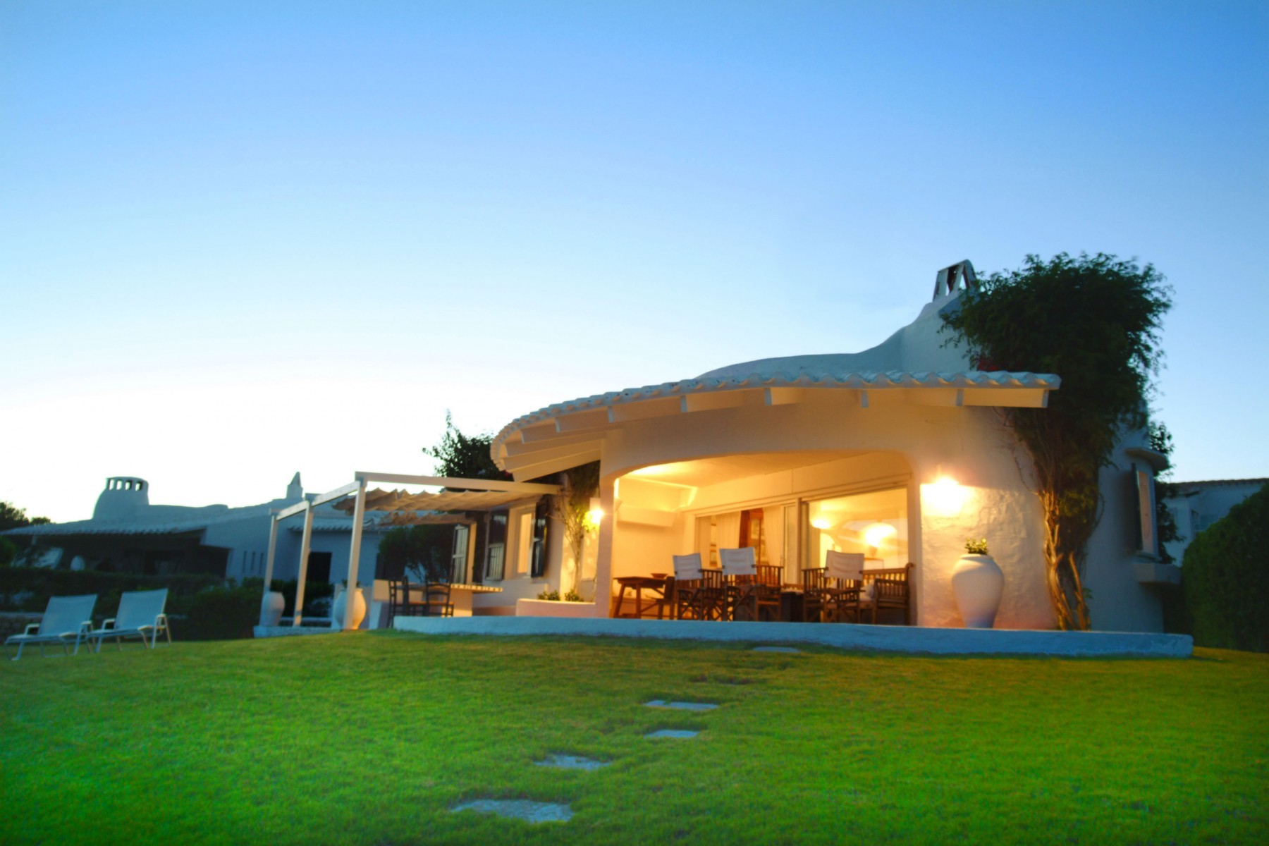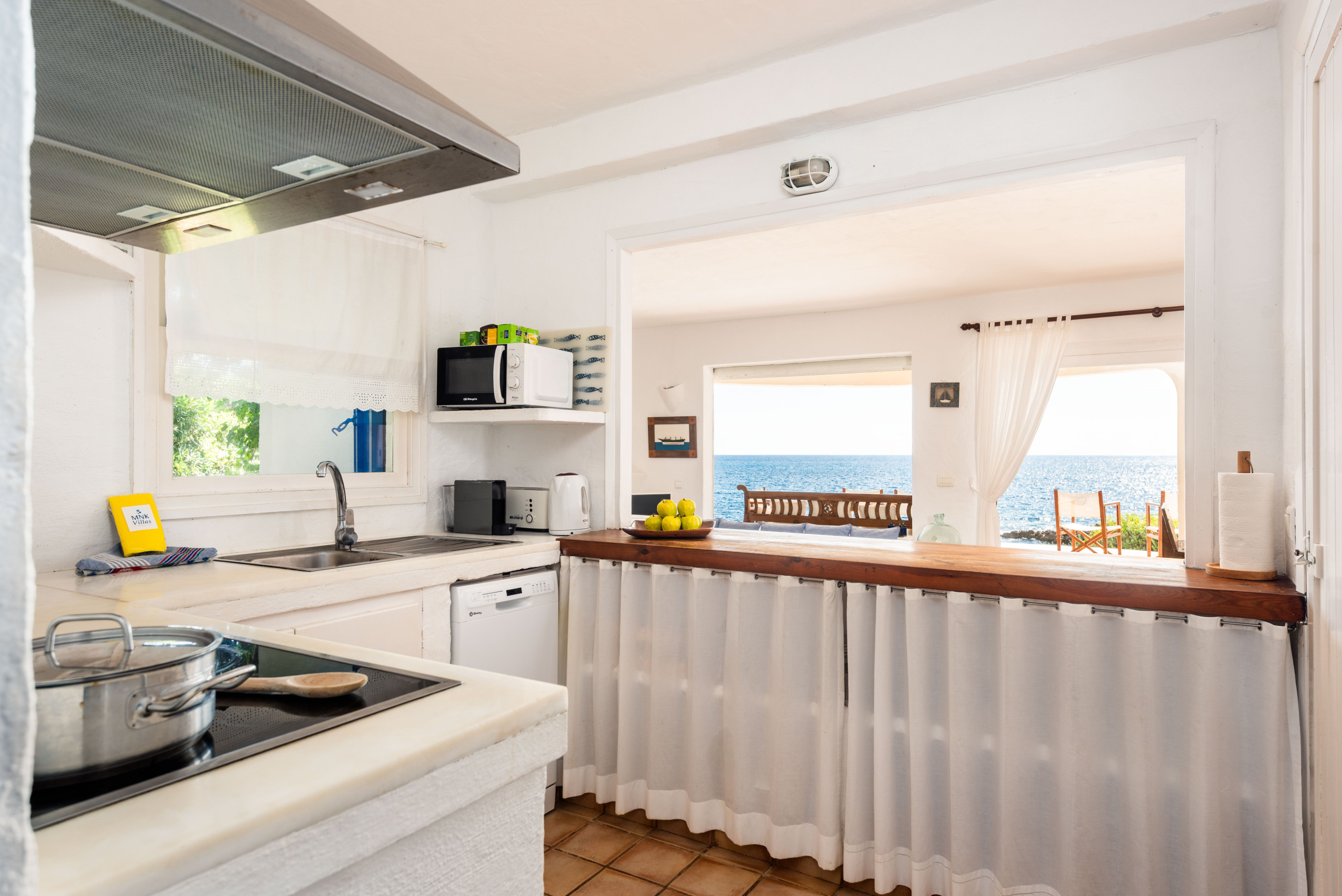 Le jardin a de l'herbe jusqu'aux rochers qui donnent sur la mer, où il est possible d'accéder aux eaux cristallines par quelques escaliers. Il y a deux grandes terrasses couvertes, avec un canapé, des chaises et une table pour manger ou se détendre. Depuis elles, on peut profiter de magnifiques vues sur la mer ouverte.
