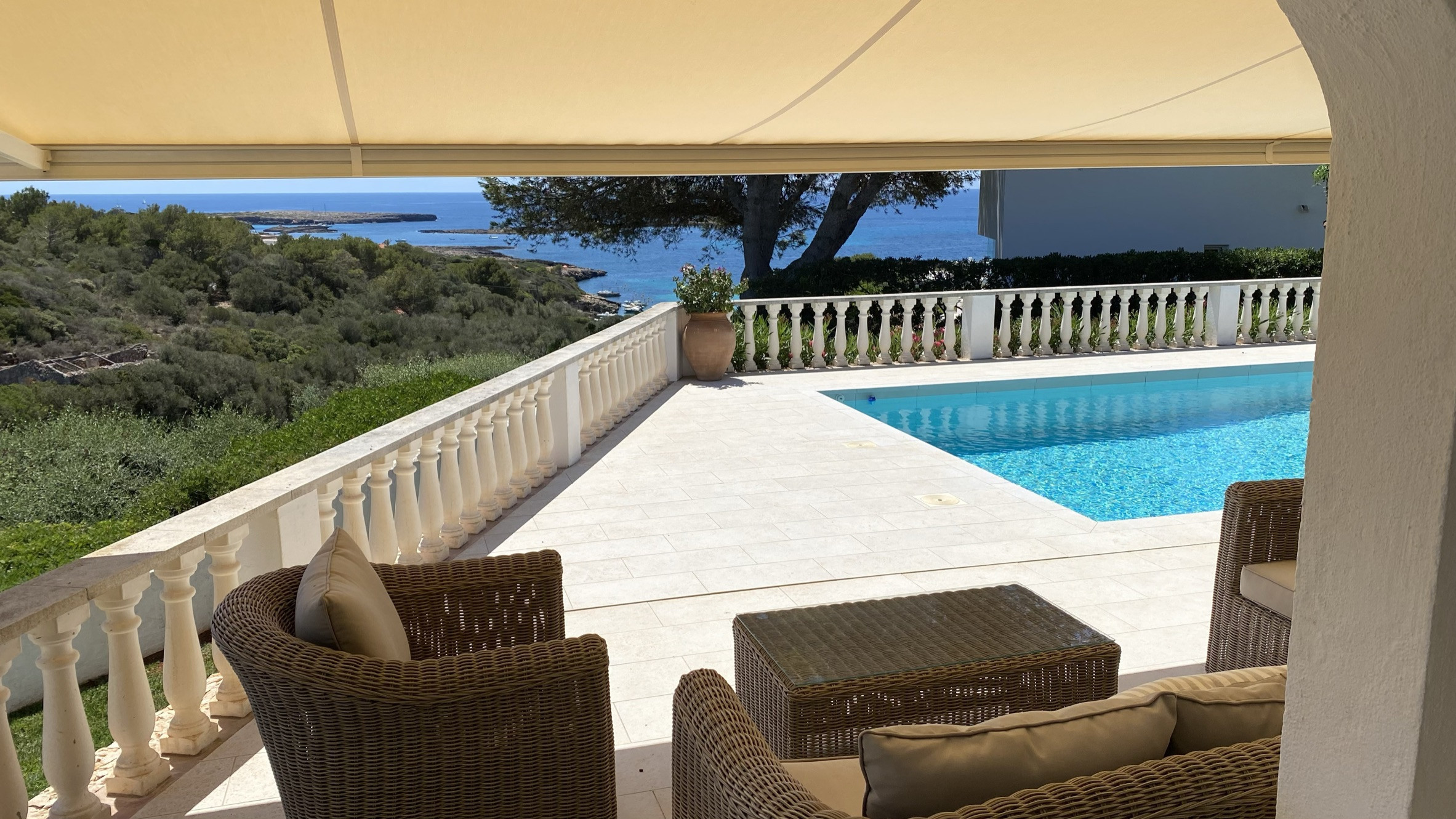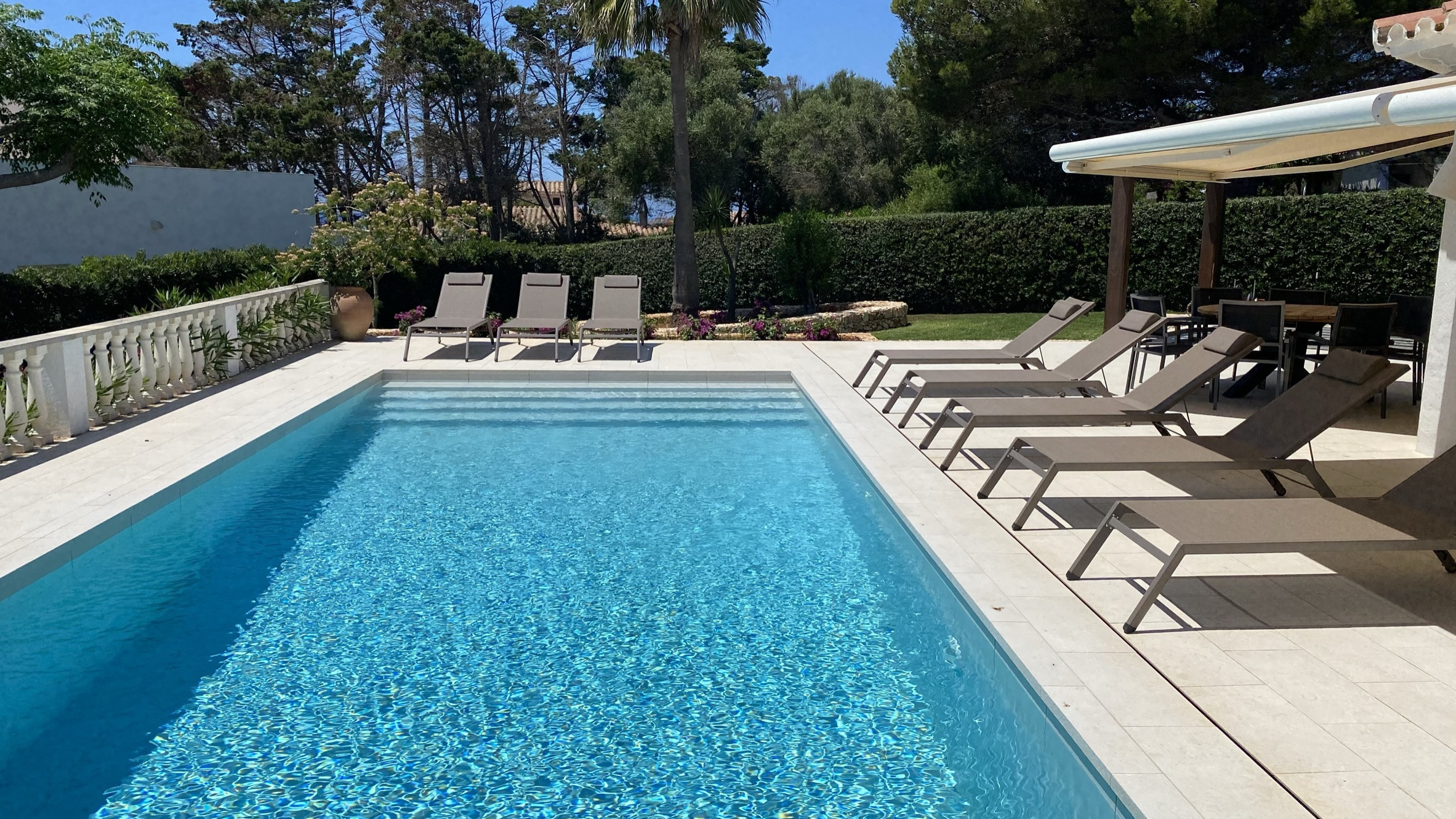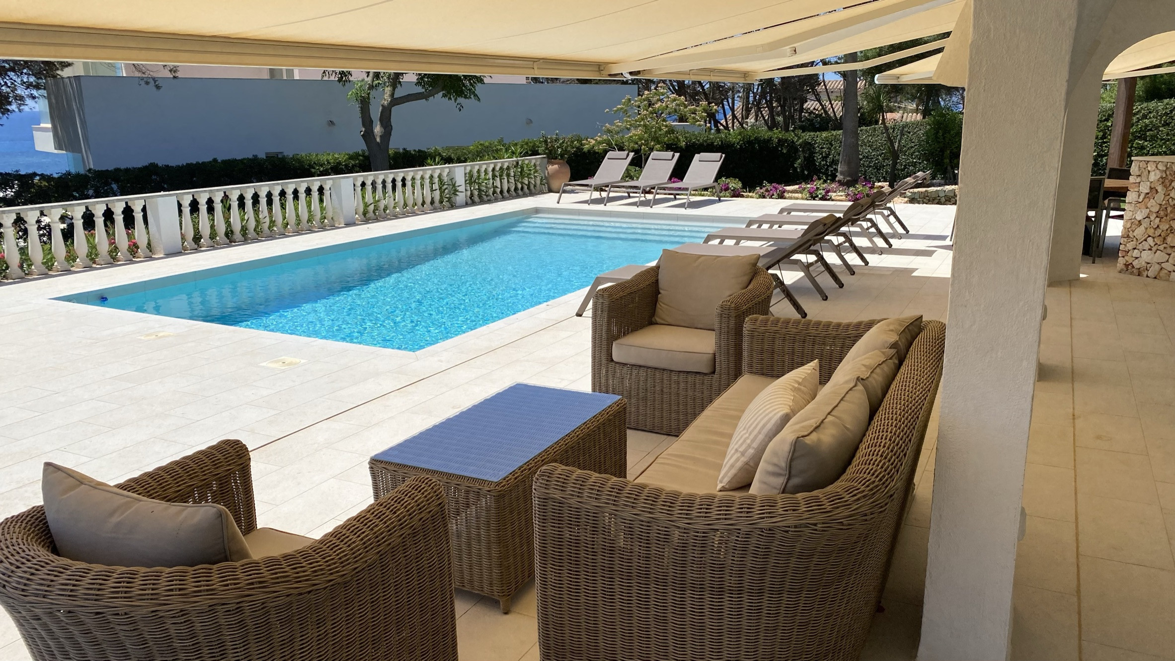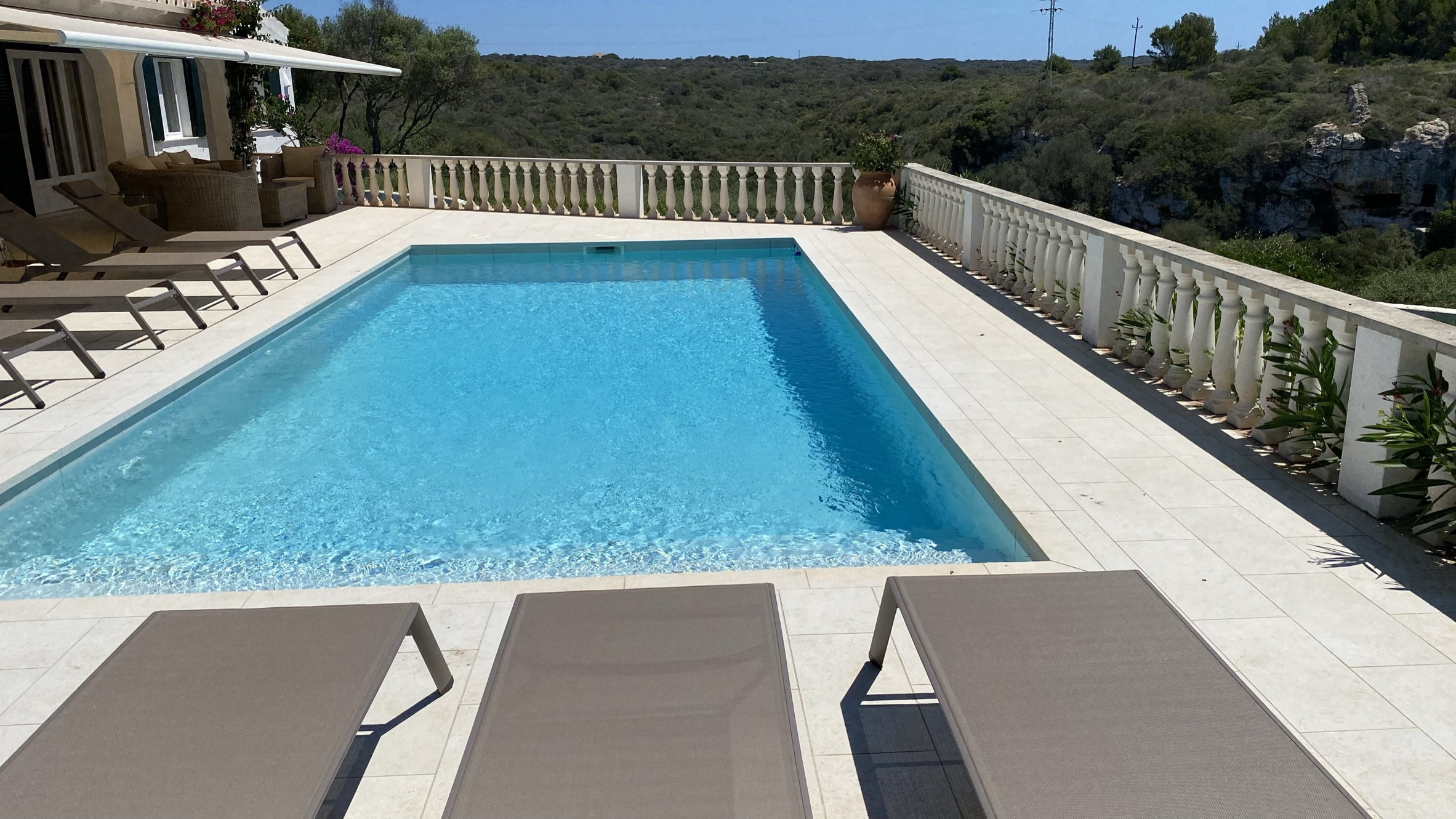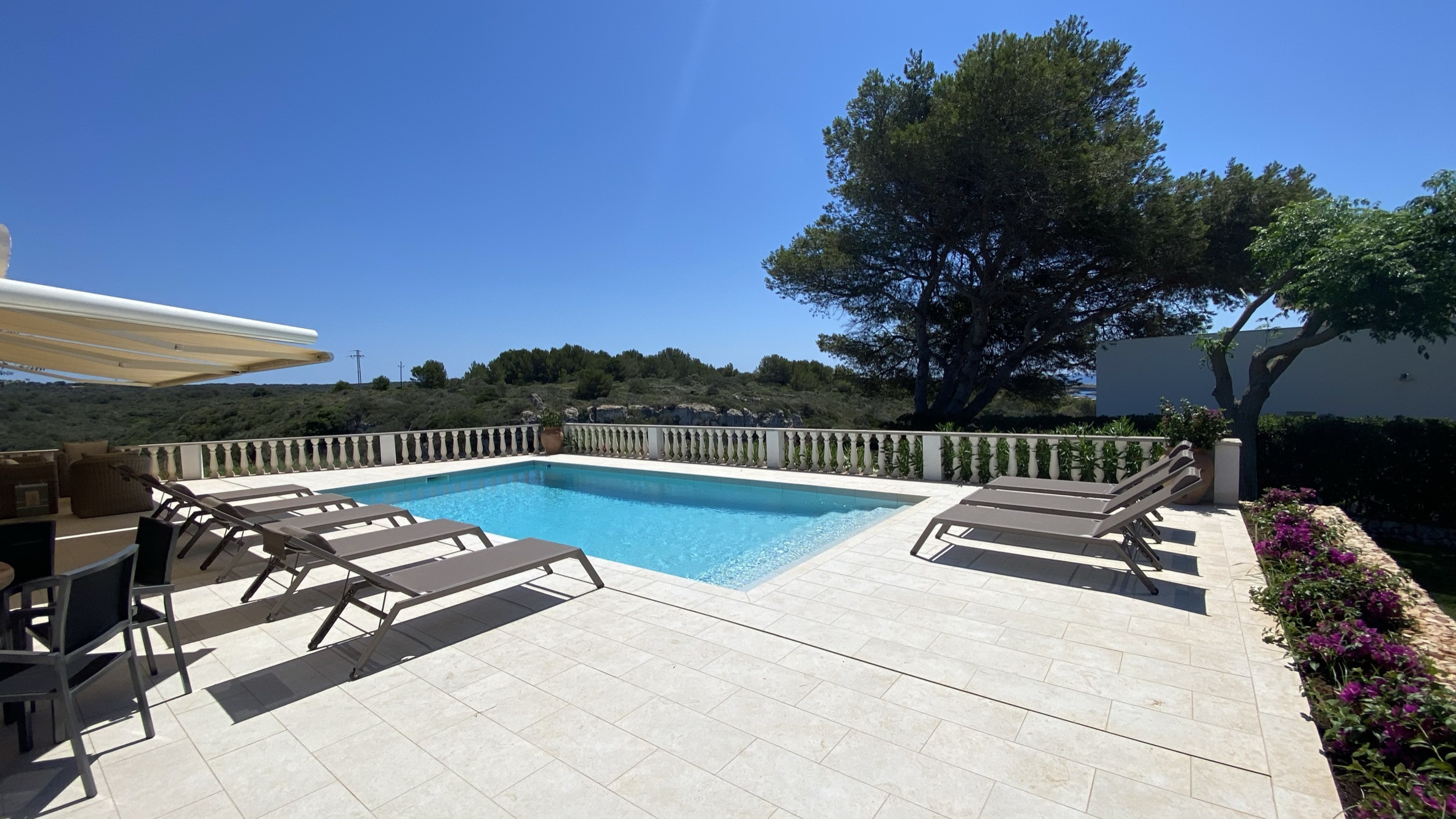 La propriété offre de belles vues sur la mer depuis la terrasse et la terrasse de la piscine. Sous la terrasse, et à côté d'une pergola avec table et chaises, se trouve une petite cuisine américaine avec un barbecue en maçonnerie pour manger en plein air. La partie basse du jardin dispose d'une grande zone de pelouse idéale pour les enfants.