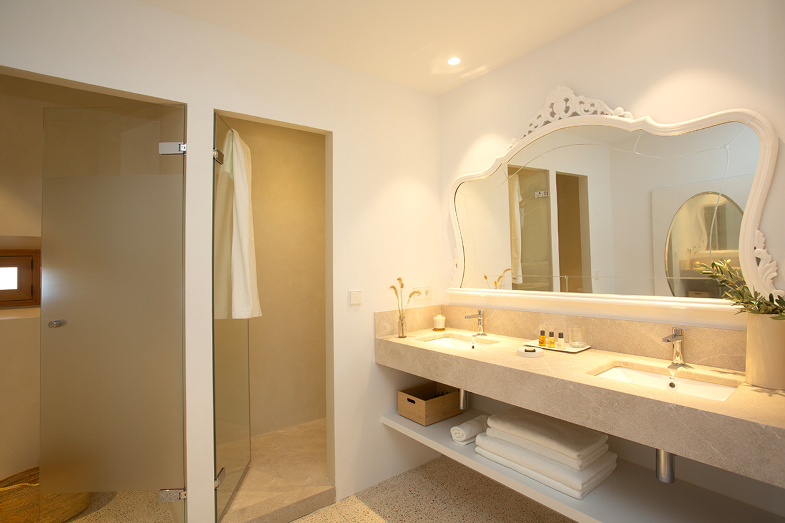 La maison principale de 700 m² offre 6 chambres, toutes avec salle de bain attenante : 3 chambres avec deux lits individuels et 3 chambres avec lit de mariage, toutes climatisées. Le rez-de-chaussée abrite le salon principal, la salle à manger, la cuisine entièrement équipée et deux chambres. Le premier étage comprend les quatre chambres restantes et un salon. La cuisine est pourvue de tout le nécessaire pour cuisiner confortablement, y compris des réfrigérateurs, des fours, un micro-ondes et une plaque vitrocéramique, et la zone de buanderie dispose d'un lave-linge, d'un sèche-linge, d'un fer à repasser et d'une planche à repasser. Sur demande, 2 lits de bébé et 2 chaises hautes sont fournis (supplément de 10 €/nuit).