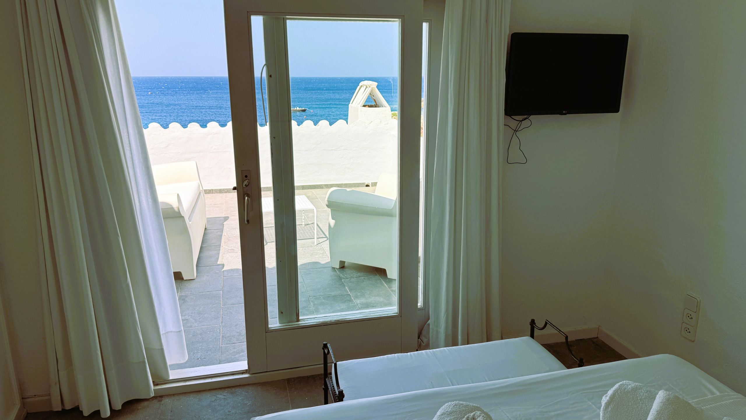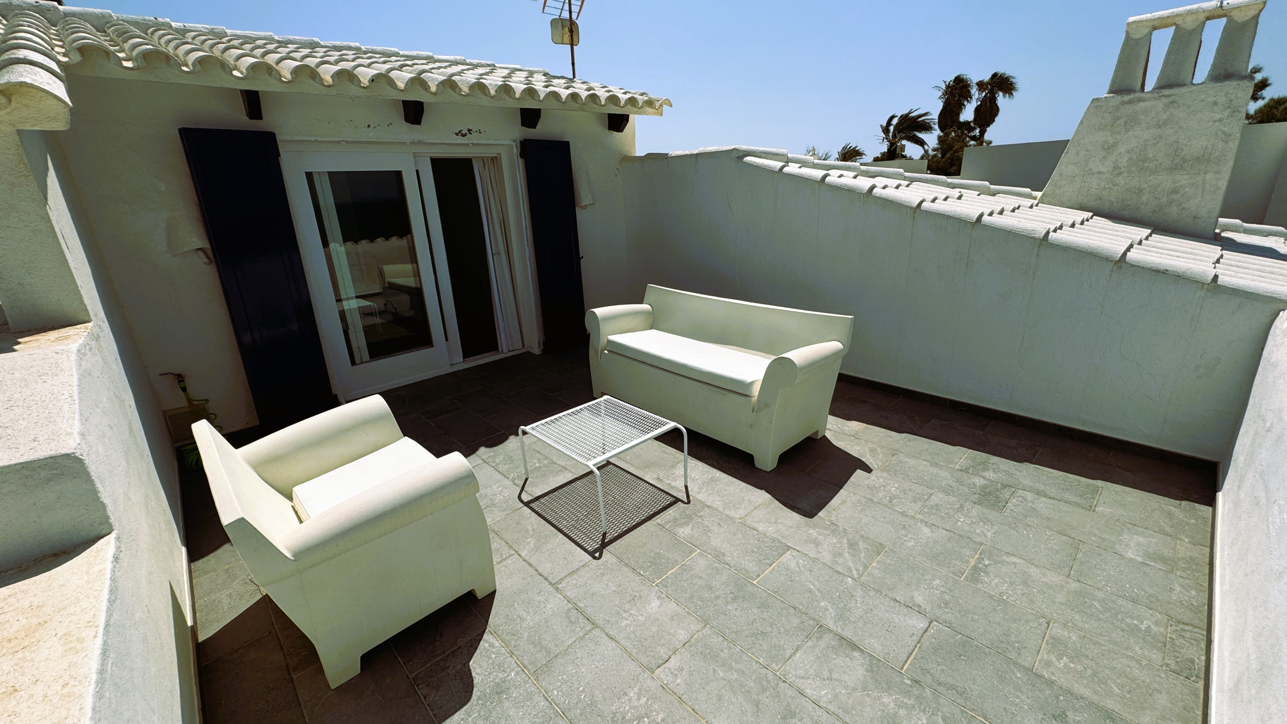 Avec un accès par un escalier extérieur, au premier étage, se trouve une grande terrasse avec vue, équipée de canapés en maçonnerie, de transats et d'une petite table de petit-déjeuner.