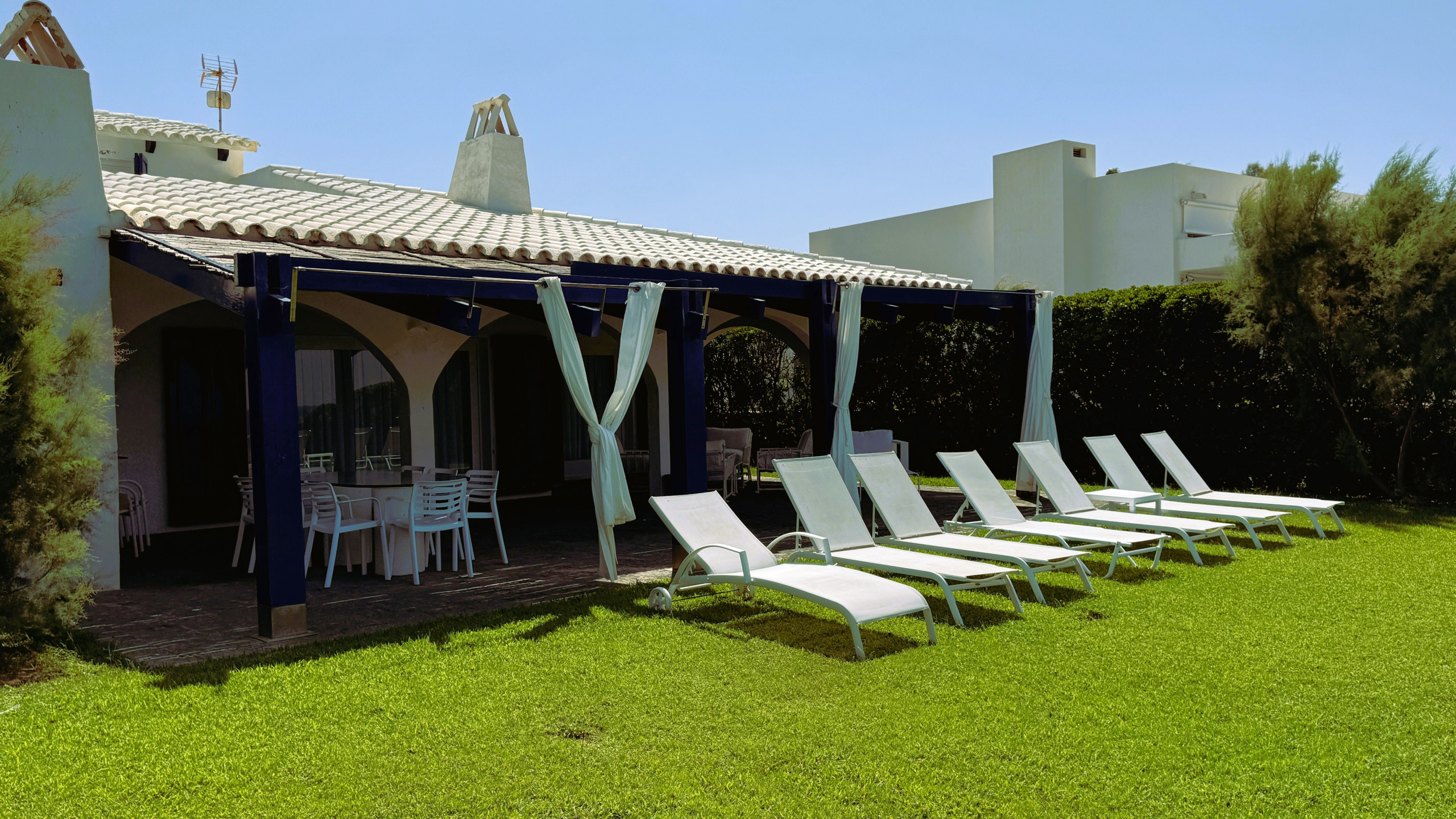 La maison dispose d'une grande piscine (eau salée), d'une zone enherbée et bénéficie d'une vue magnifique sur la mer et le coucher de soleil. La terrasse est équipée d'une table et de chaises pour manger à l'ombre, ainsi que de sofas extérieurs en maçonnerie. Depuis le jardin, on peut descendre jusqu'à la mer. Sur un côté de la maison se trouve la barbecue en maçonnerie, avec une table de barbecue et un évier pour faire la vaisselle.