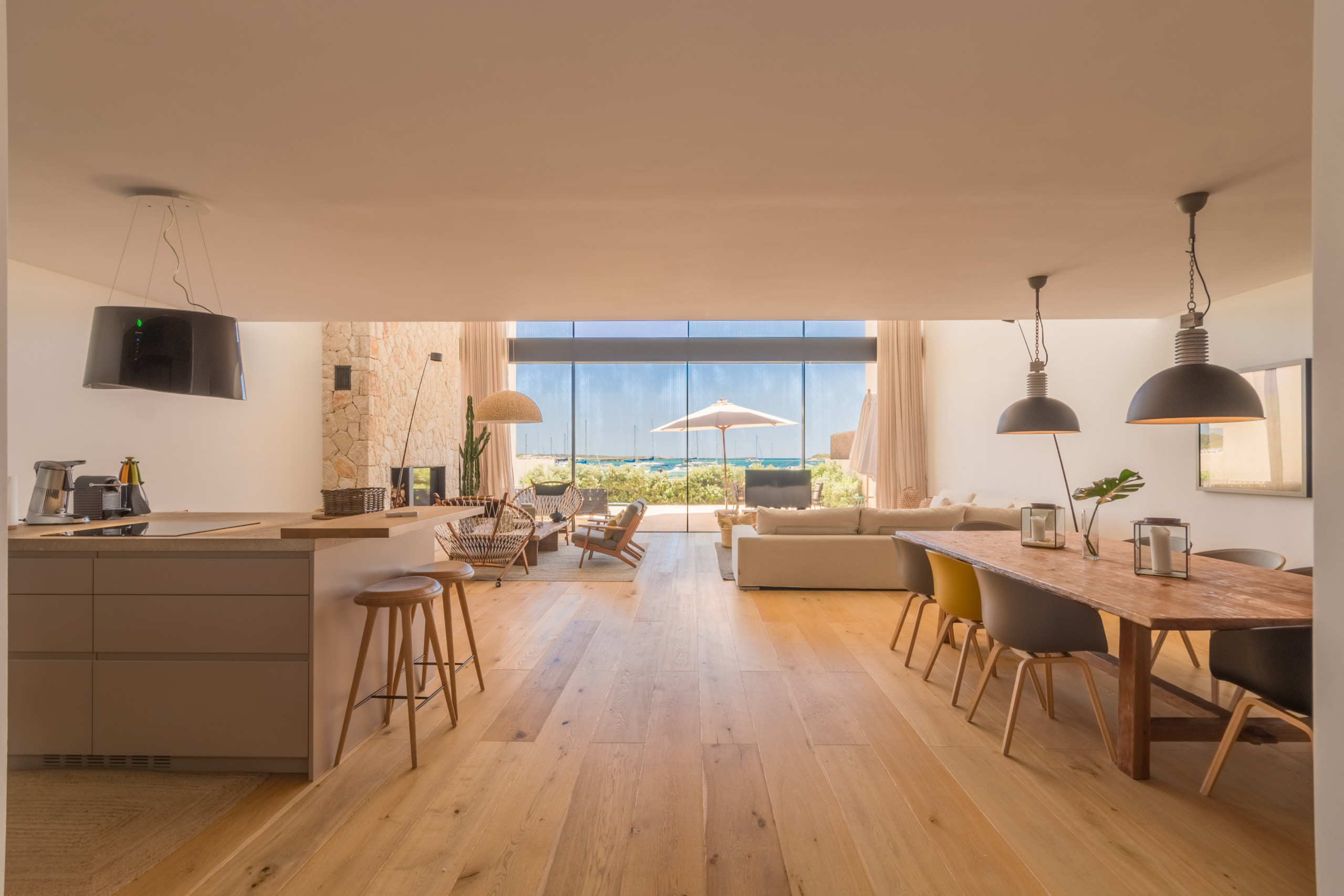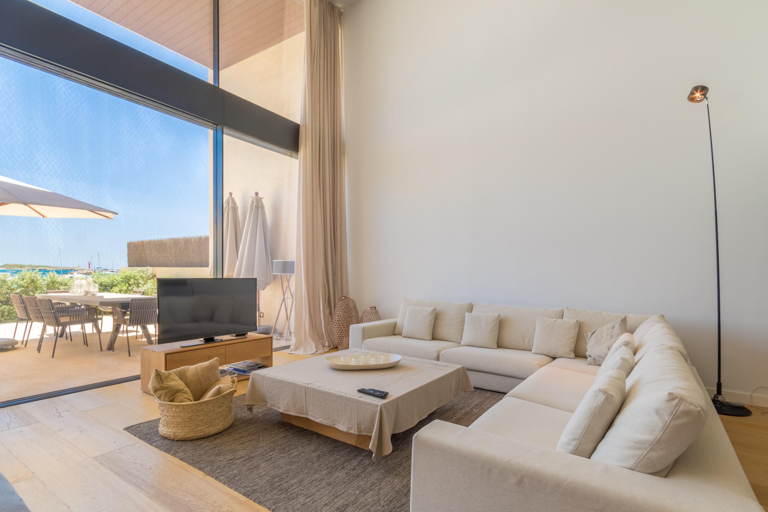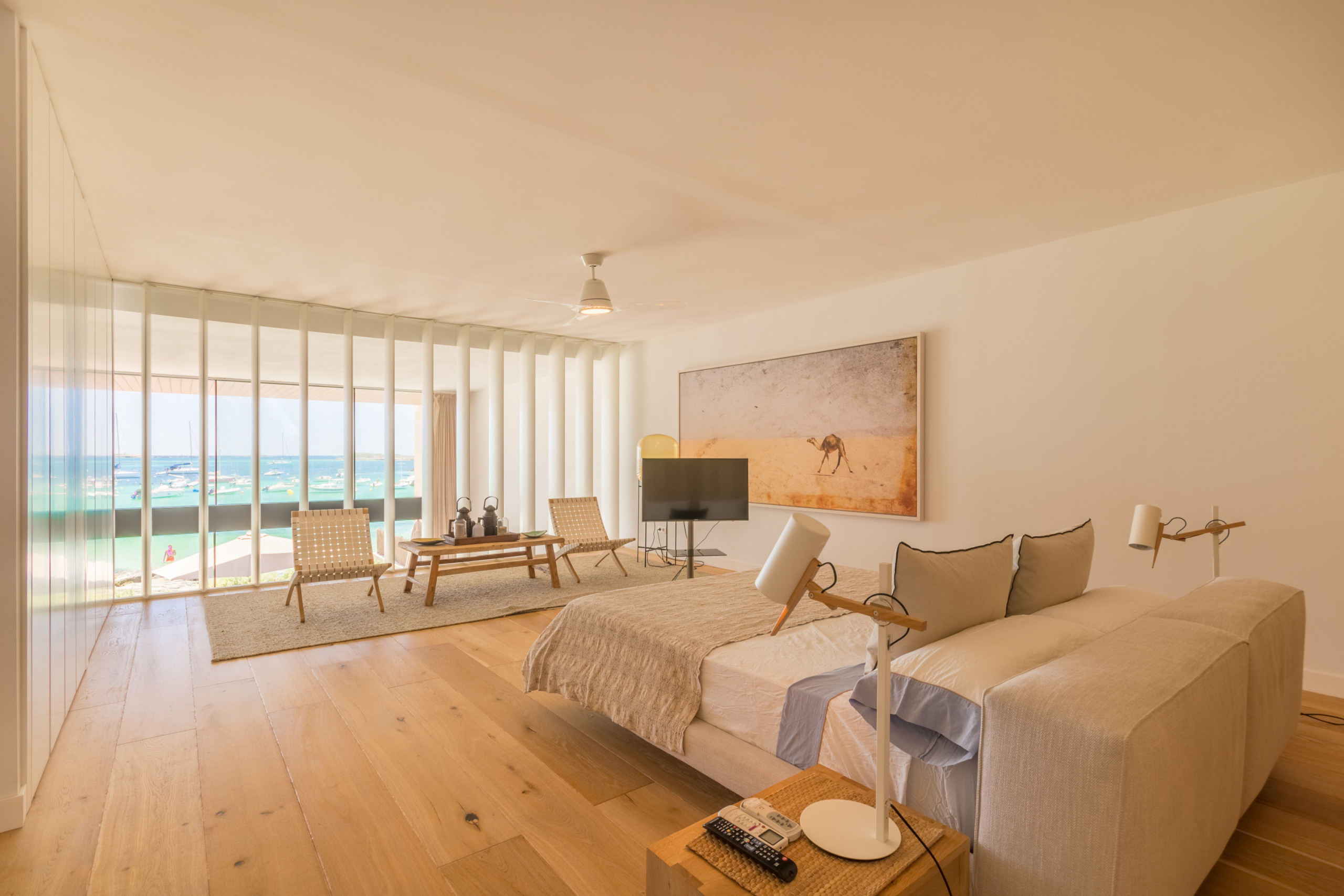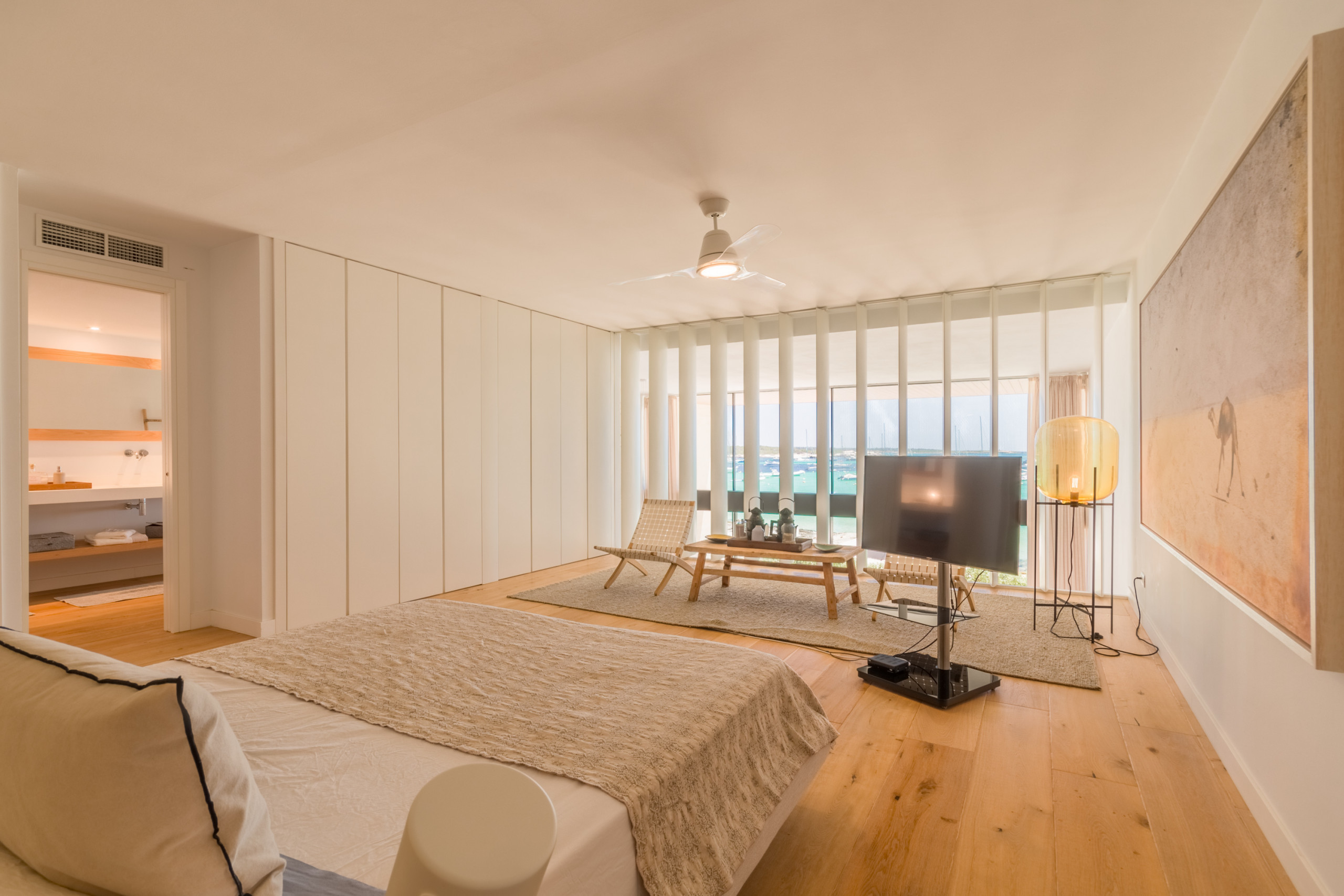 Pouvant accueillir jusqu'à 8 invités, dont 1 bébé, la villa dispose de 4 chambres doubles spacieuses, chacune avec sa propre salle de bain privative pour une intimité totale. Répartis sur 2 étages, les intérieurs sont définis par des tons neutres, des matériaux naturels et une lumière abondante, créant une atmosphère chaleureuse et sophistiquée. L'espace de vie ouvert se connecte à une cuisine moderne entièrement équipée et s'étend sur une terrasse meublée lumineuse avec vue sur la mer. La chambre principale se distingue par une baignoire îlot surplombant la Méditerranée, tandis que les autres chambres offrent confort et individualité. Les équipements comprennent la climatisation, le chauffage au sol, une cheminée, la télévision internationale, le WiFi, un coffre-fort et des installations de buanderie. À l'extérieur, les invités profitent d'une terrasse privée clôturée, d'un balcon et d'un accès direct à la plage.