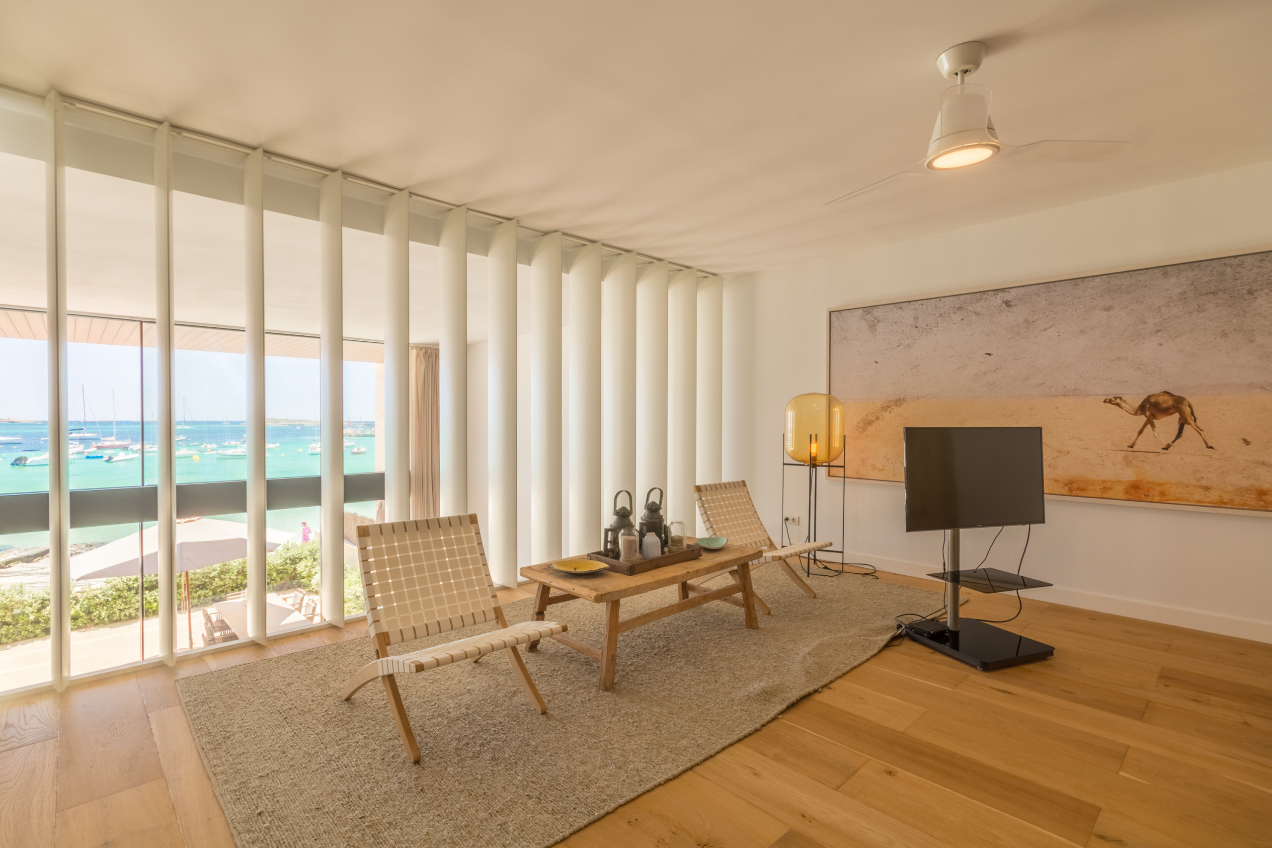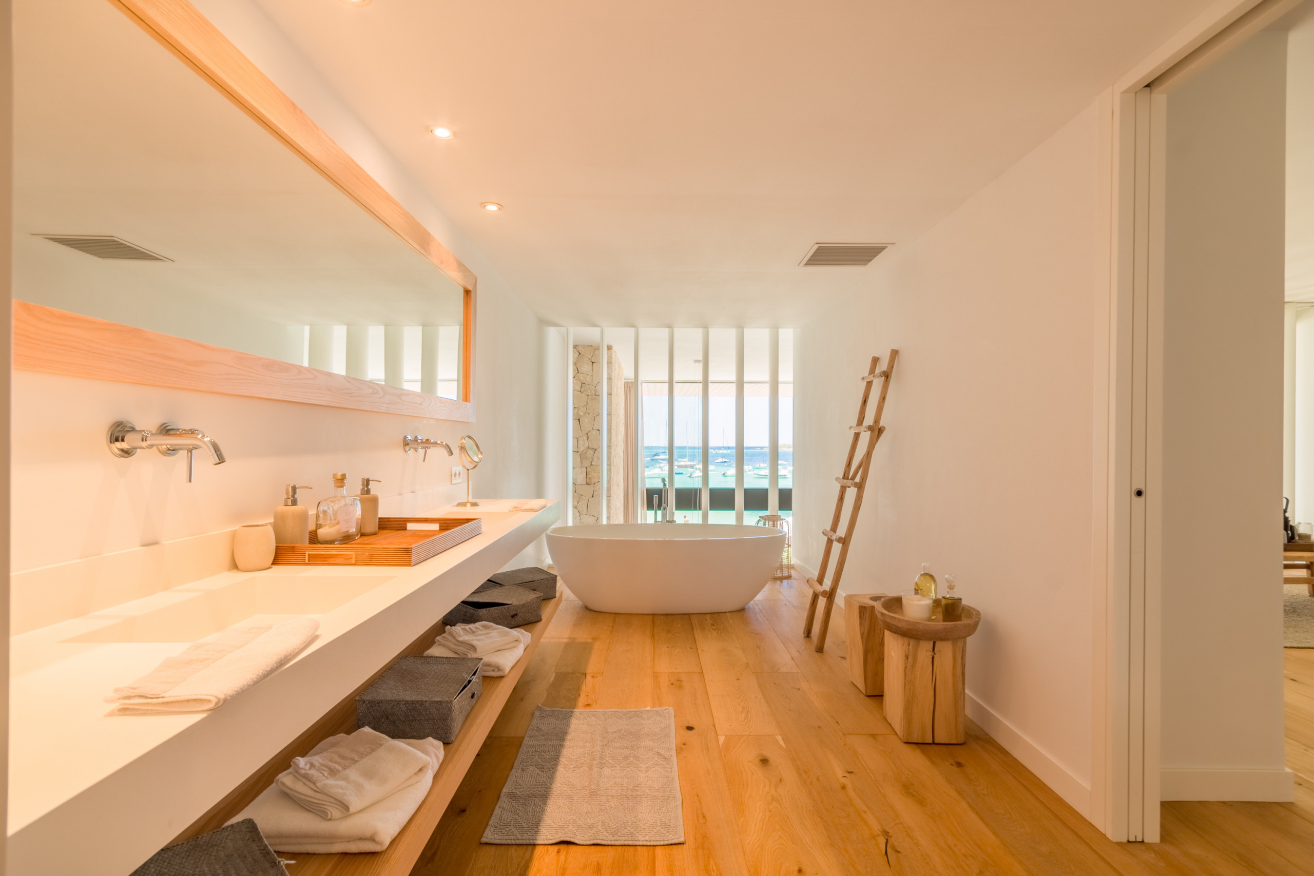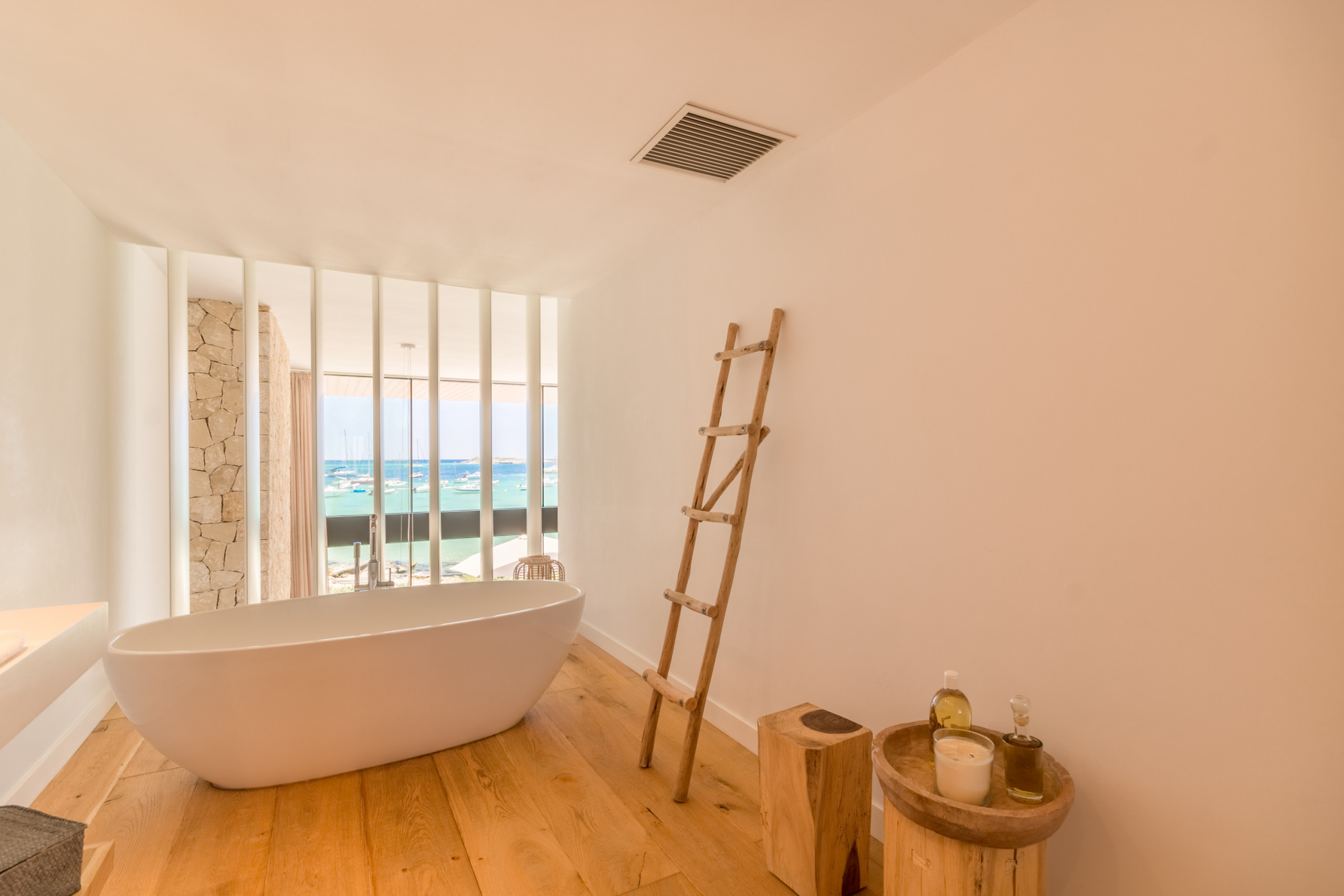 Pouvant accueillir jusqu'à 8 invités, dont 1 bébé, la villa dispose de 4 chambres doubles spacieuses, chacune avec sa propre salle de bain privative pour une intimité totale. Répartis sur 2 étages, les intérieurs sont définis par des tons neutres, des matériaux naturels et une lumière abondante, créant une atmosphère chaleureuse et sophistiquée. L'espace de vie ouvert se connecte à une cuisine moderne entièrement équipée et s'étend sur une terrasse meublée lumineuse avec vue sur la mer. La chambre principale se distingue par une baignoire îlot surplombant la Méditerranée, tandis que les autres chambres offrent confort et individualité. Les équipements comprennent la climatisation, le chauffage au sol, une cheminée, la télévision internationale, le WiFi, un coffre-fort et des installations de buanderie. À l'extérieur, les invités profitent d'une terrasse privée clôturée, d'un balcon et d'un accès direct à la plage.
