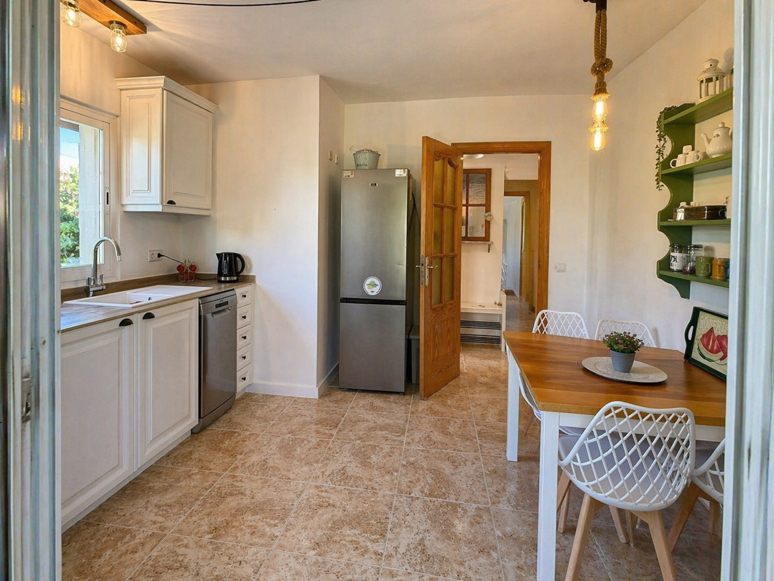 L'intérieur de la villa est décoré de manière modeste mais fonctionnelle, avec tout le nécessaire pour un séjour confortable. La cuisine est équipée d'appareils tels qu'un lave-vaisselle, un four et un micro-ondes, afin que vous puissiez facilement préparer des repas faits maison. Le salon est un espace confortable avec des canapés confortables et une télévision, parfait pour se détendre après une journée d'exploration de l'île. De plus, la villa offre le Wi-Fi, la climatisation et d'autres commodités.
