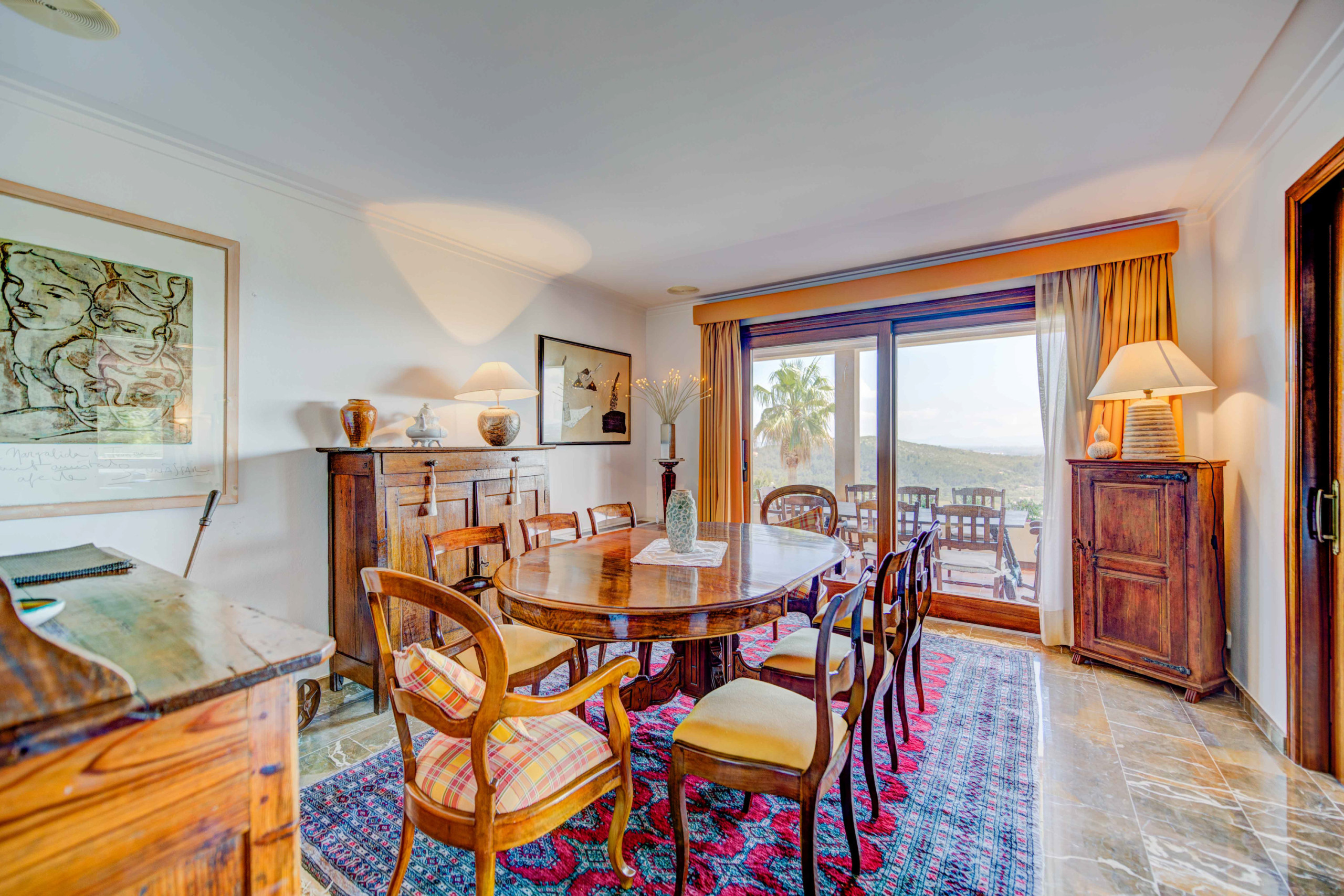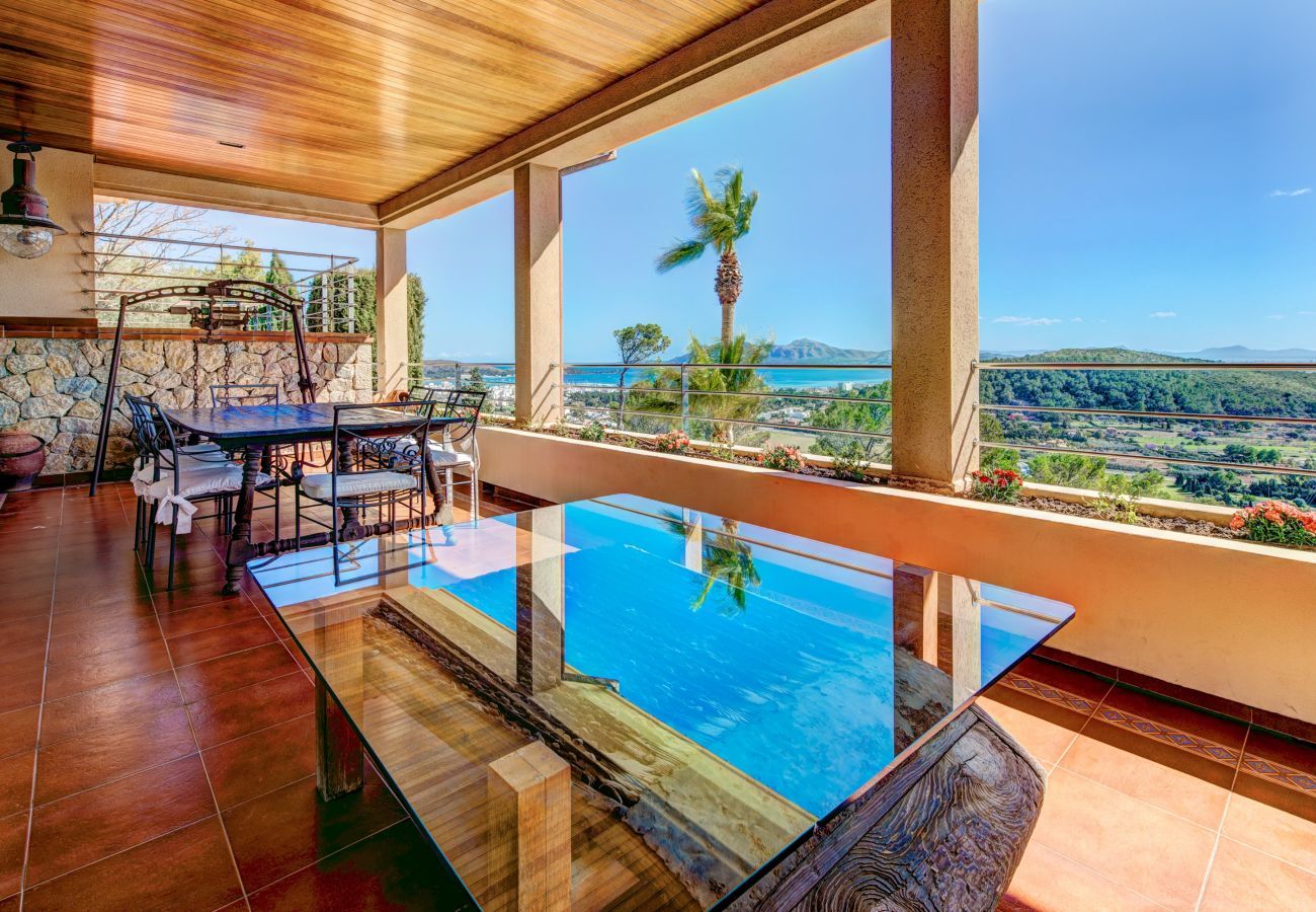 La villa offre deux cuisines entièrement équipées, dont l'une se trouve dans un grand salon avec barbecue intérieur, idéal pour les grandes réunions familiales ou entre amis. Les espaces de vie sont vastes et lumineux, avec de grandes fenêtres permettant de profiter des vues panoramiques sur la baie de Pollensa et les montagnes environnantes. Les terrasses extérieures, avec des meubles confortables et un gazebo, sont parfaites pour se détendre tout en profitant des vues spectaculaires.