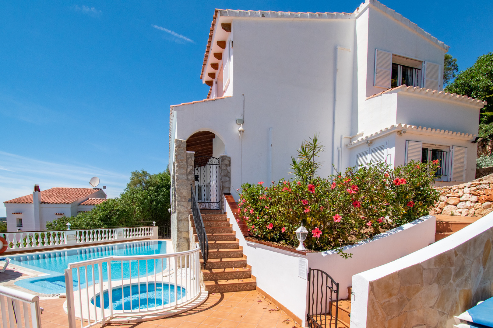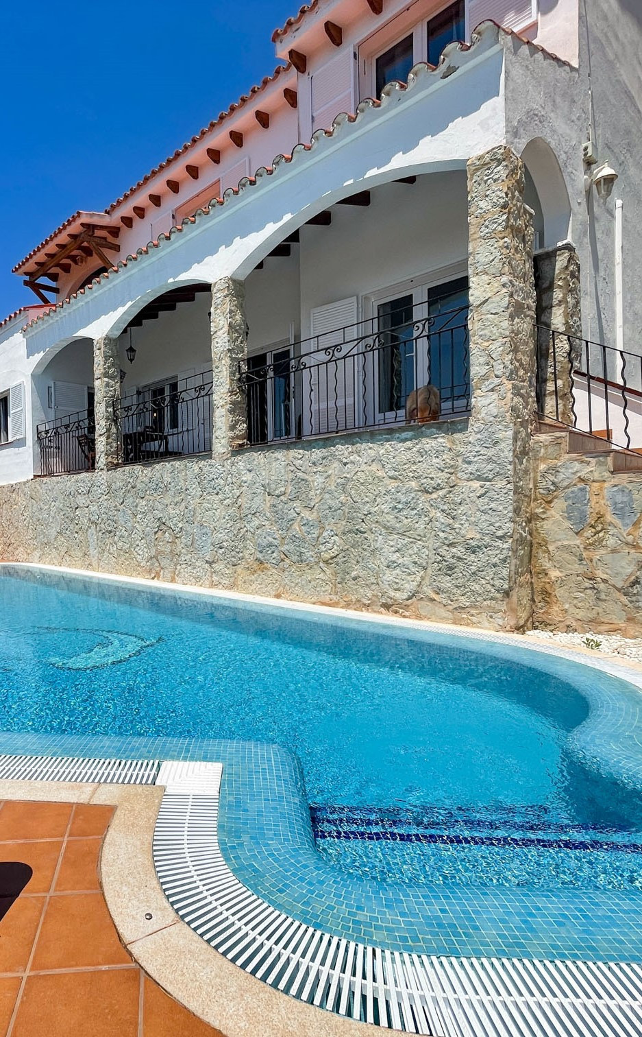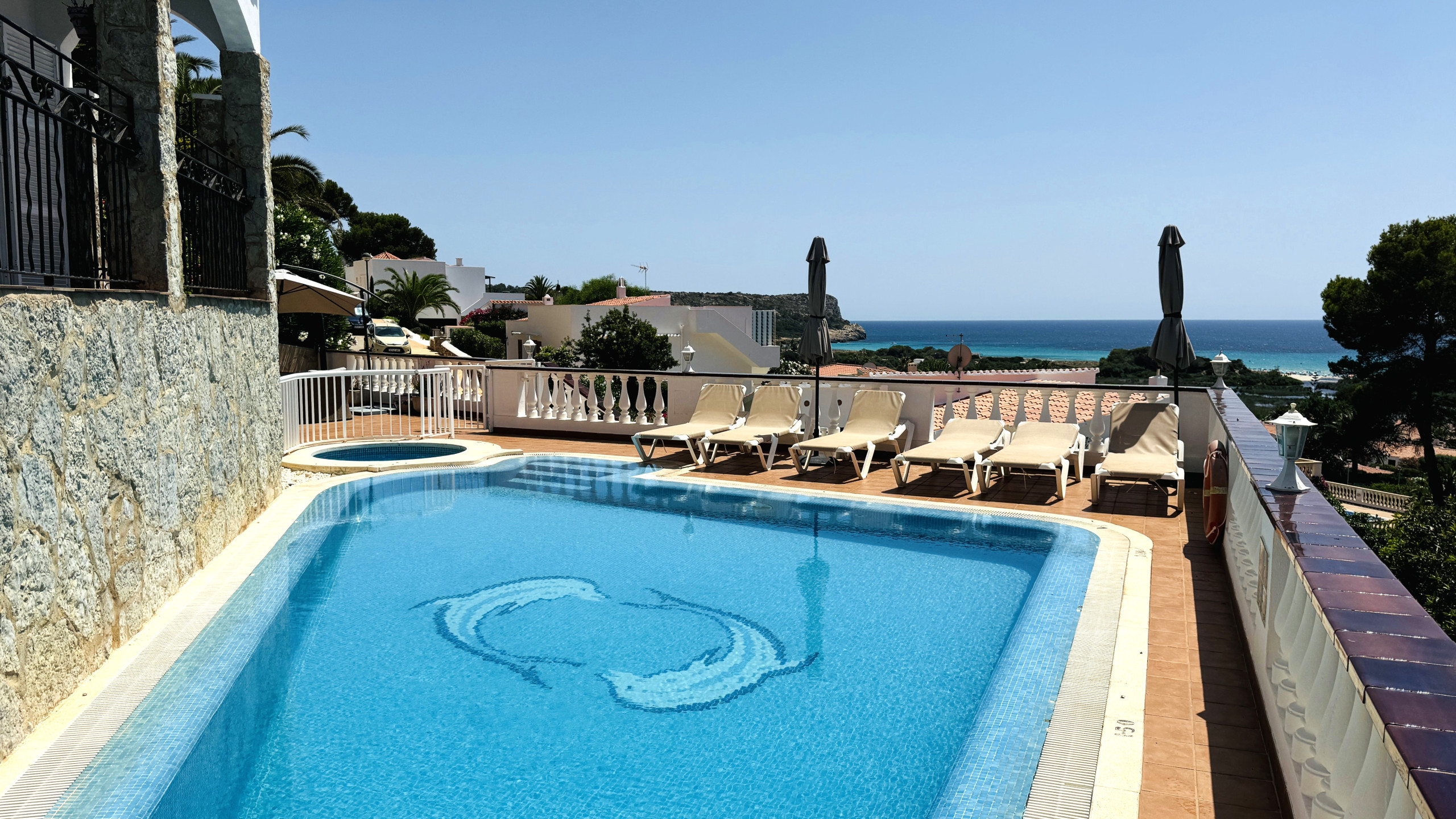 Grande villa indépendante récemment rénovée dans un endroit isolé avec de superbes vues sur la mer. Elle dispose d'une grande piscine avec escalier romain et barbecue en maçonnerie. La télévision par satellite est disponible. La climatisation est présente dans toutes les chambres, ce qui en fait une excellente option pour une escapade en famille. Située assez haut sur une colline. On peut se rendre à pied aux bars, restaurants, magasins et à la plage, mais n'oubliez pas qu'il faut monter.