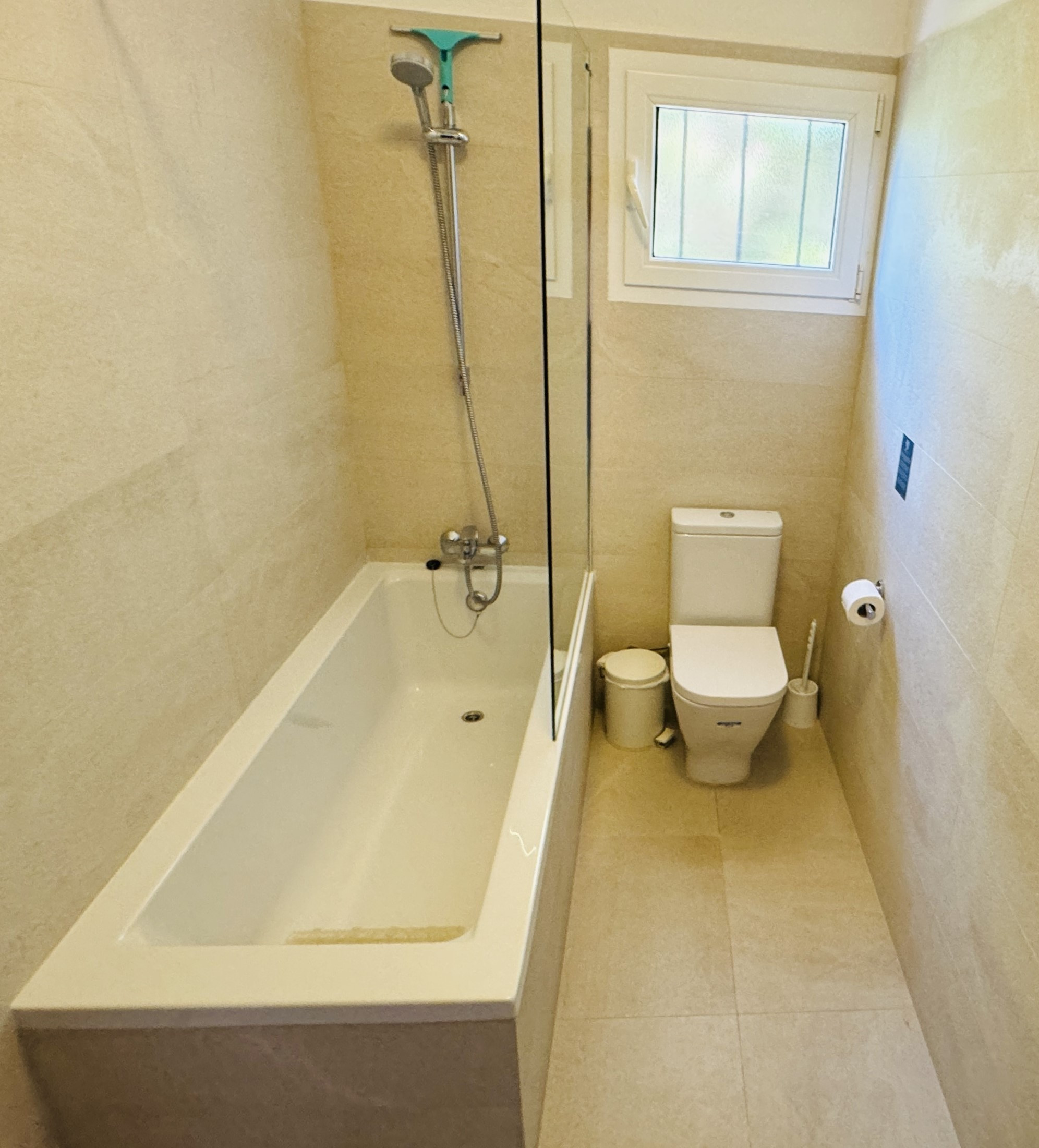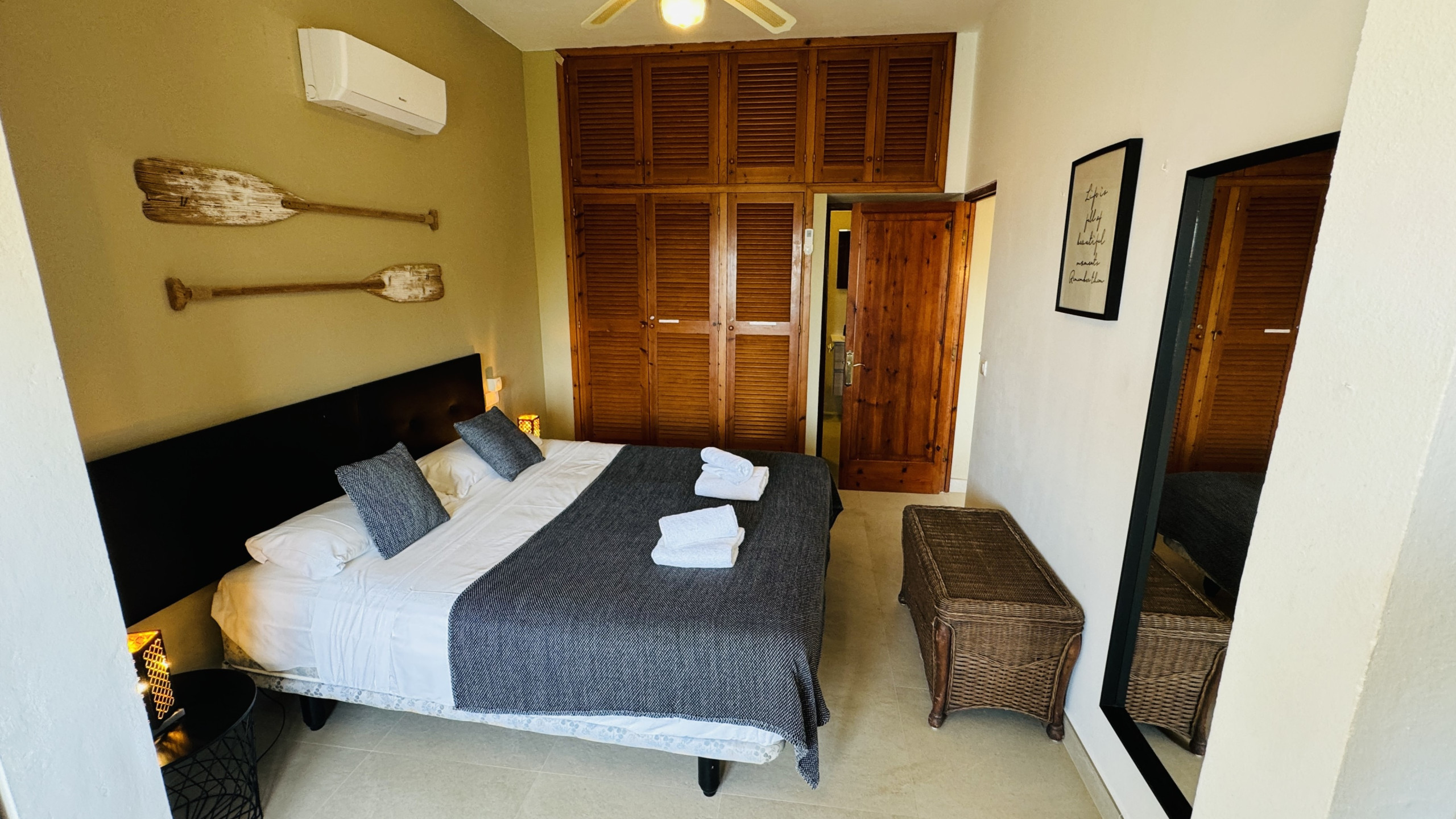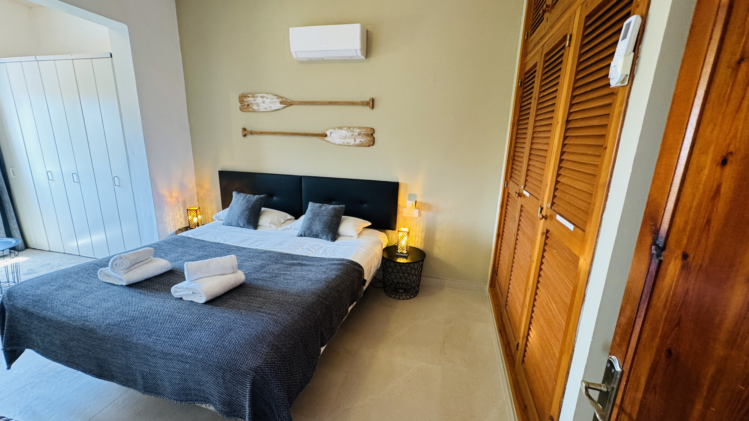 1 chambre avec lit de mariage, climatisation et salle de bain (douche) en suite.