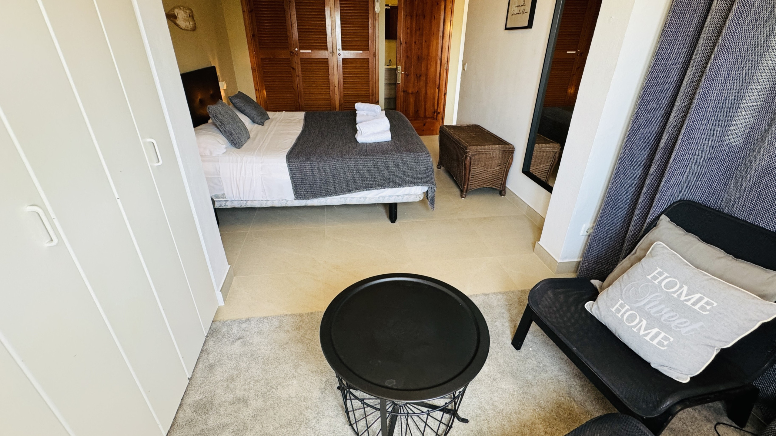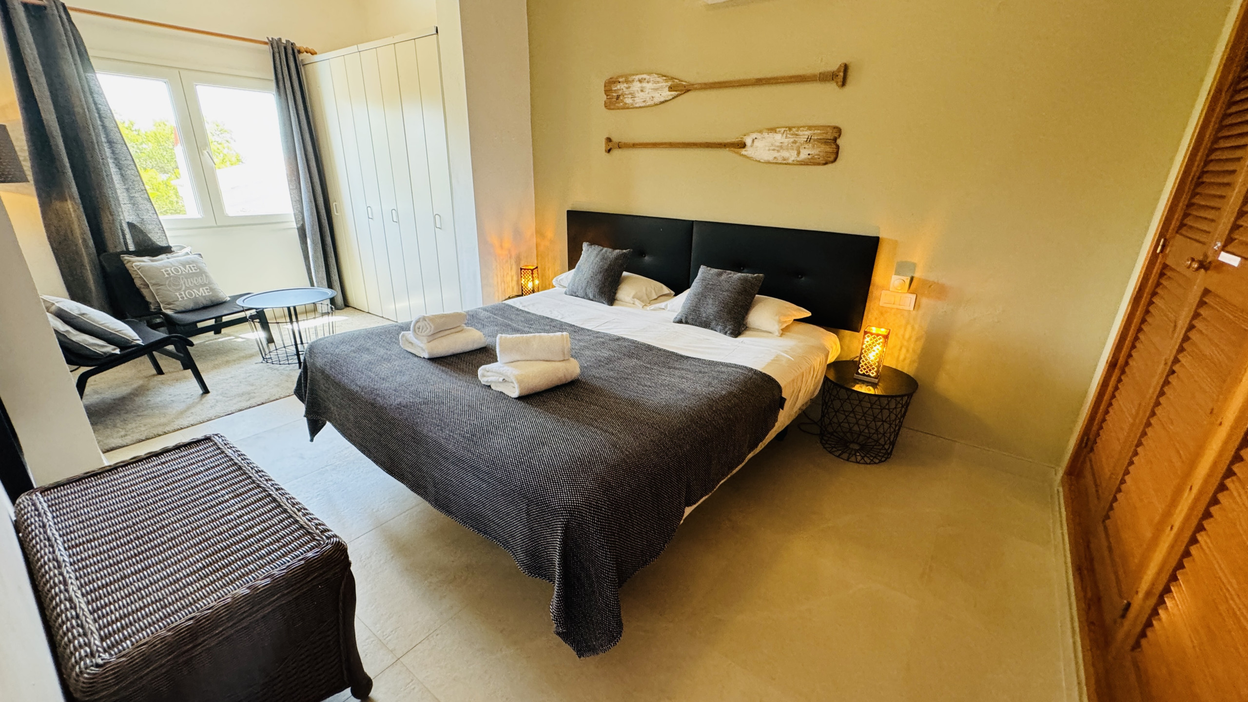 1 chambre matrimoniale (lit king-size) avec salle de bain attenante et climatisation.