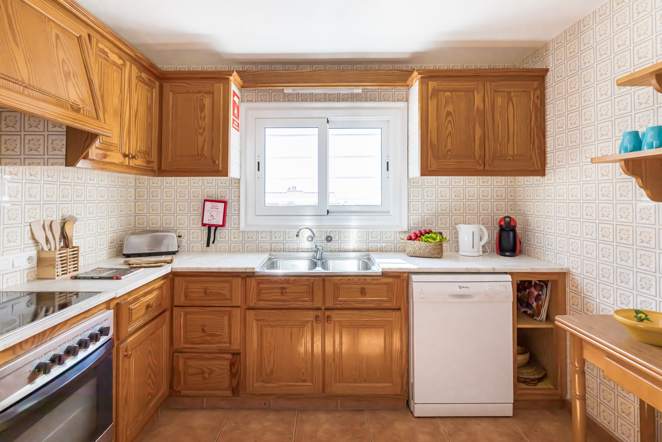 La cuisine est entièrement équipée d'appareils électroménagers modernes tels que lave-vaisselle, four, micro-ondes, cafetière et tous les ustensiles nécessaires pour préparer des repas familiaux. De plus, elle dispose d'un lave-linge et d'un congélateur pour plus de commodité.