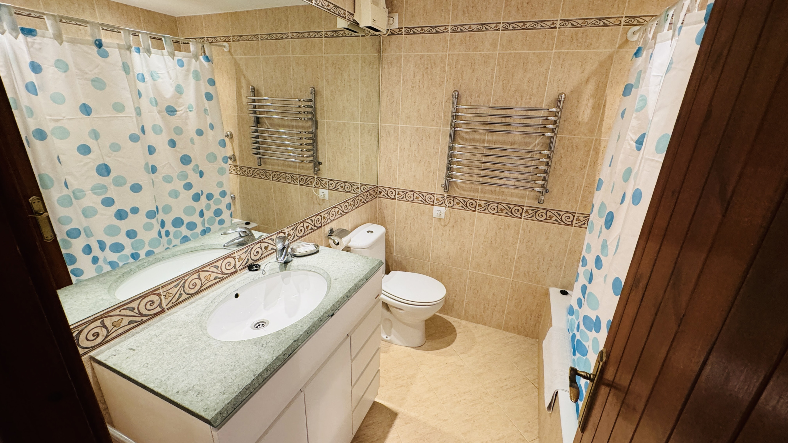 It has a washing machine, iron, internet access (wifi), hairdryer, balcony, air conditioning in all bedrooms, communal+children's swimming pool, outdoor parking, 3 fans, Television, Dvd.