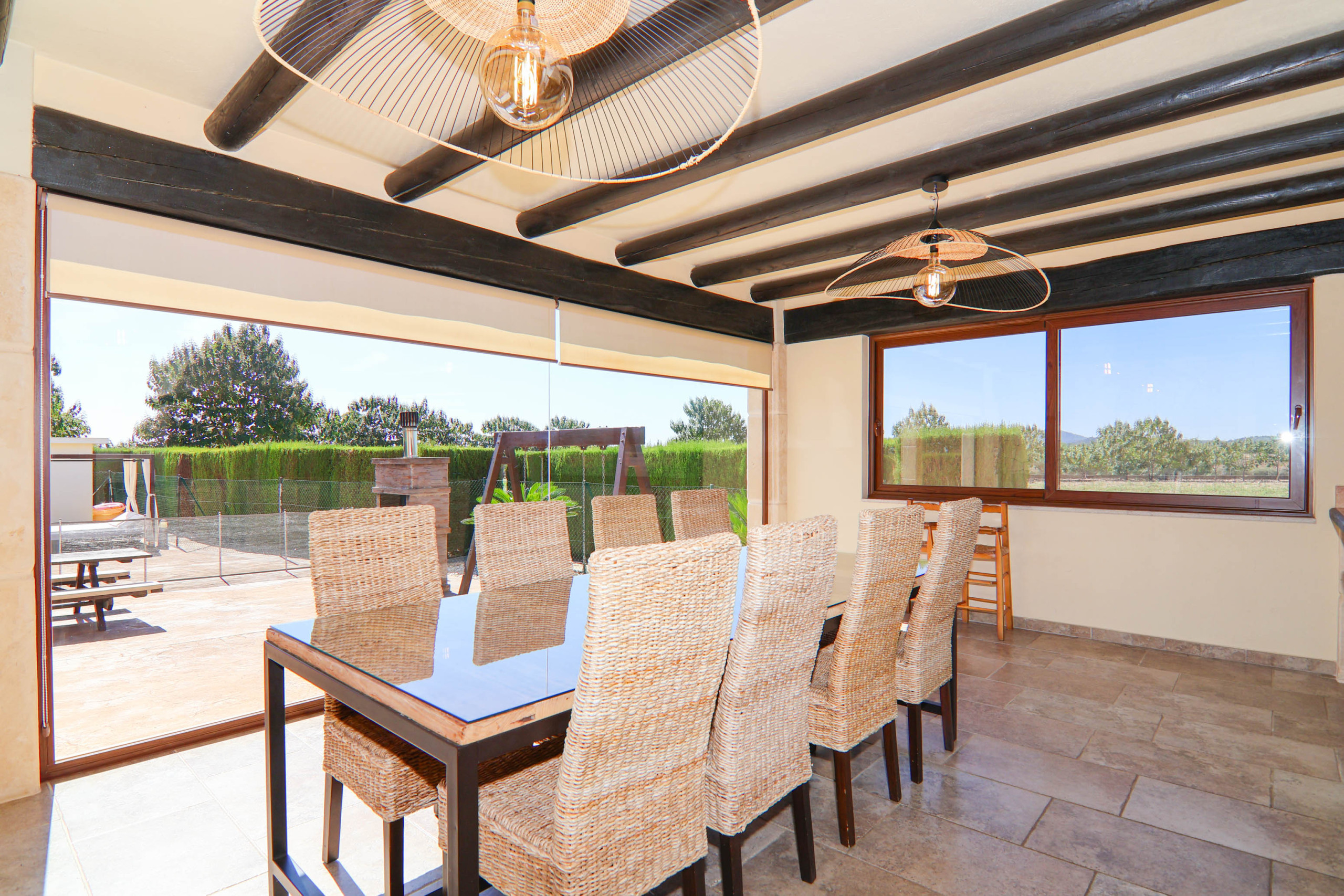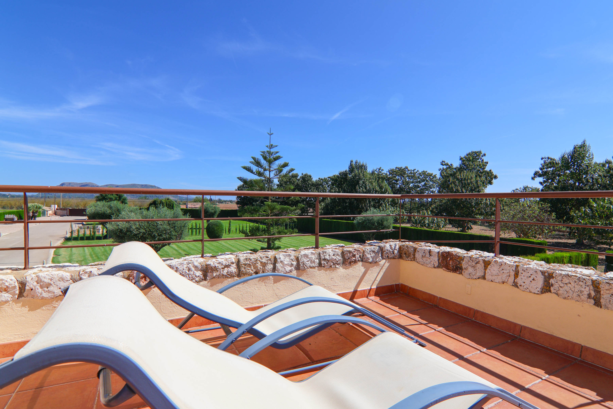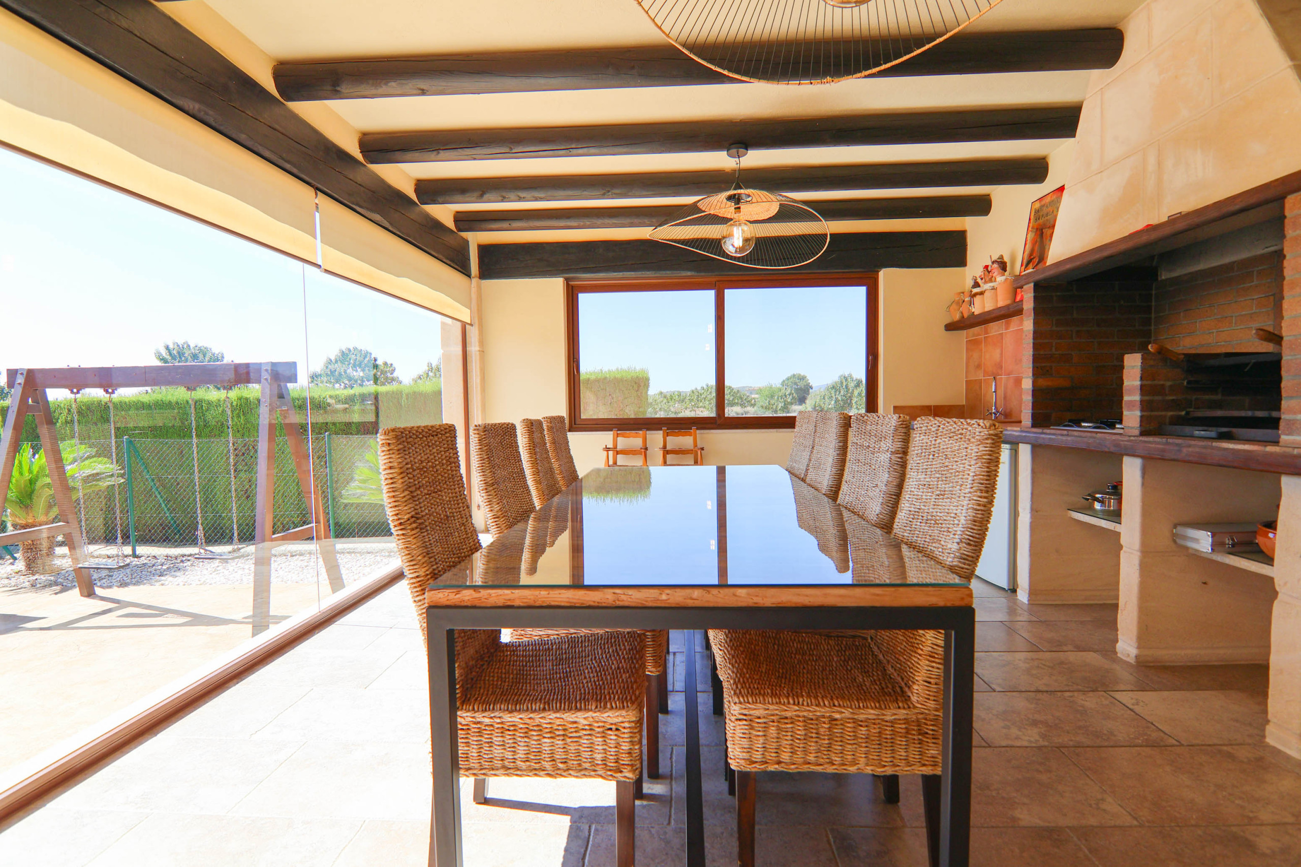 Beautiful and modern Villa near Sa Pobla with a lovely mountain view. The house has a habitable area of approximately 250 m². On the ground floor, next to the entrance on the right, are the stairs leading to the second floor. To the left is the first bedroom and in front a bathroom, the dining room in an open concept with a fully equipped living room, the kitchen is also super modern. There is another dining room with a barbecue. On the first floor there are two more bathrooms and three bedrooms. From the balcony you can enjoy fantastic views of the Mallorcan countryside. The house has air conditioning and central heating.