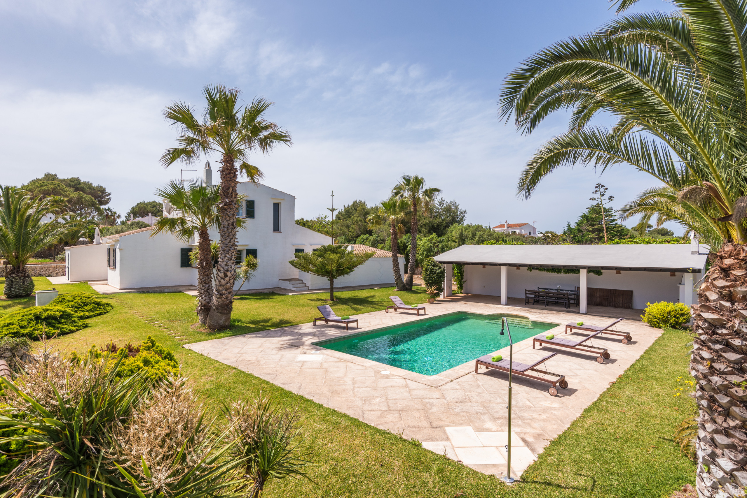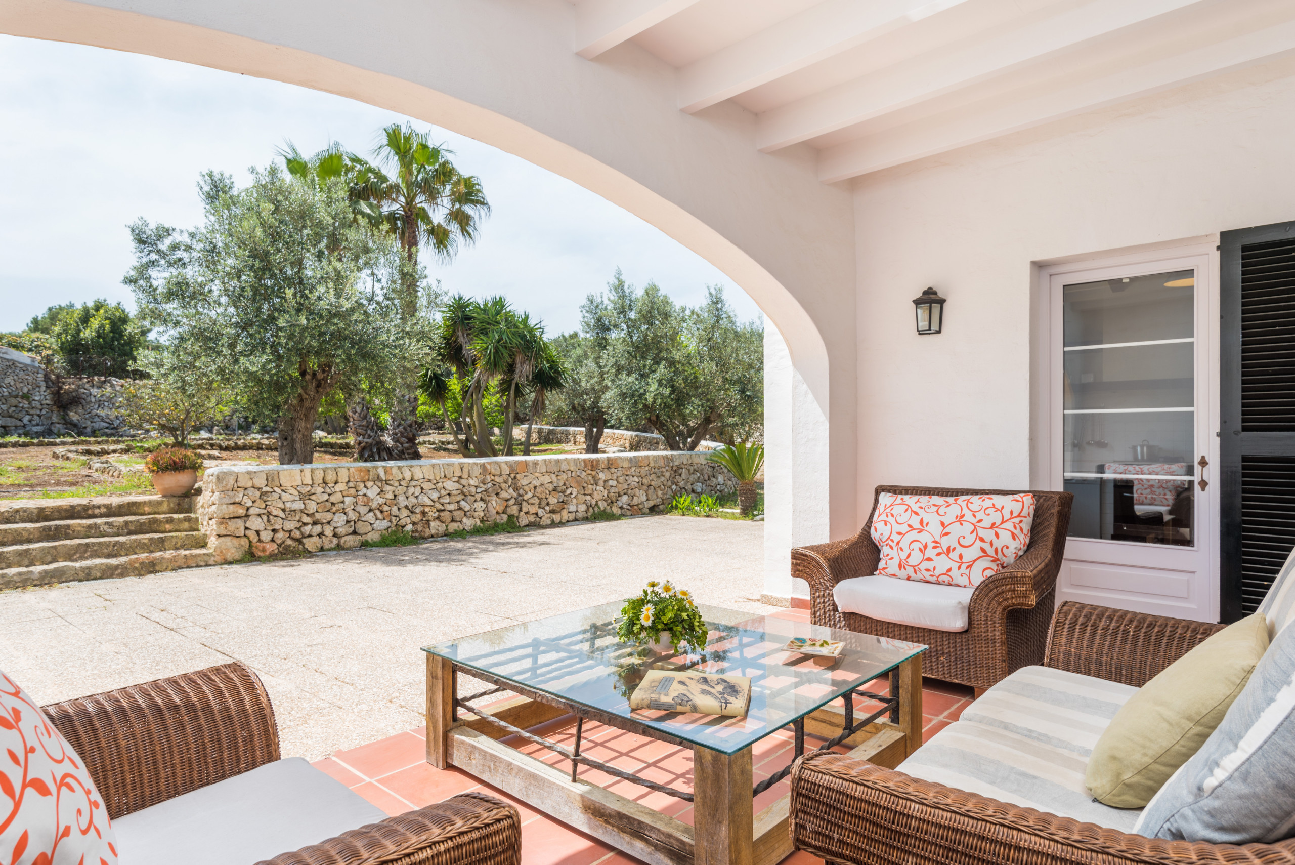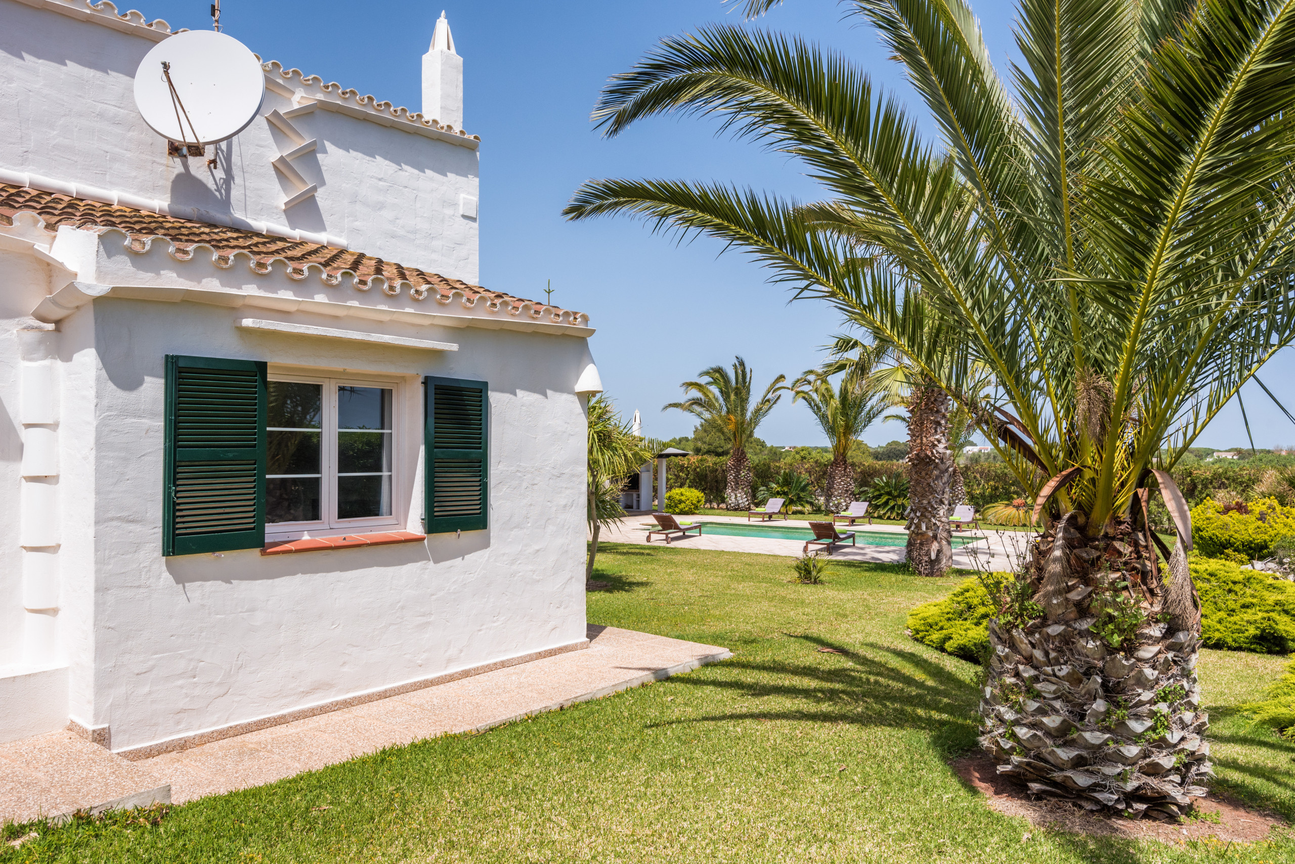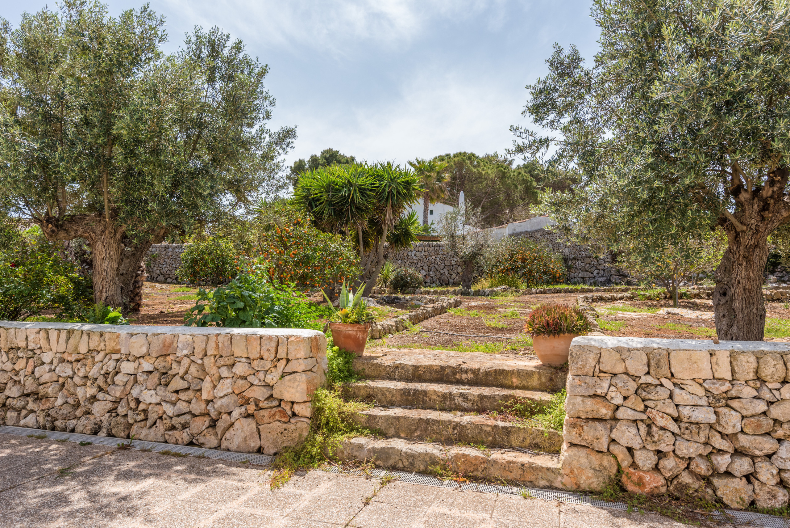 It has an extensive garden (8,000 m2) with lawn areas and trees. The 10 x 5 metre swimming pool has Roman steps. The exterior features a porch with furniture for outdoor dining in the shade, and additionally, there is another porch next to the typical Menorcan bread oven, with furniture for sitting to read or rest.