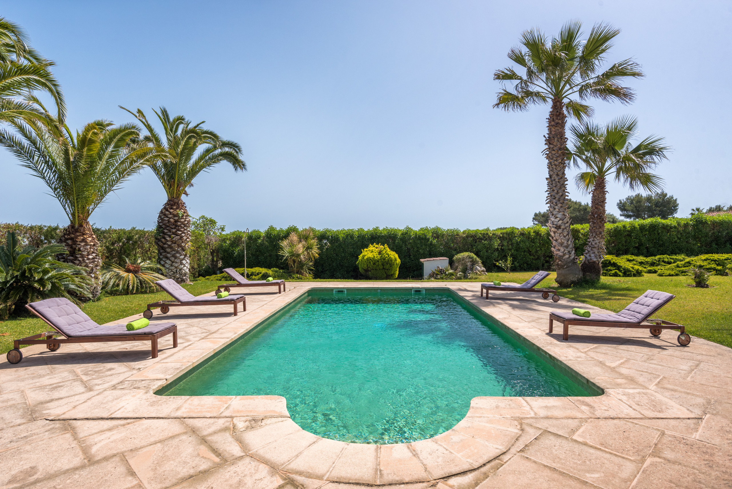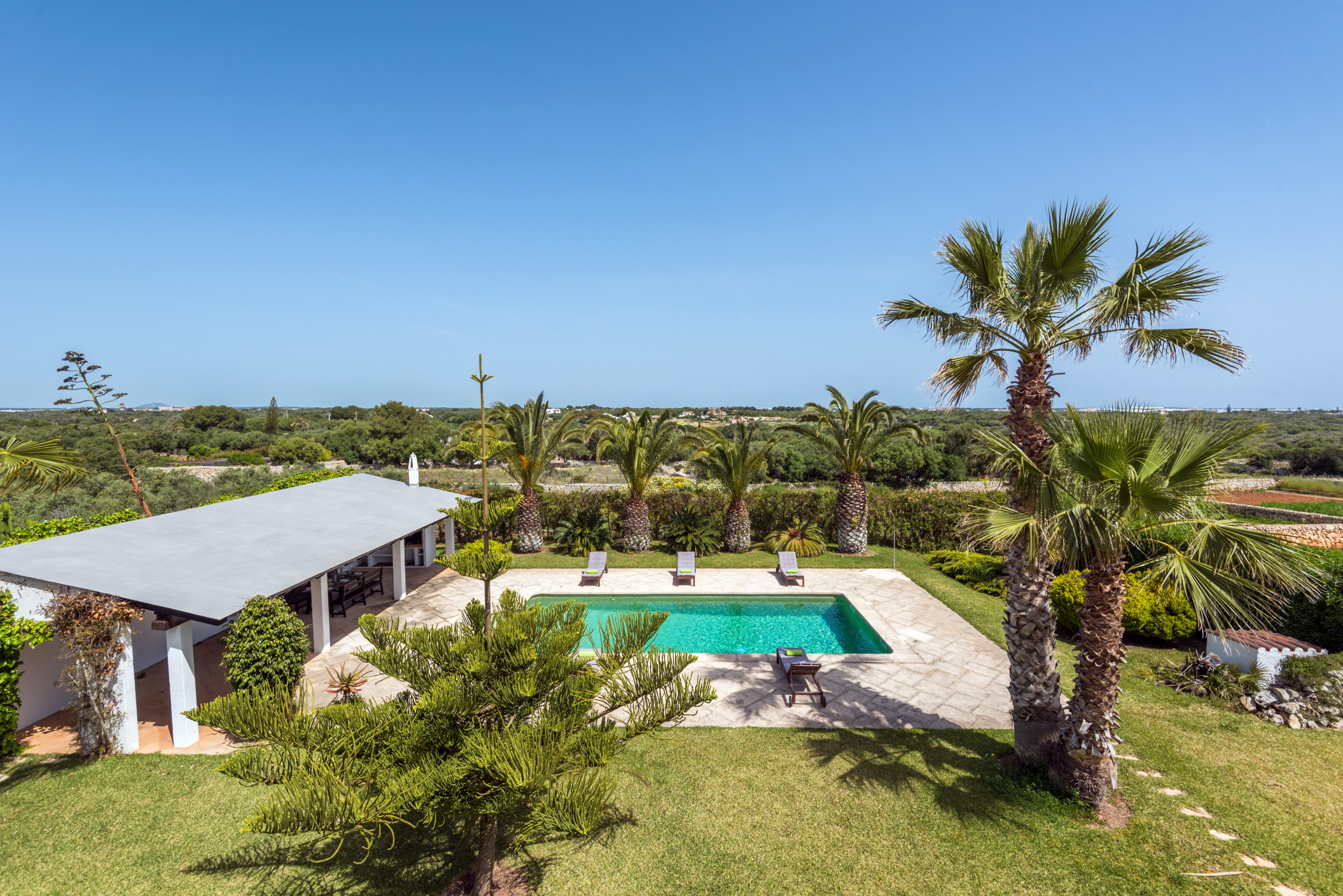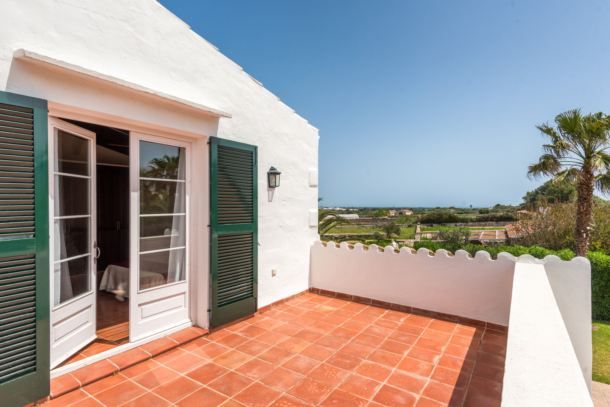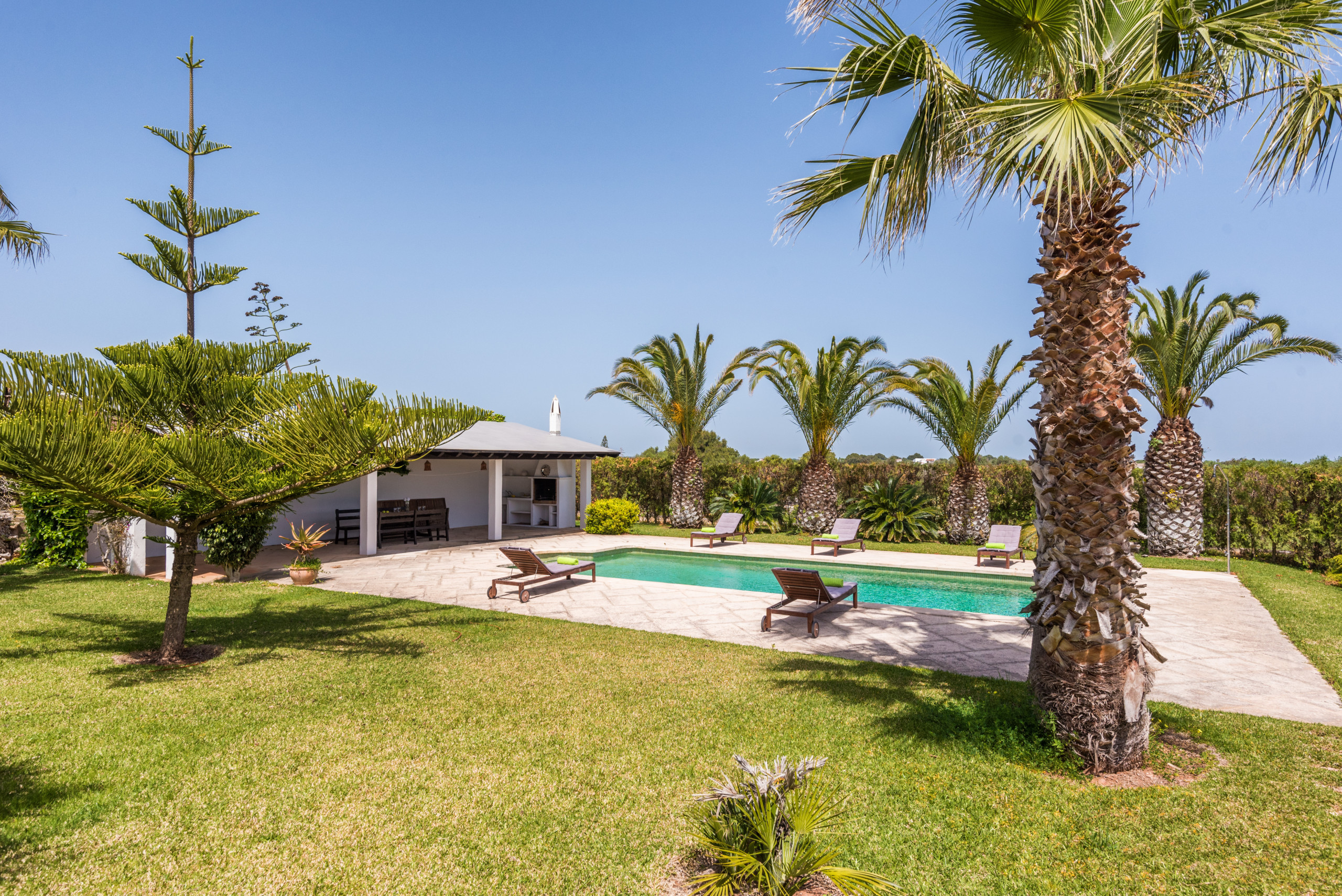 It has an extensive garden (8,000 m2) with lawn areas and trees. The 10 x 5 metre swimming pool has Roman steps. The exterior features a porch with furniture for outdoor dining in the shade, and additionally, there is another porch next to the typical Menorcan bread oven, with furniture for sitting to read or rest.