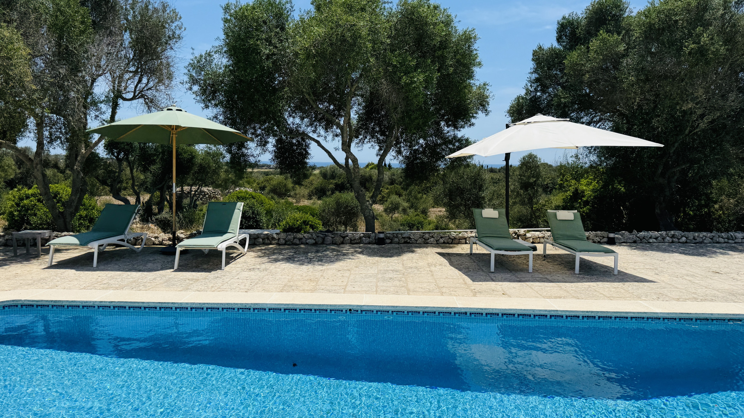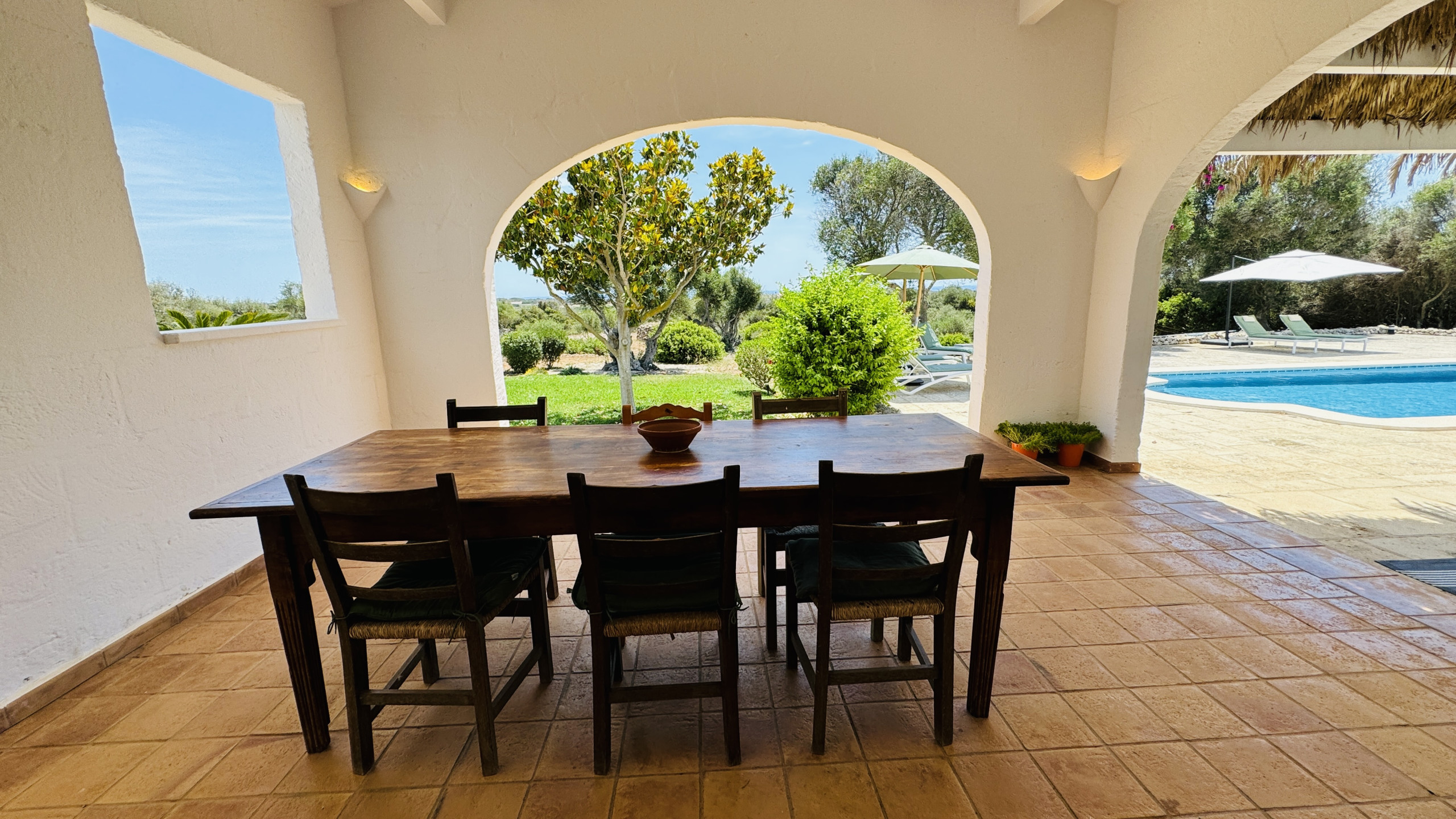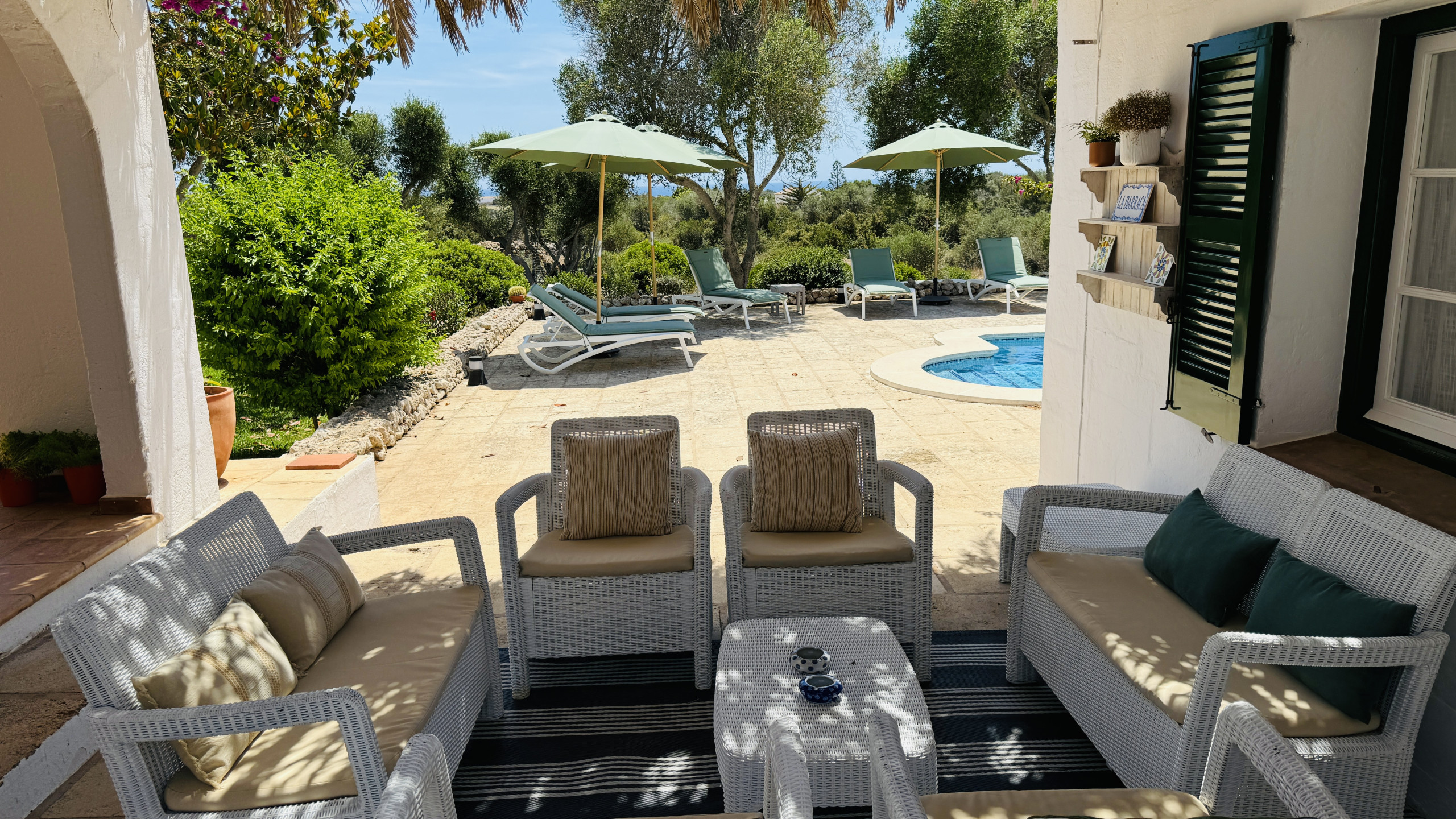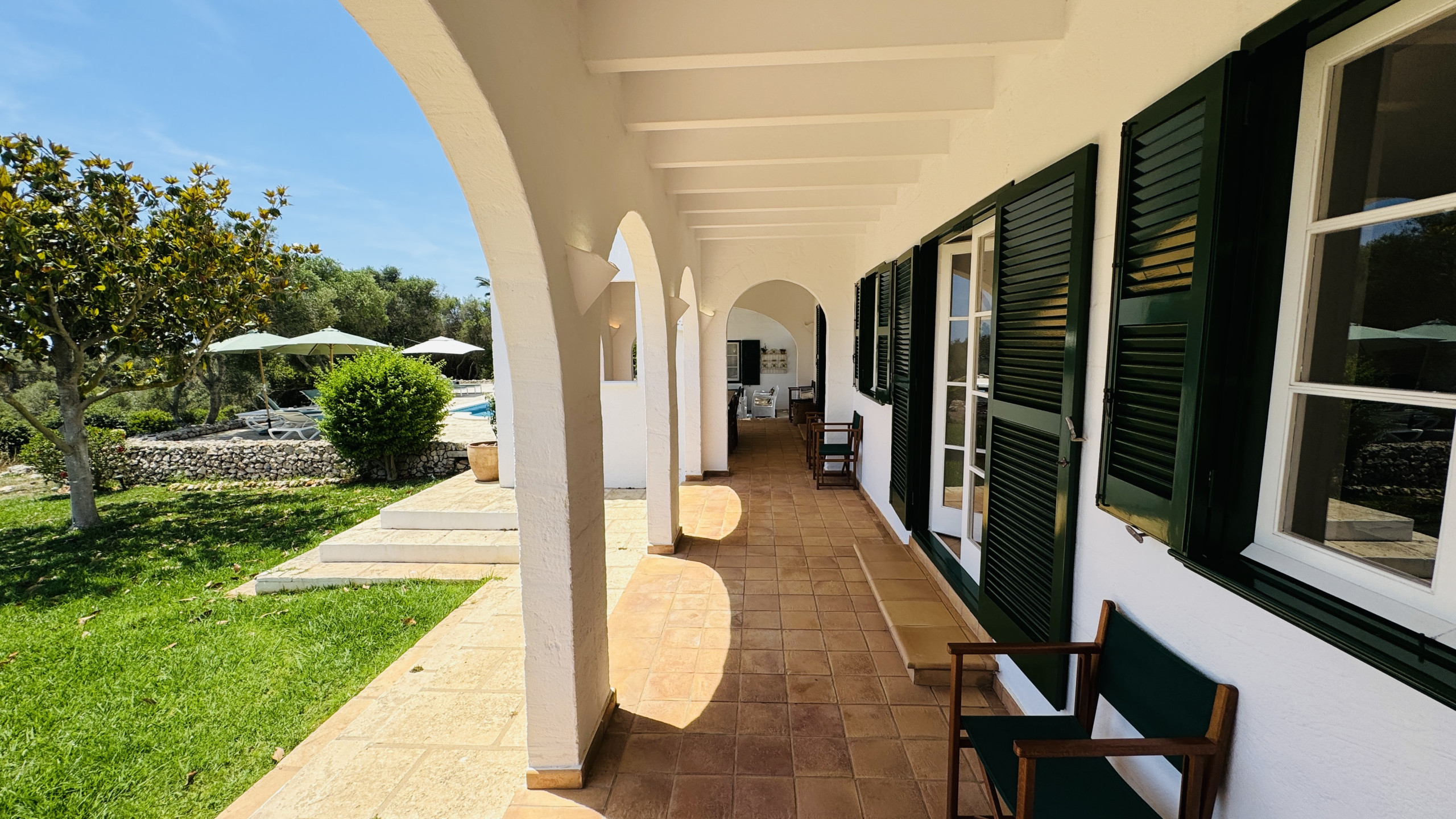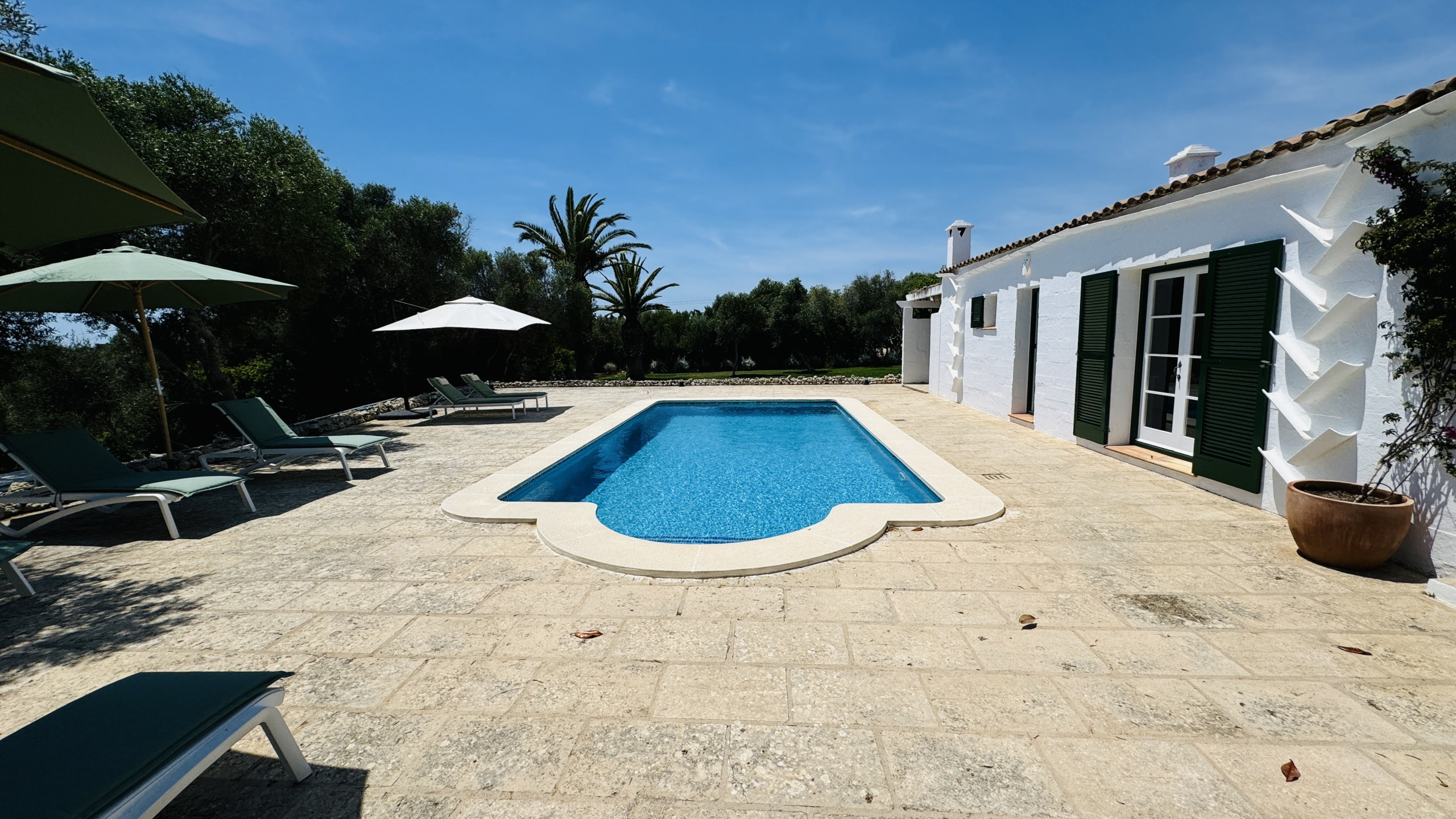 The land belonging to the house is approximately 11,000 square metres. The swimming pool is located on the east side of the house and measures 10 x 5 metres. Near the pool, there is a covered area for outdoor dining. The house's porch features typical Menorcan built-in sofas. The land has extensive lawn areas, olive trees, and several very peaceful areas where one can relax in the shade.