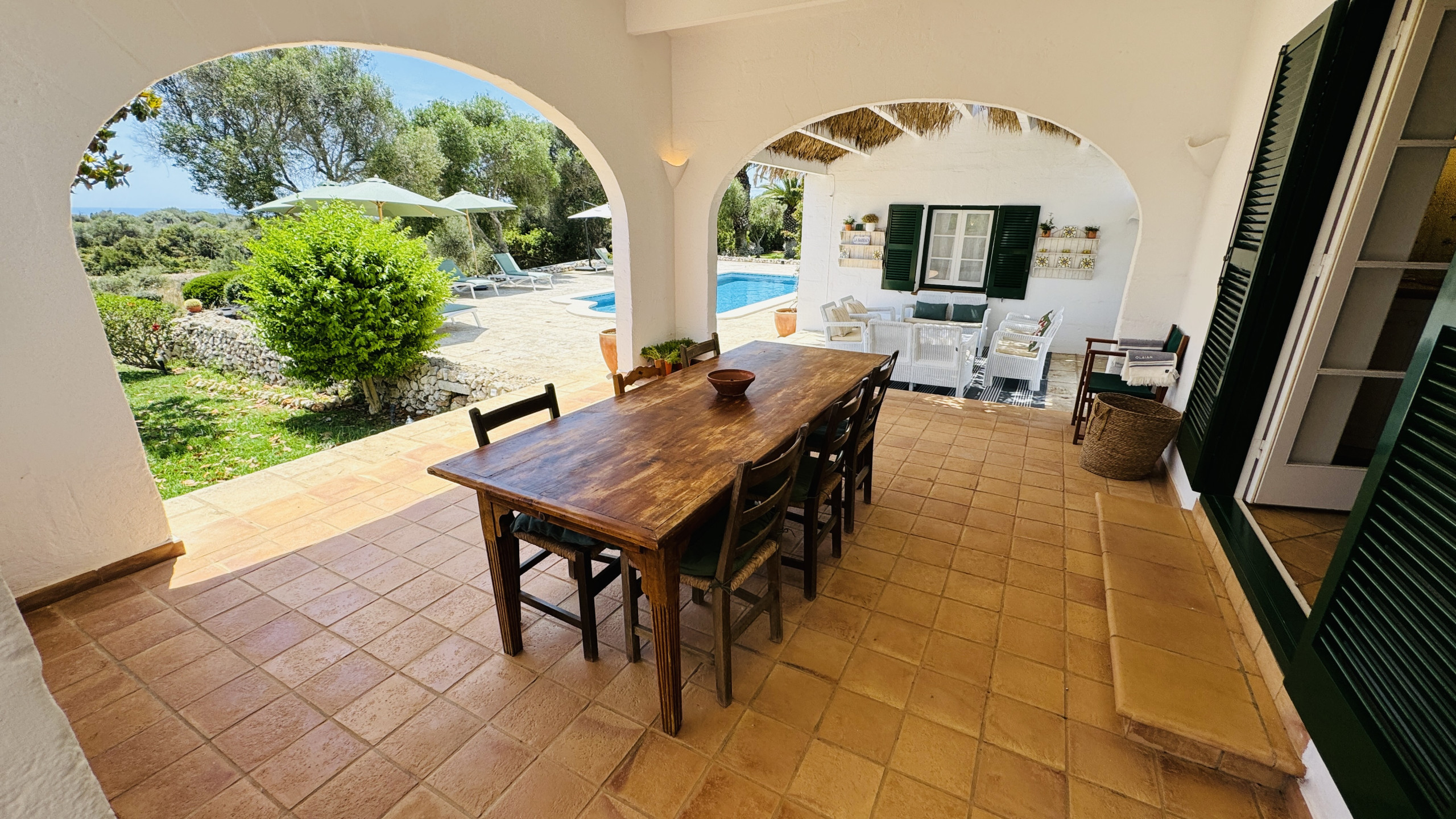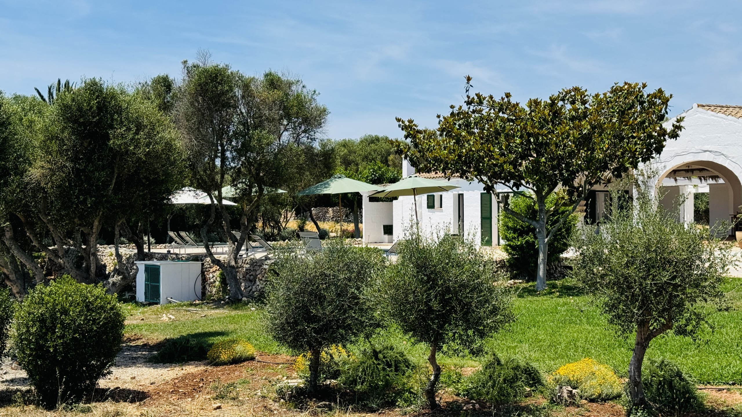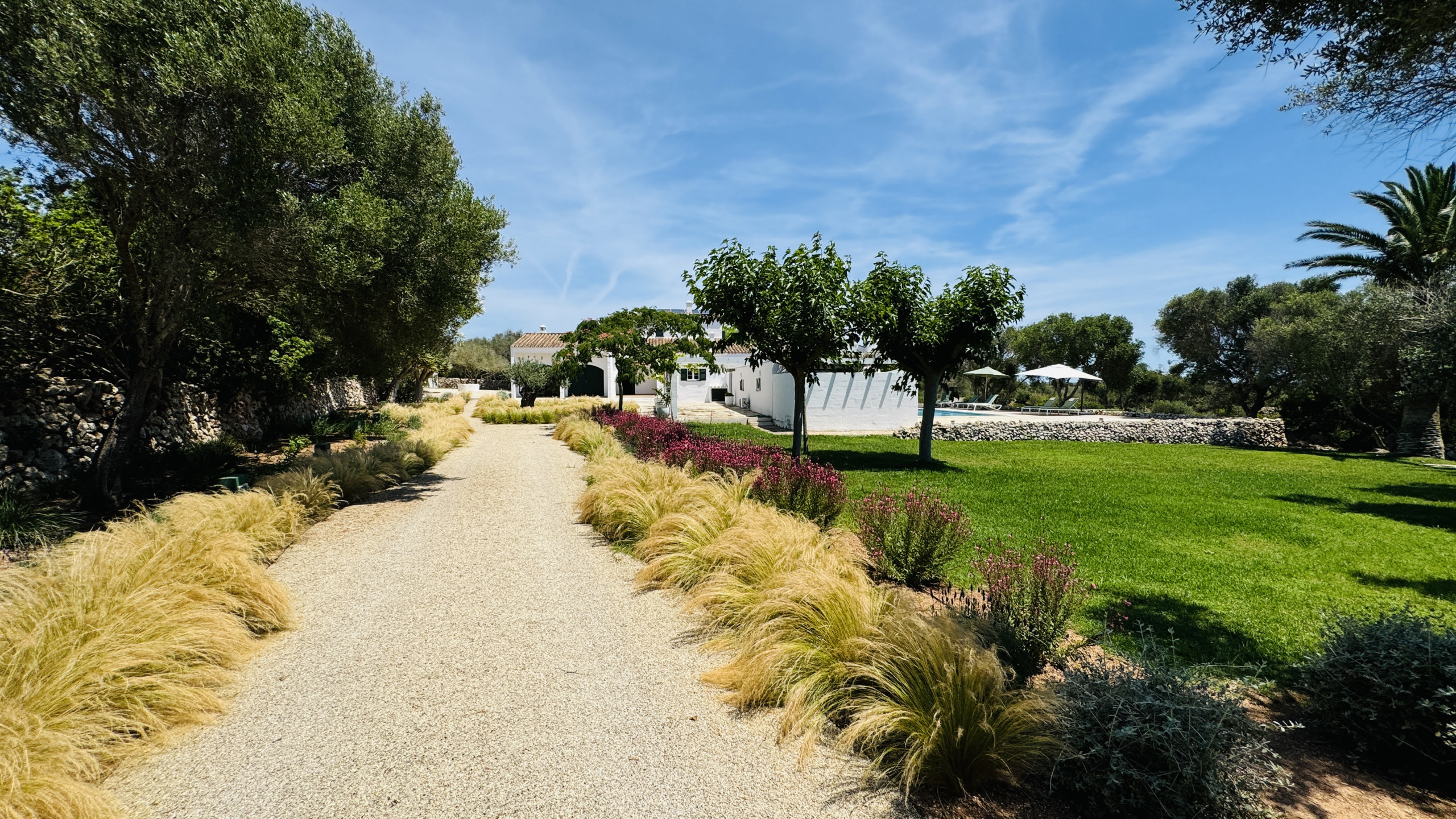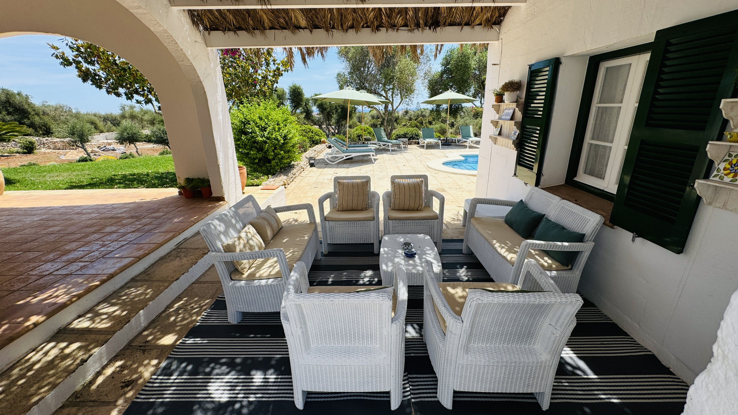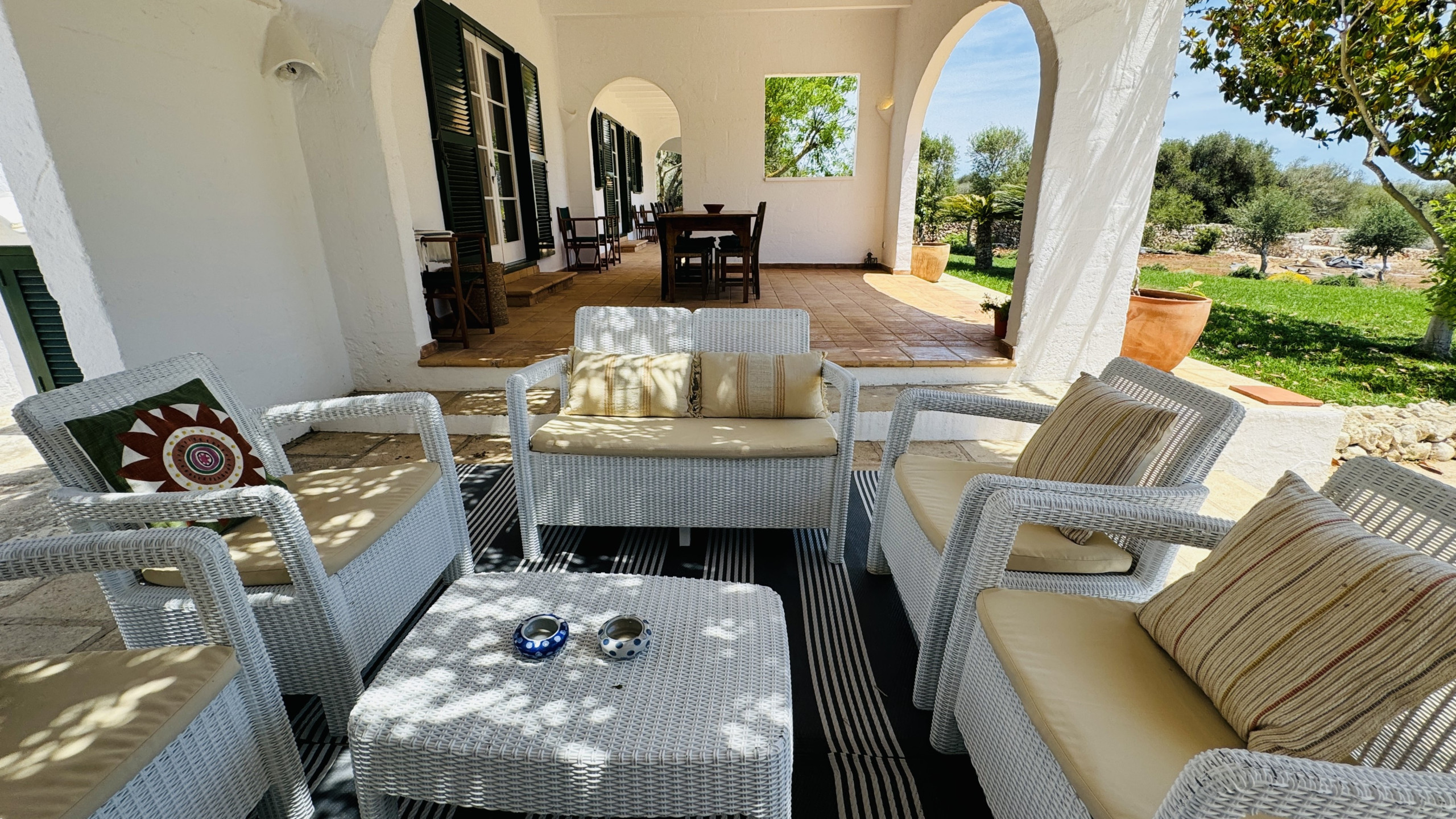 The land belonging to the house is approximately 11,000 square metres. The swimming pool is located on the east side of the house and measures 10 x 5 metres. Near the pool, there is a covered area for outdoor dining. The house's porch features typical Menorcan built-in sofas. The land has extensive lawn areas, olive trees, and several very peaceful areas where one can relax in the shade.