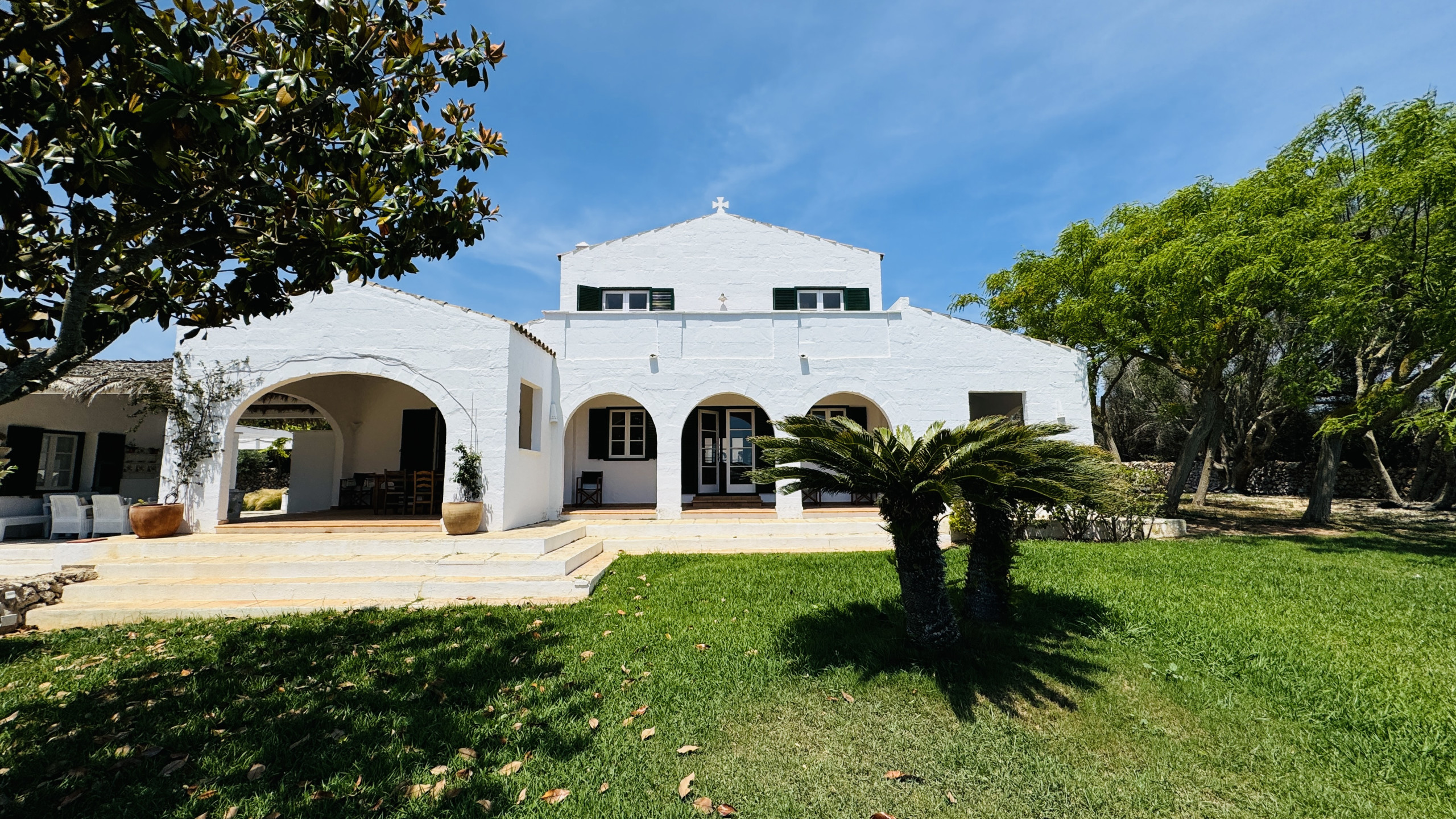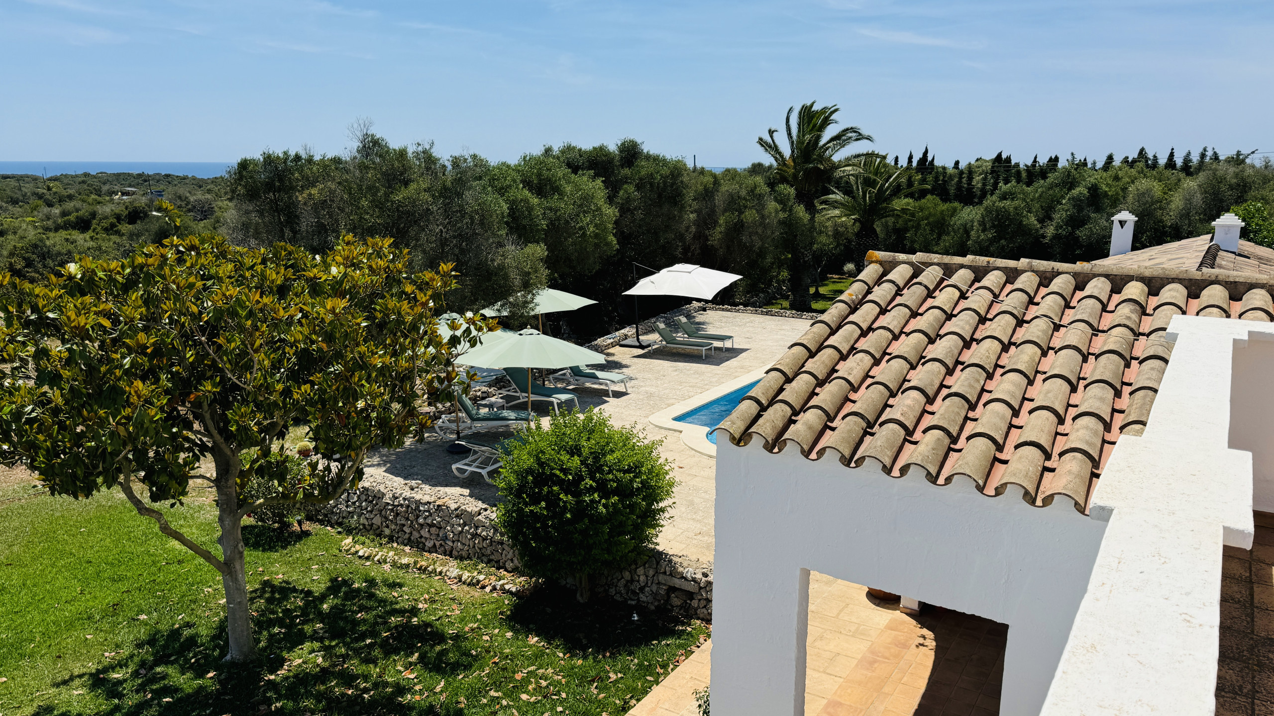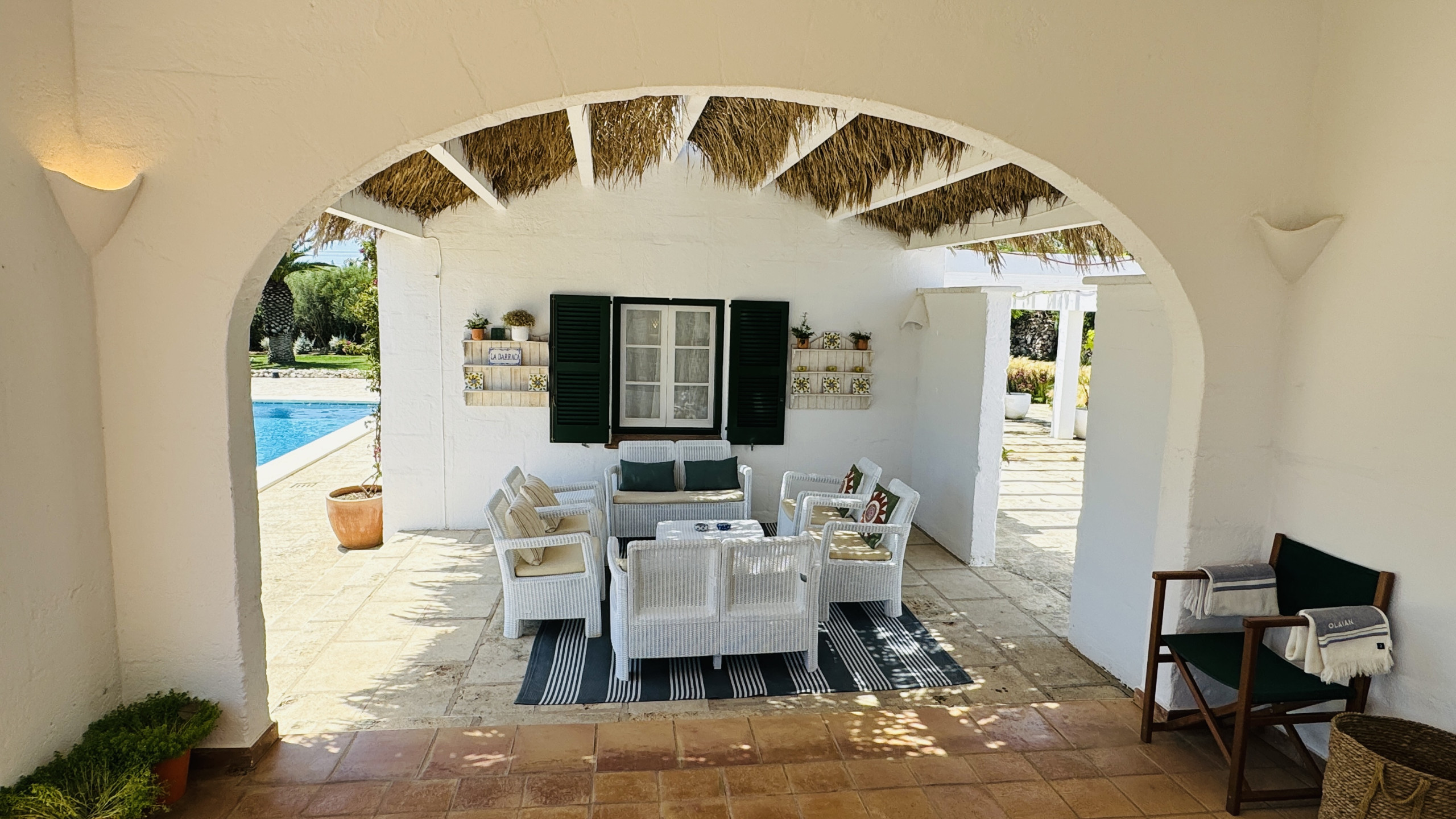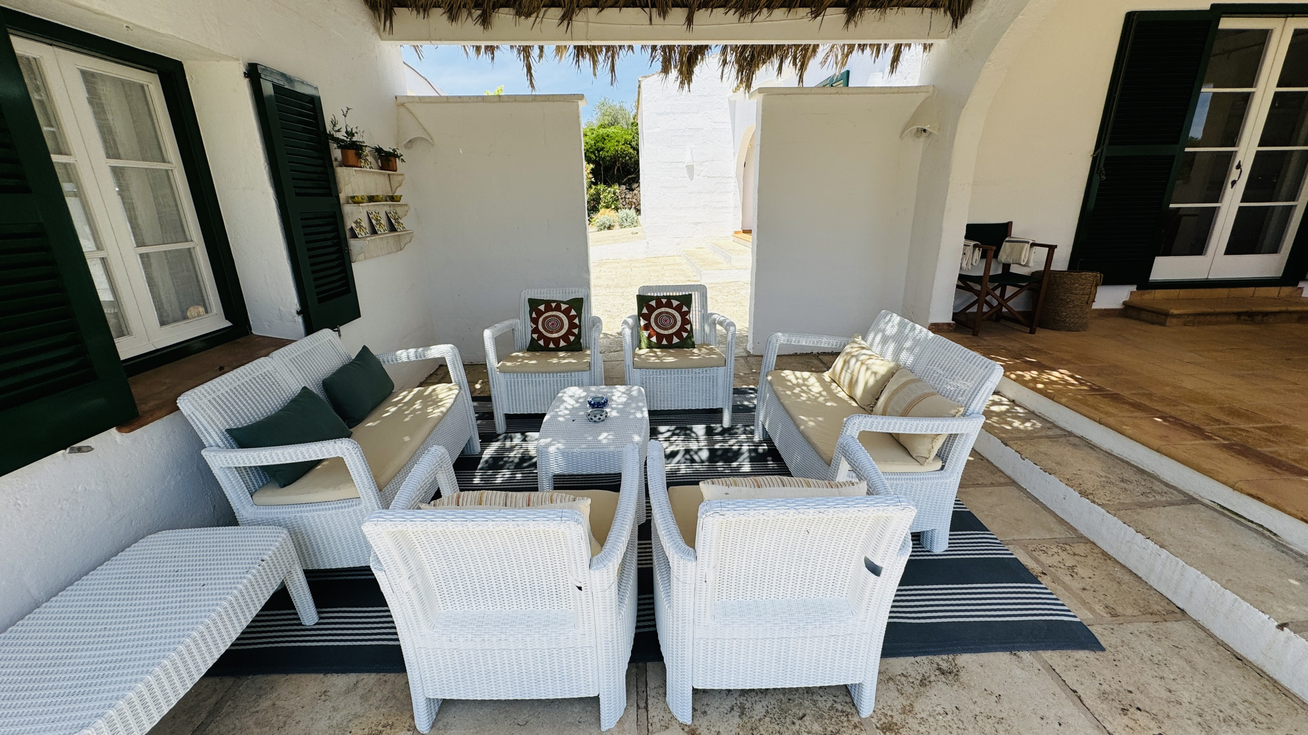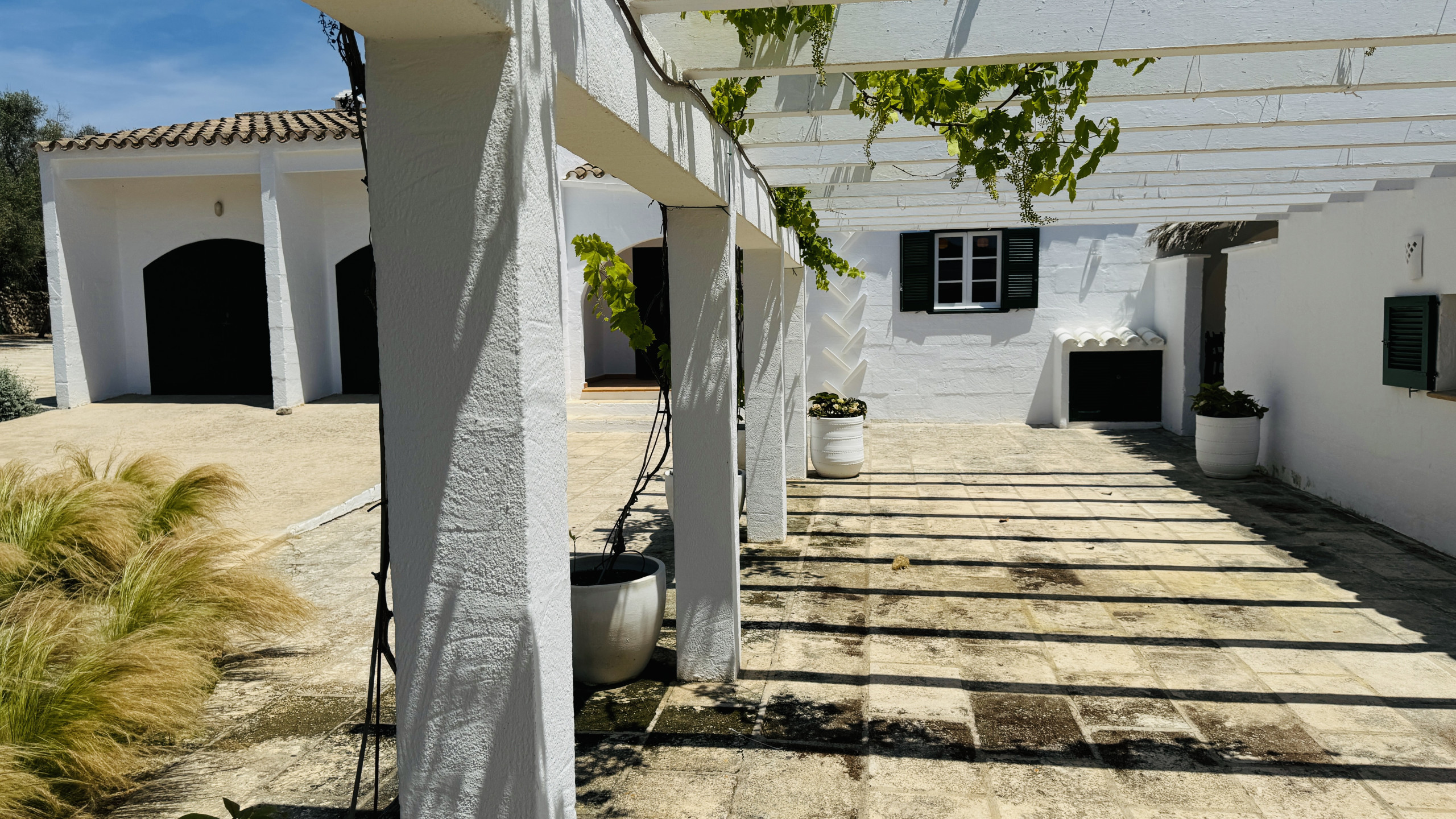 The land belonging to the house is approximately 11,000 square metres. The swimming pool is located on the east side of the house and measures 10 x 5 metres. Near the pool, there is a covered area for outdoor dining. The house's porch features typical Menorcan built-in sofas. The land has extensive lawn areas, olive trees, and several very peaceful areas where one can relax in the shade.