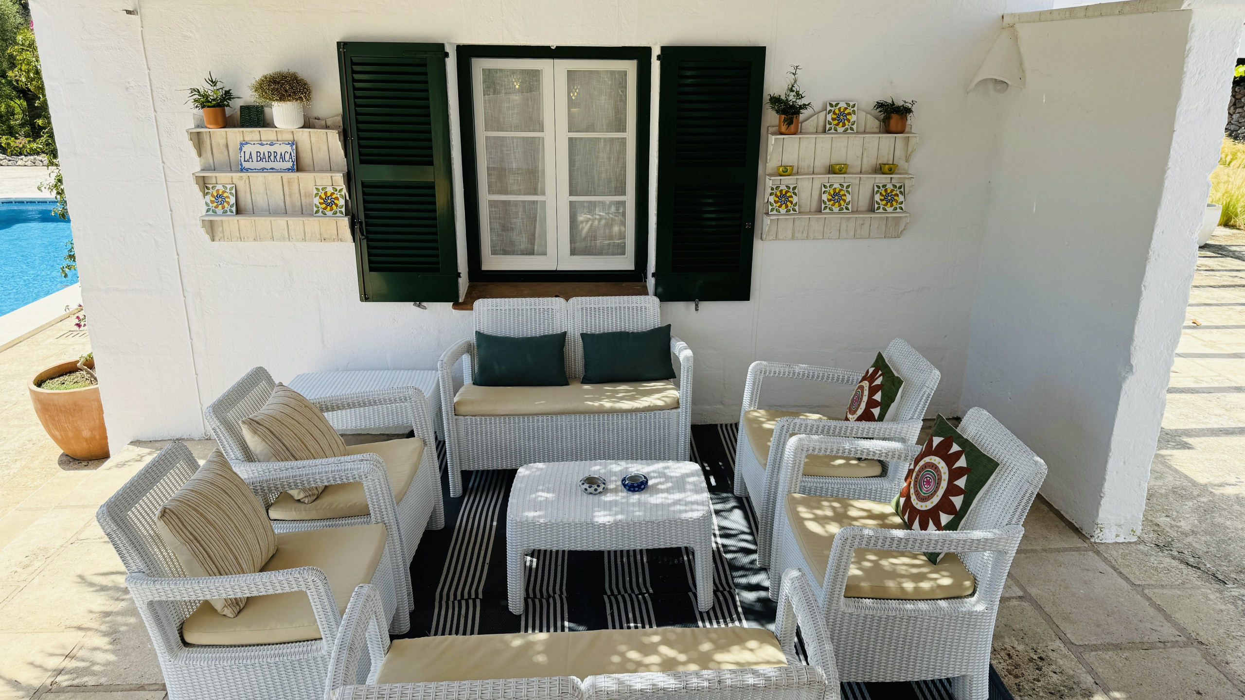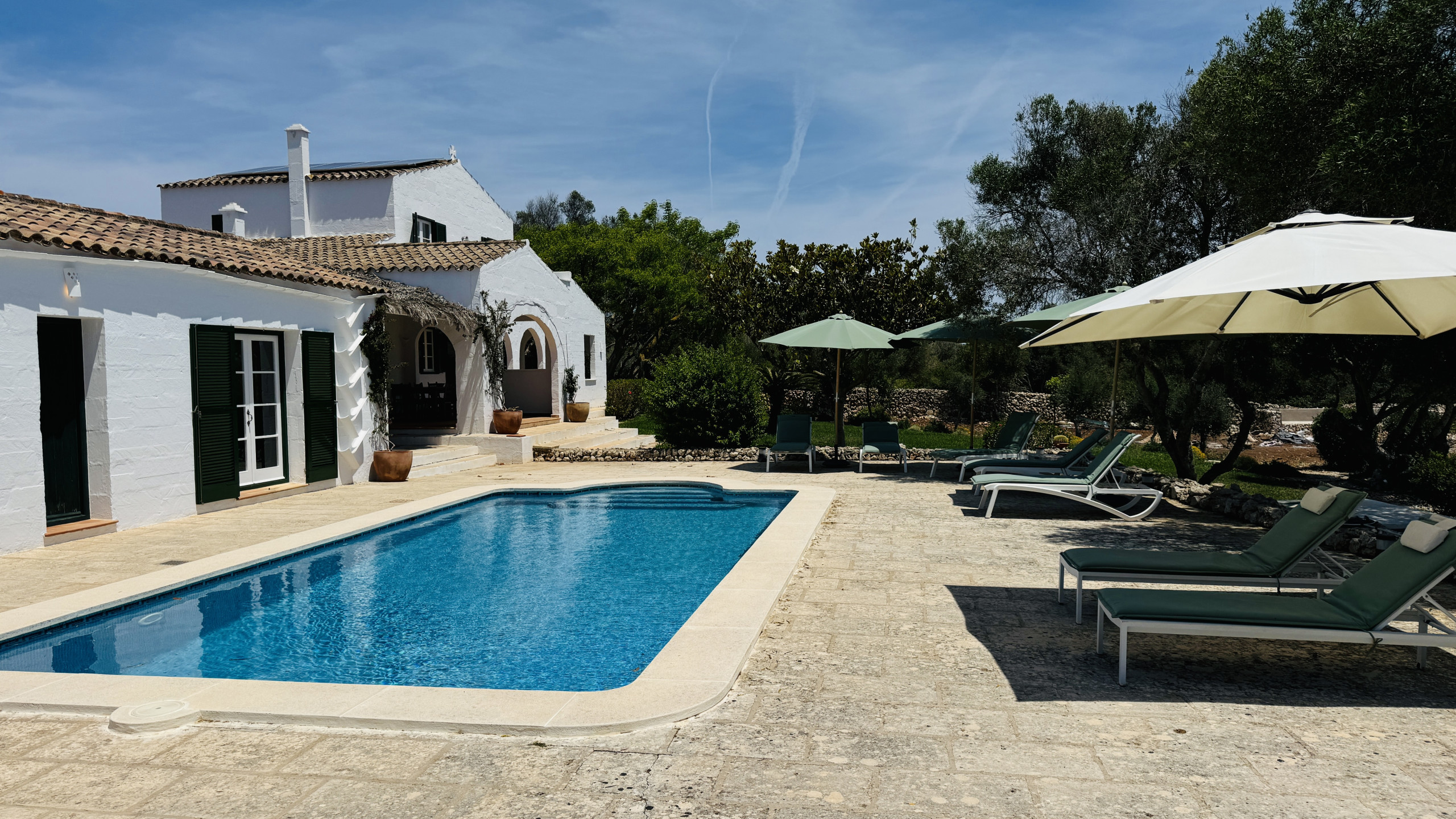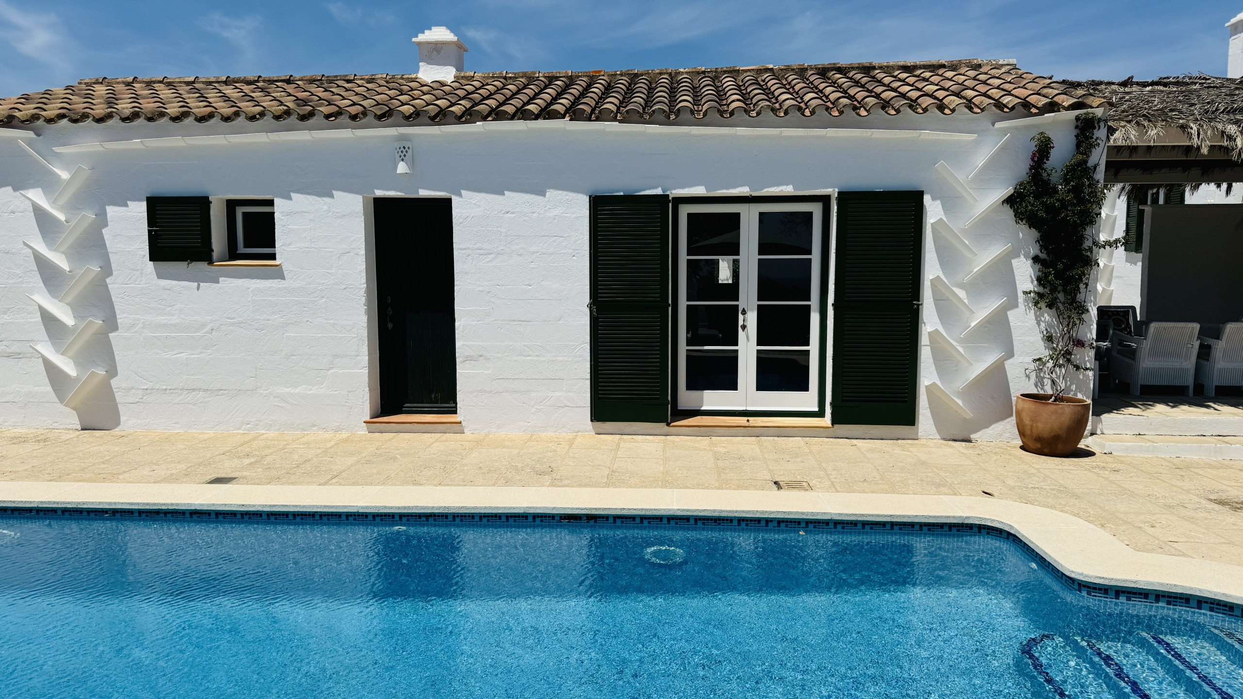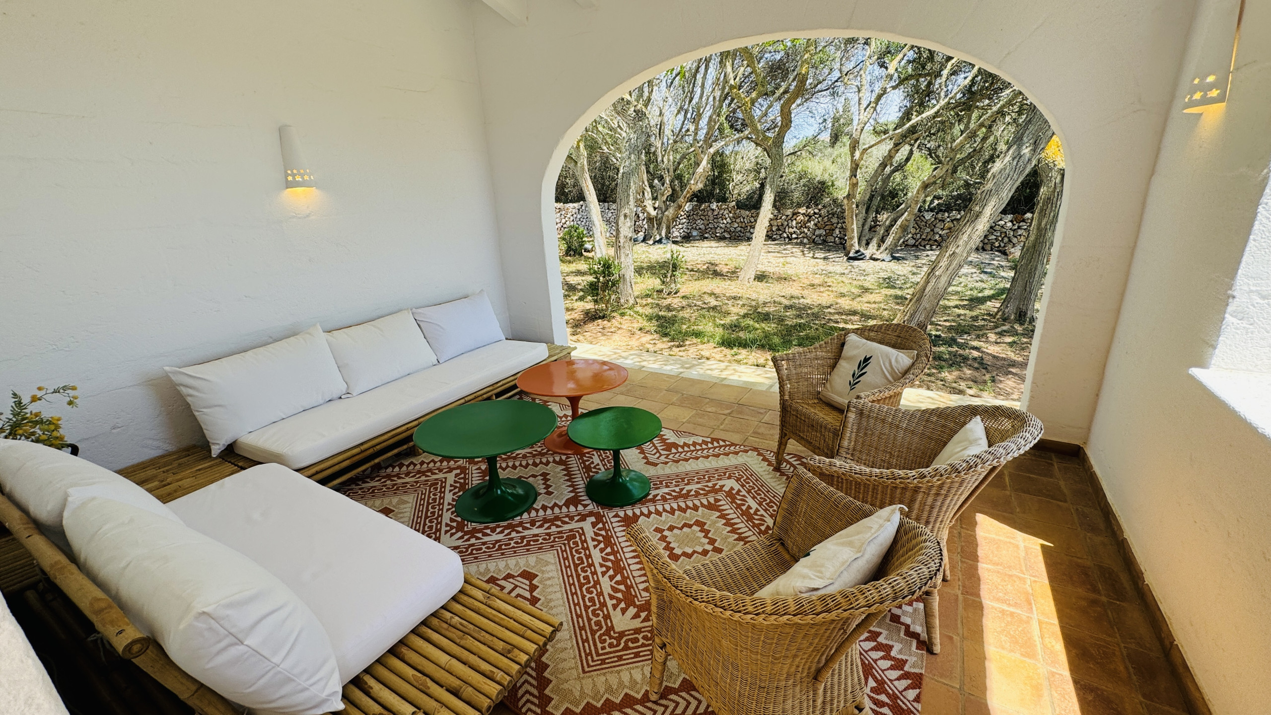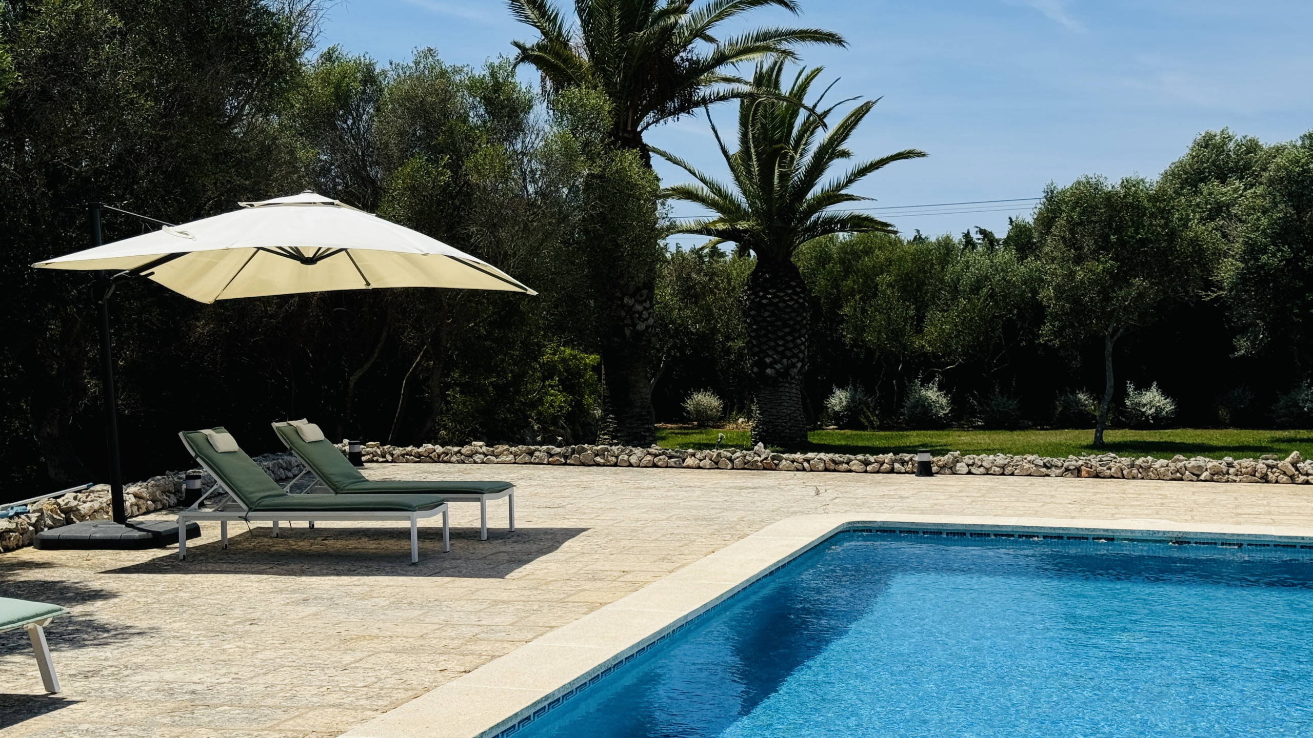 The land belonging to the house is approximately 11,000 square metres. The swimming pool is located on the east side of the house and measures 10 x 5 metres. Near the pool, there is a covered area for outdoor dining. The house's porch features typical Menorcan built-in sofas. The land has extensive lawn areas, olive trees, and several very peaceful areas where one can relax in the shade.