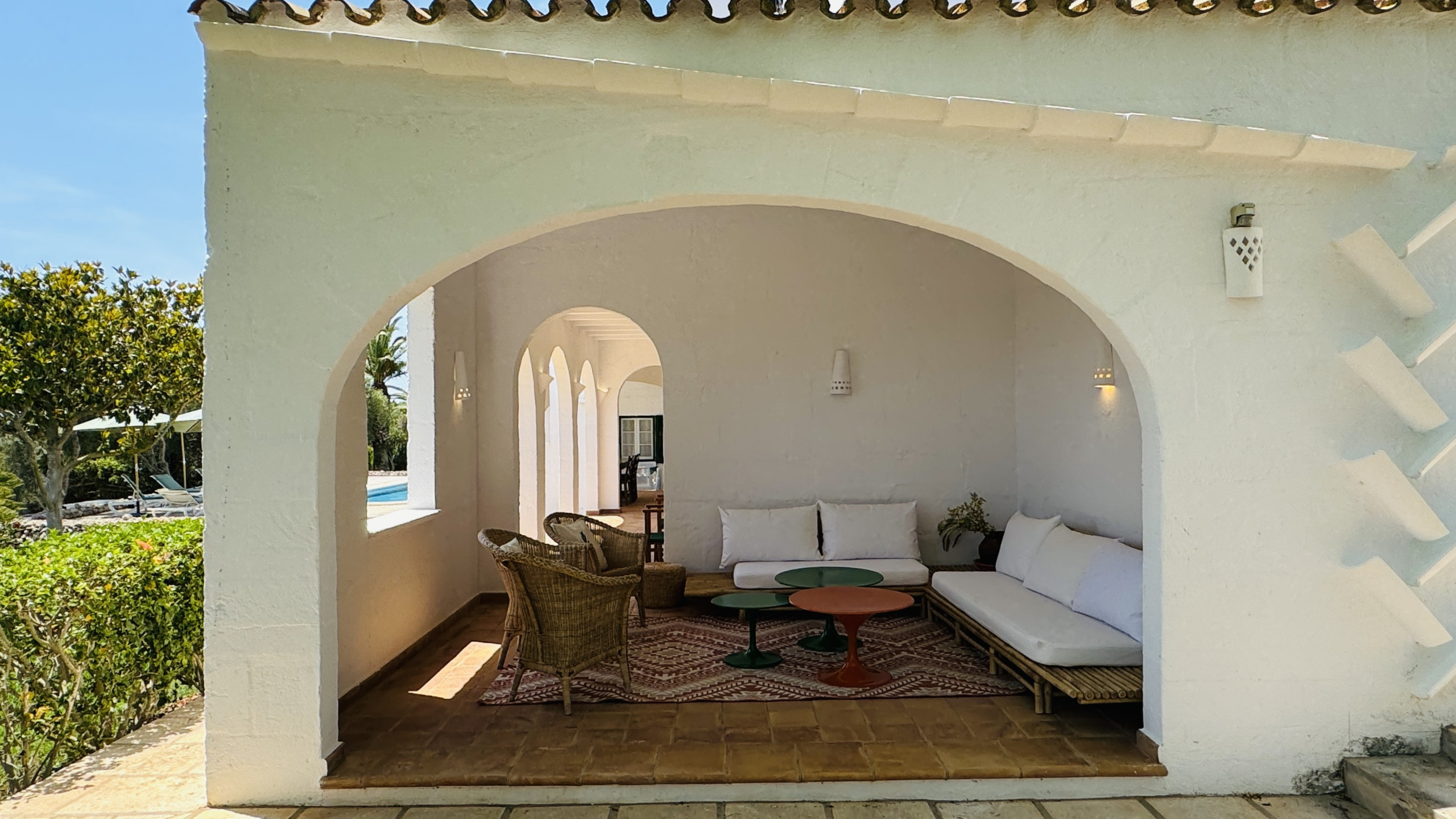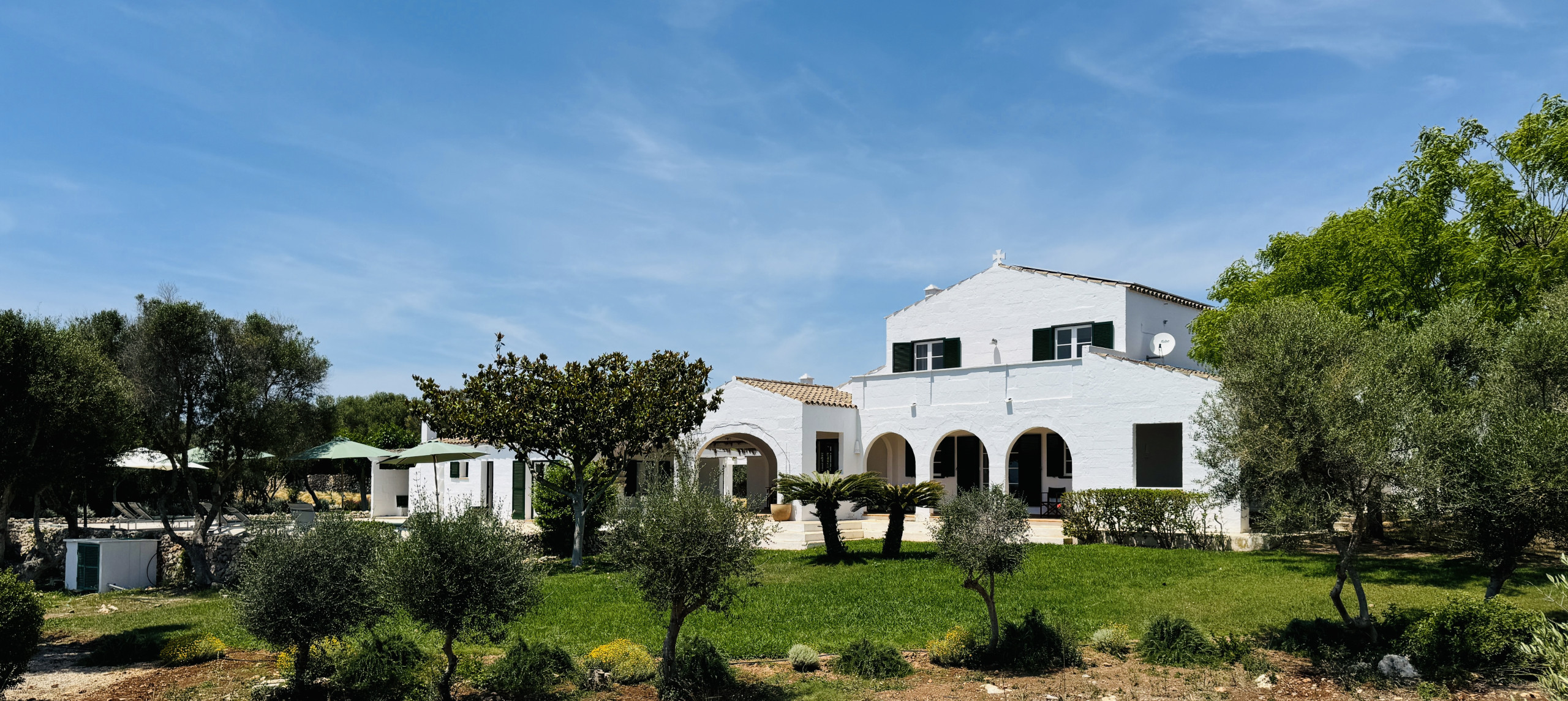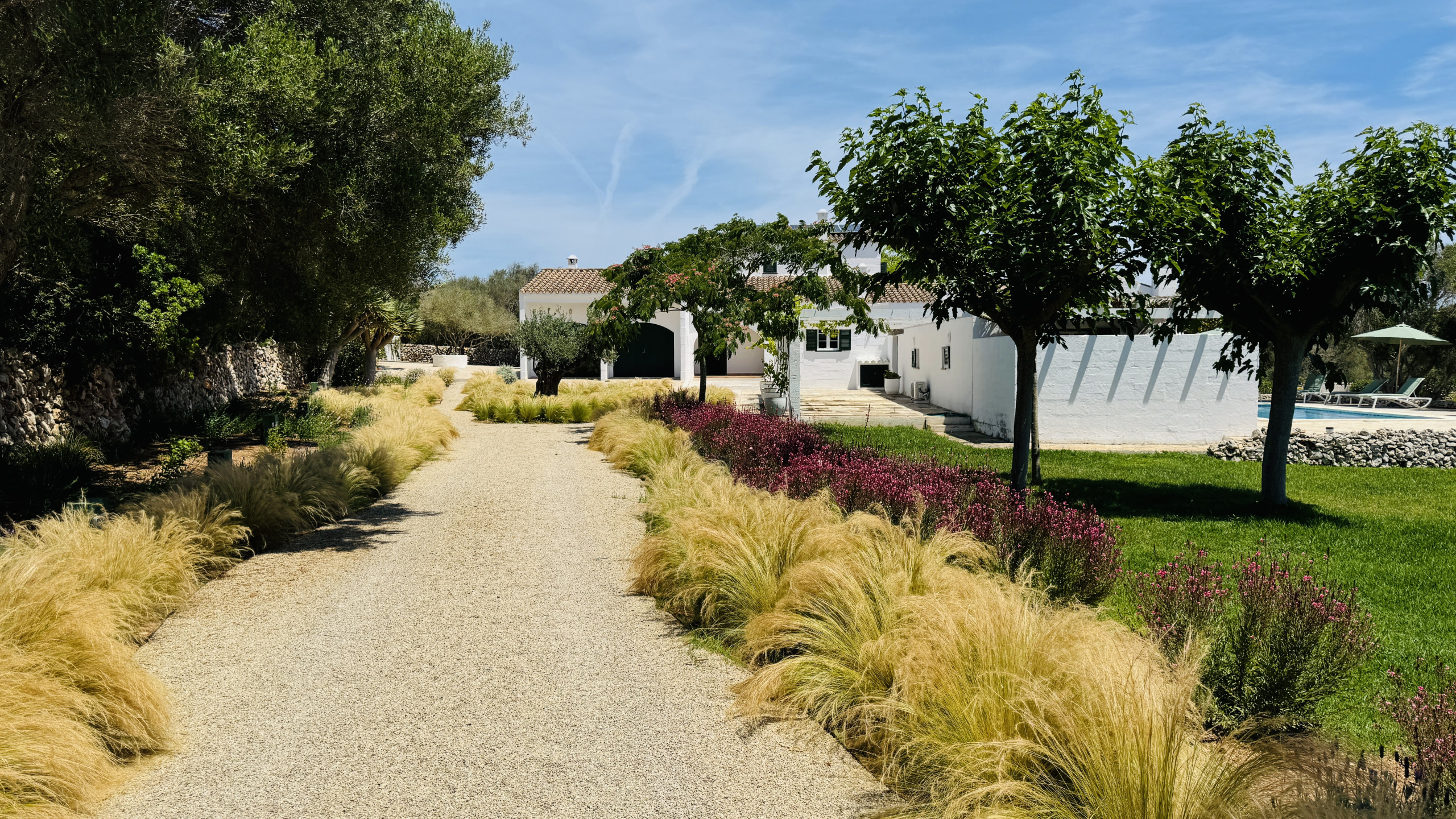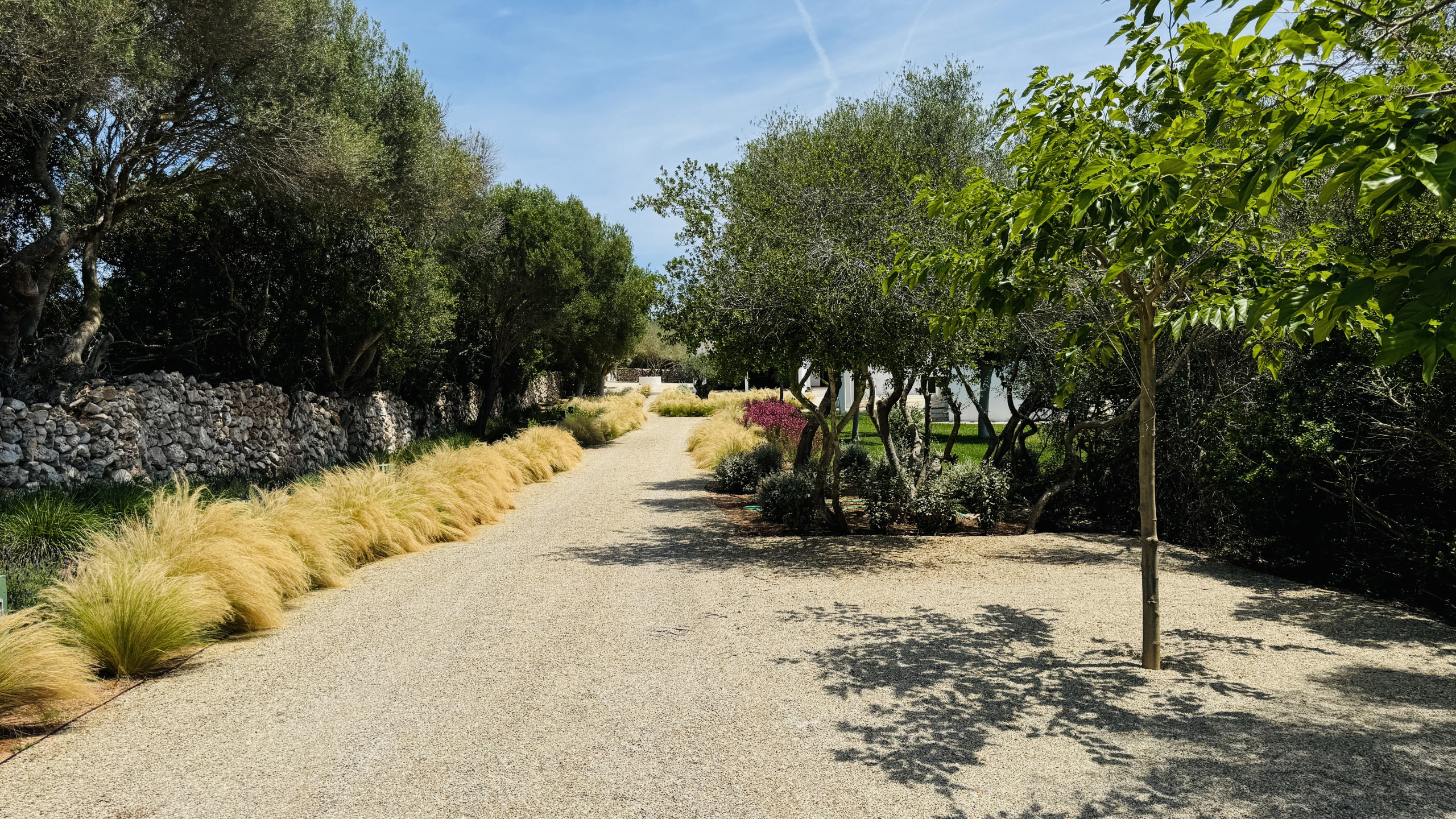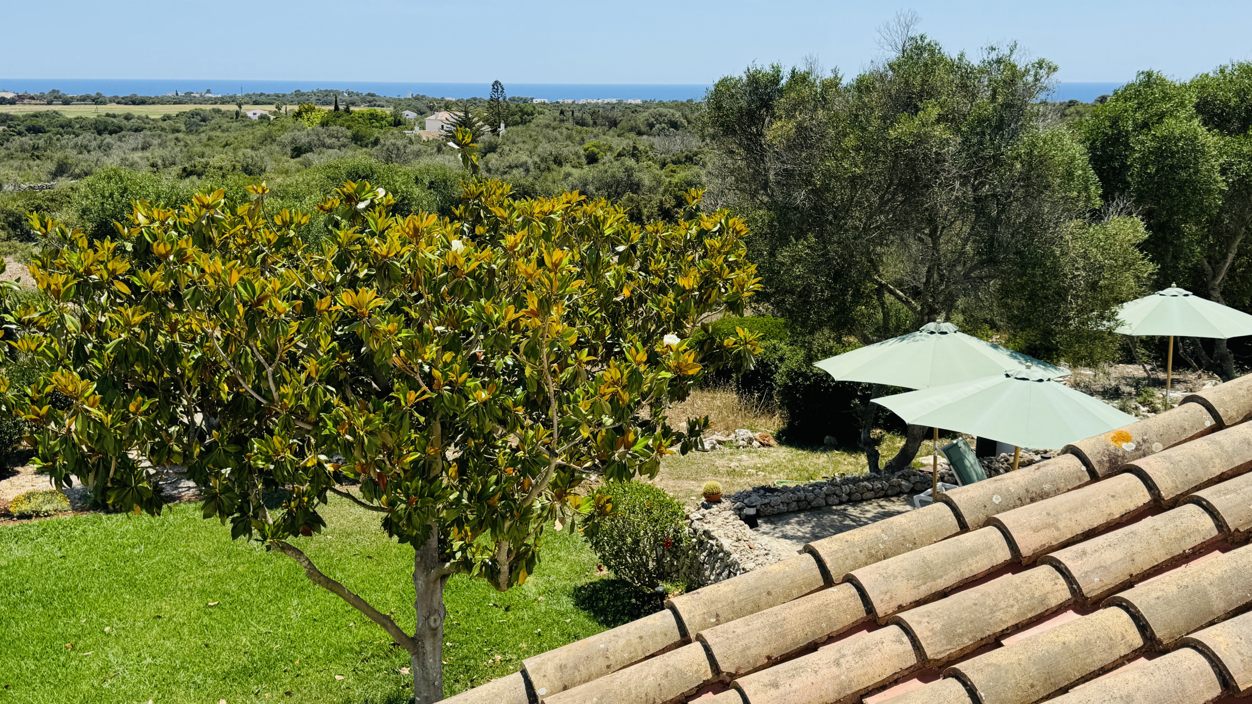 The land belonging to the house is approximately 11,000 square metres. The swimming pool is located on the east side of the house and measures 10 x 5 metres. Near the pool, there is a covered area for outdoor dining. The house's porch features typical Menorcan built-in sofas. The land has extensive lawn areas, olive trees, and several very peaceful areas where one can relax in the shade.