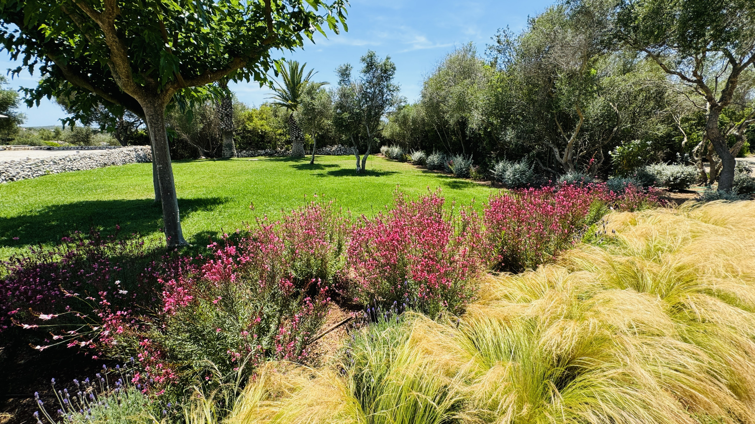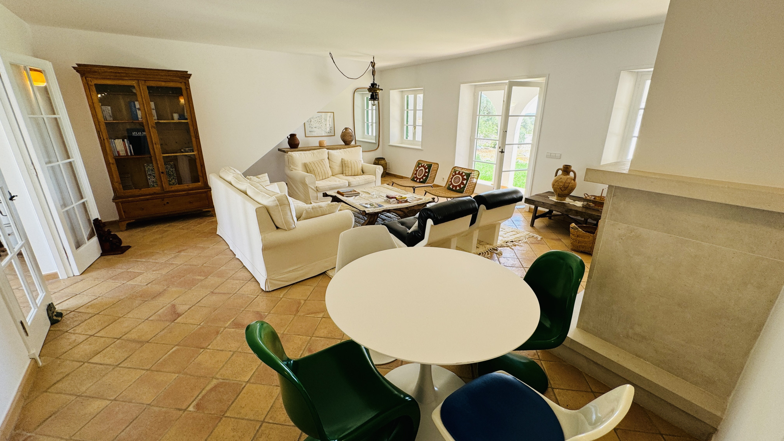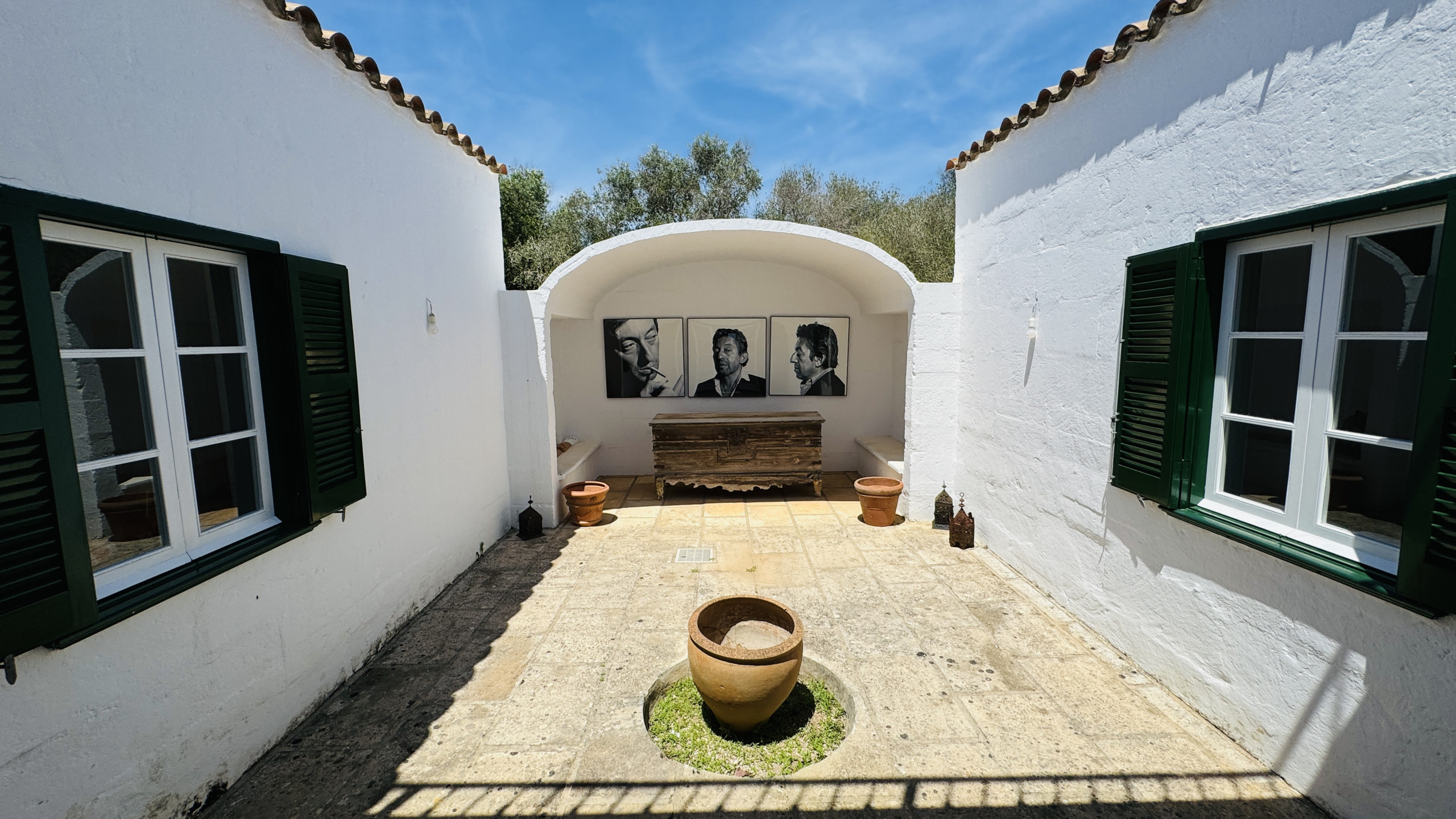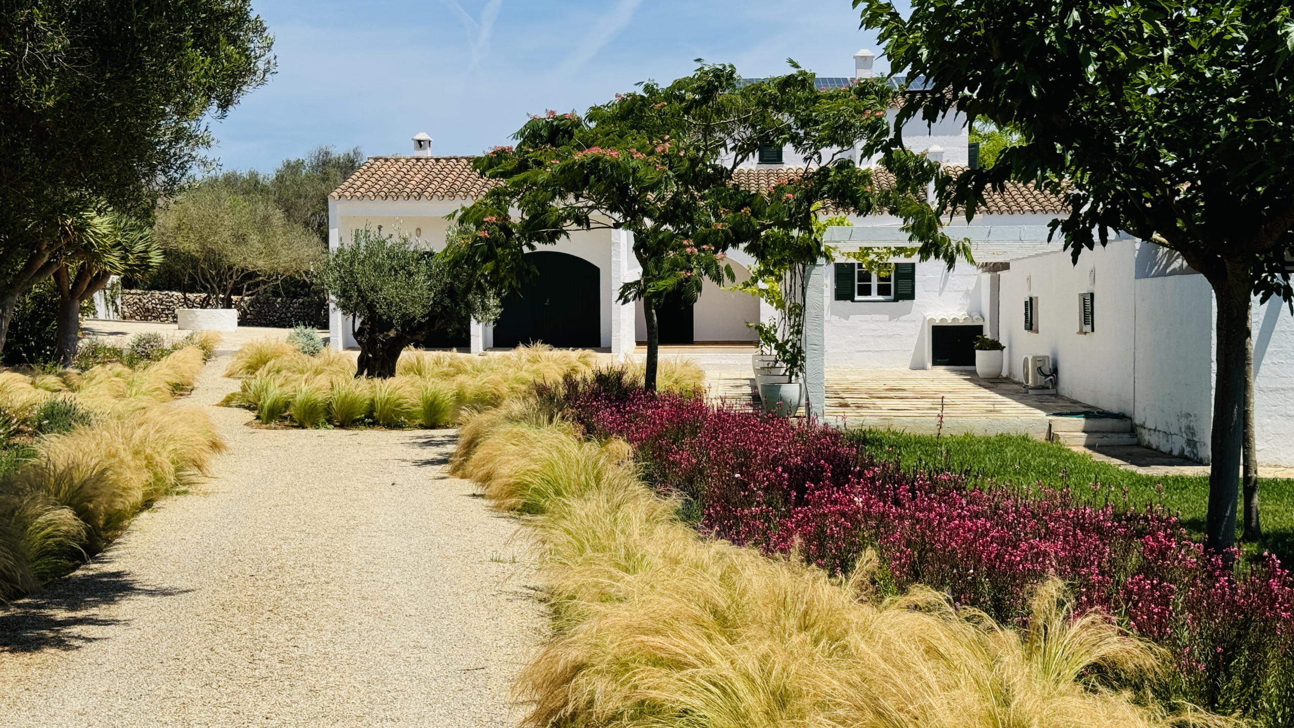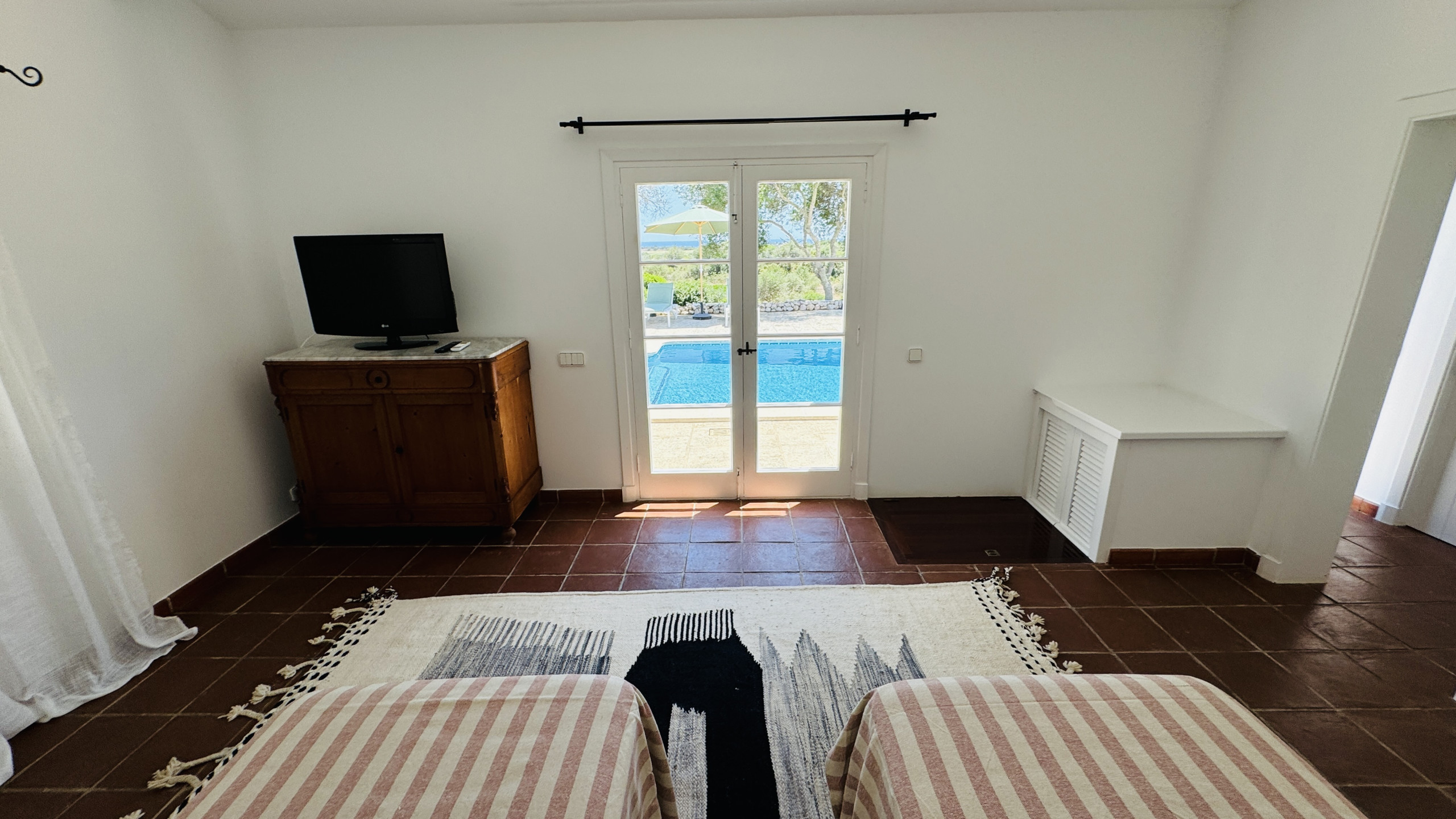The land belonging to the house is approximately 11,000 square metres. The swimming pool is located on the east side of the house and measures 10 x 5 metres. Near the pool, there is a covered area for outdoor dining. The house's porch features typical Menorcan built-in sofas. The land has extensive lawn areas, olive trees, and several very peaceful areas where one can relax in the shade.