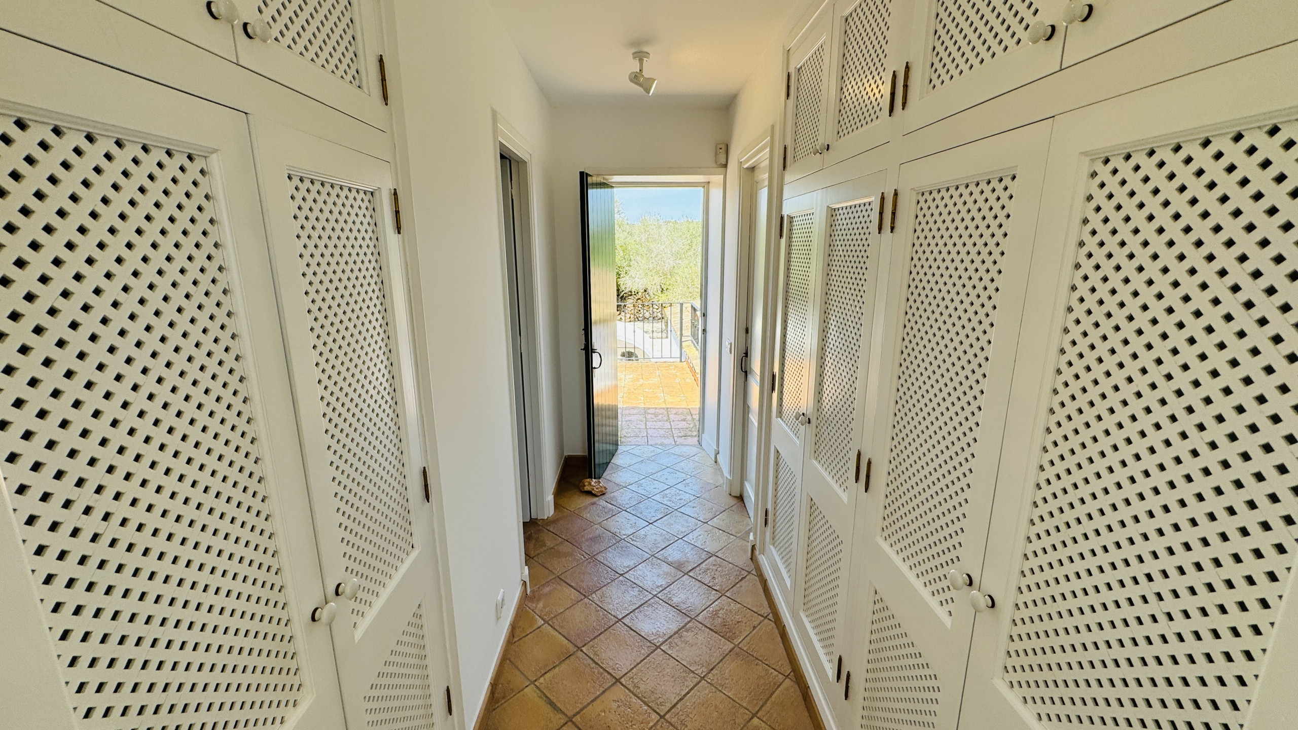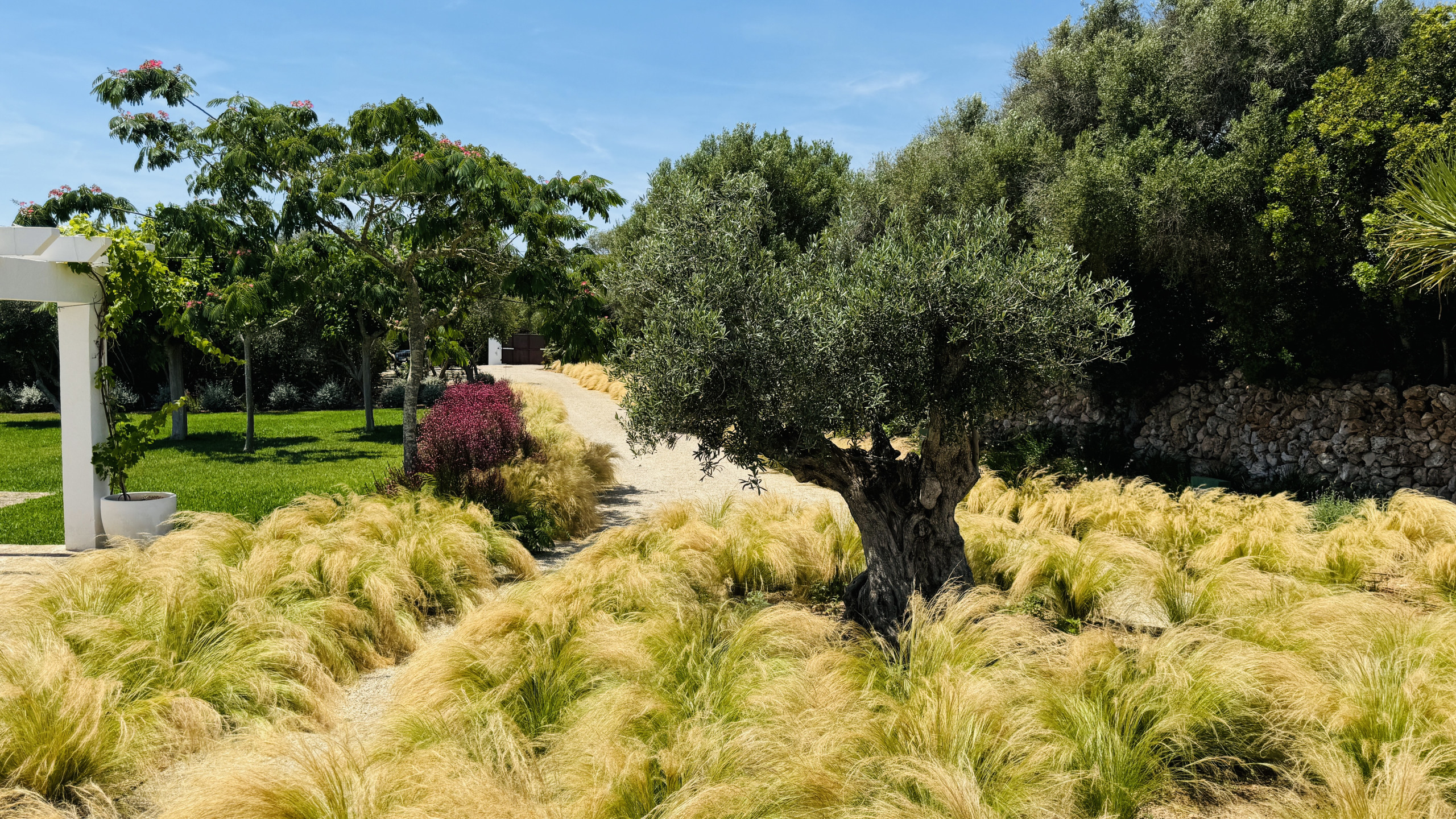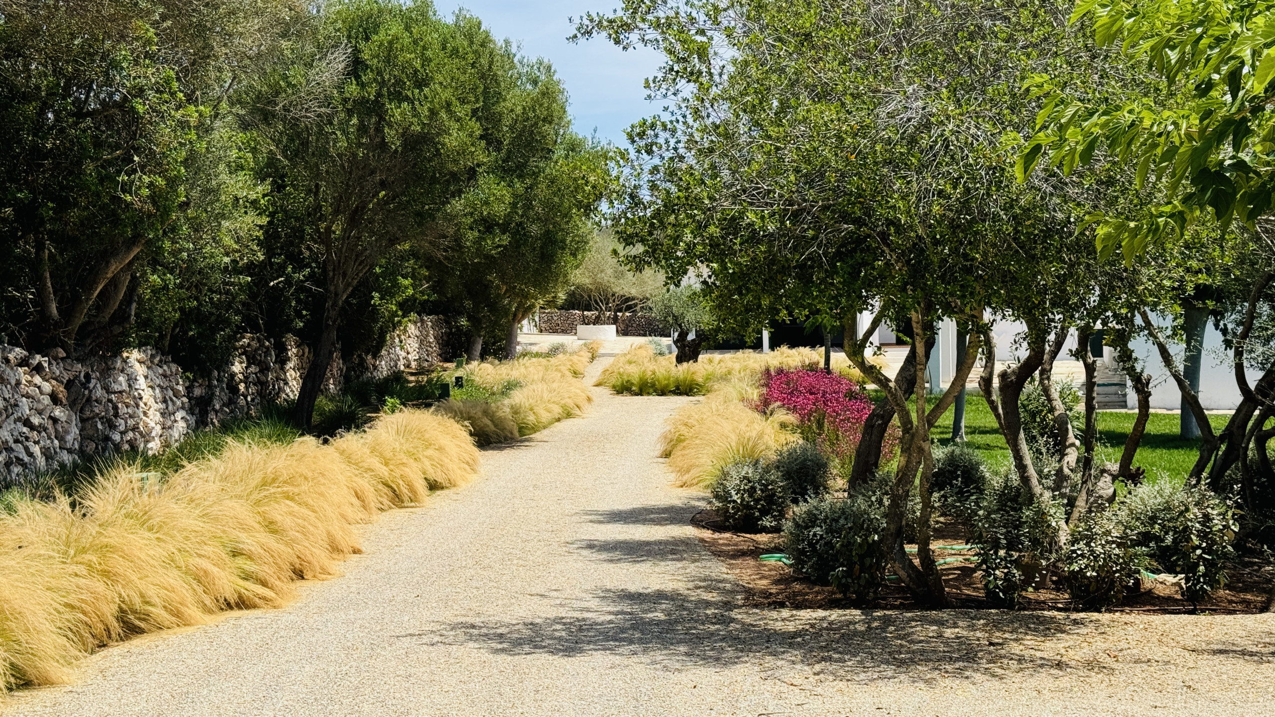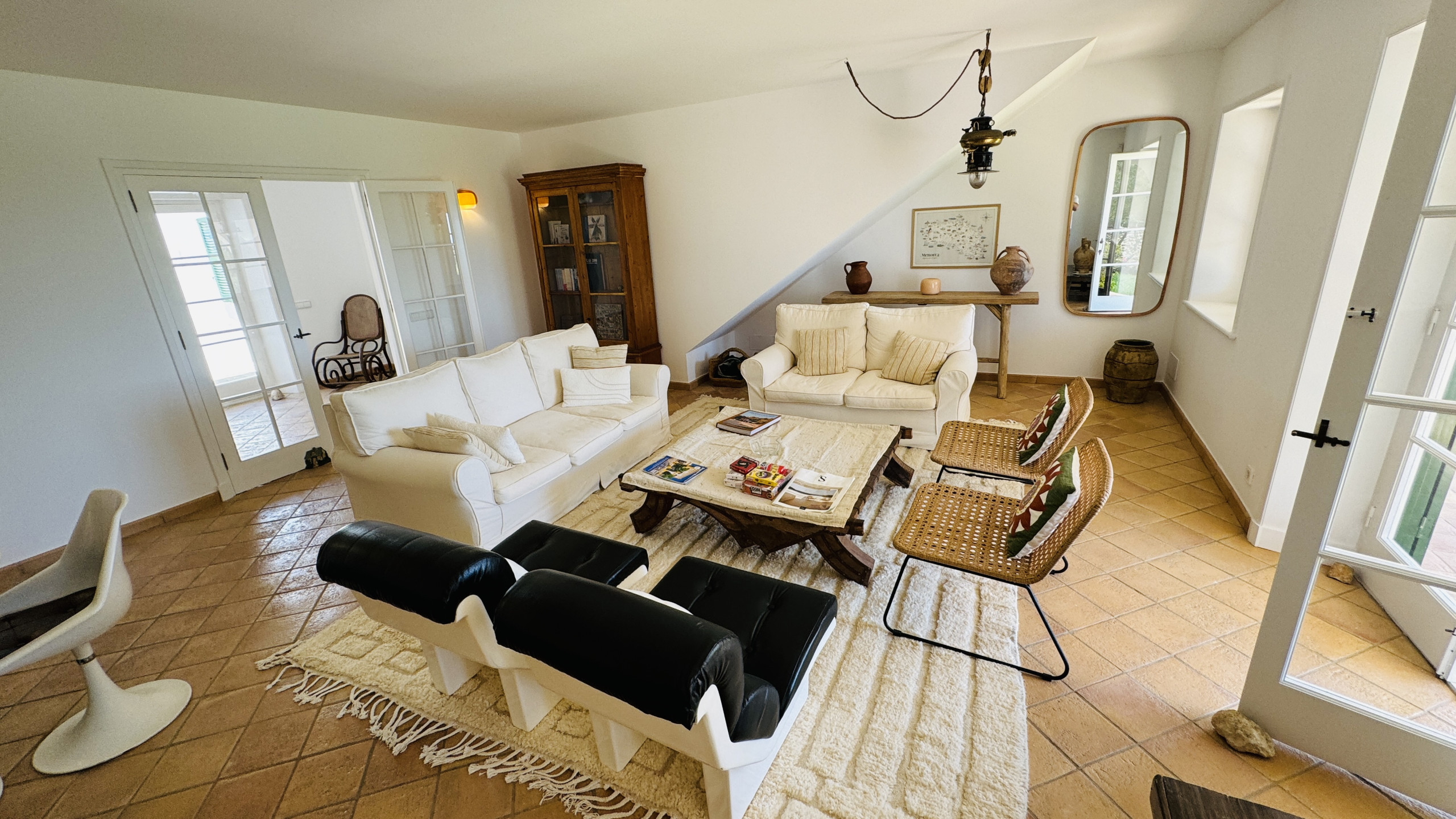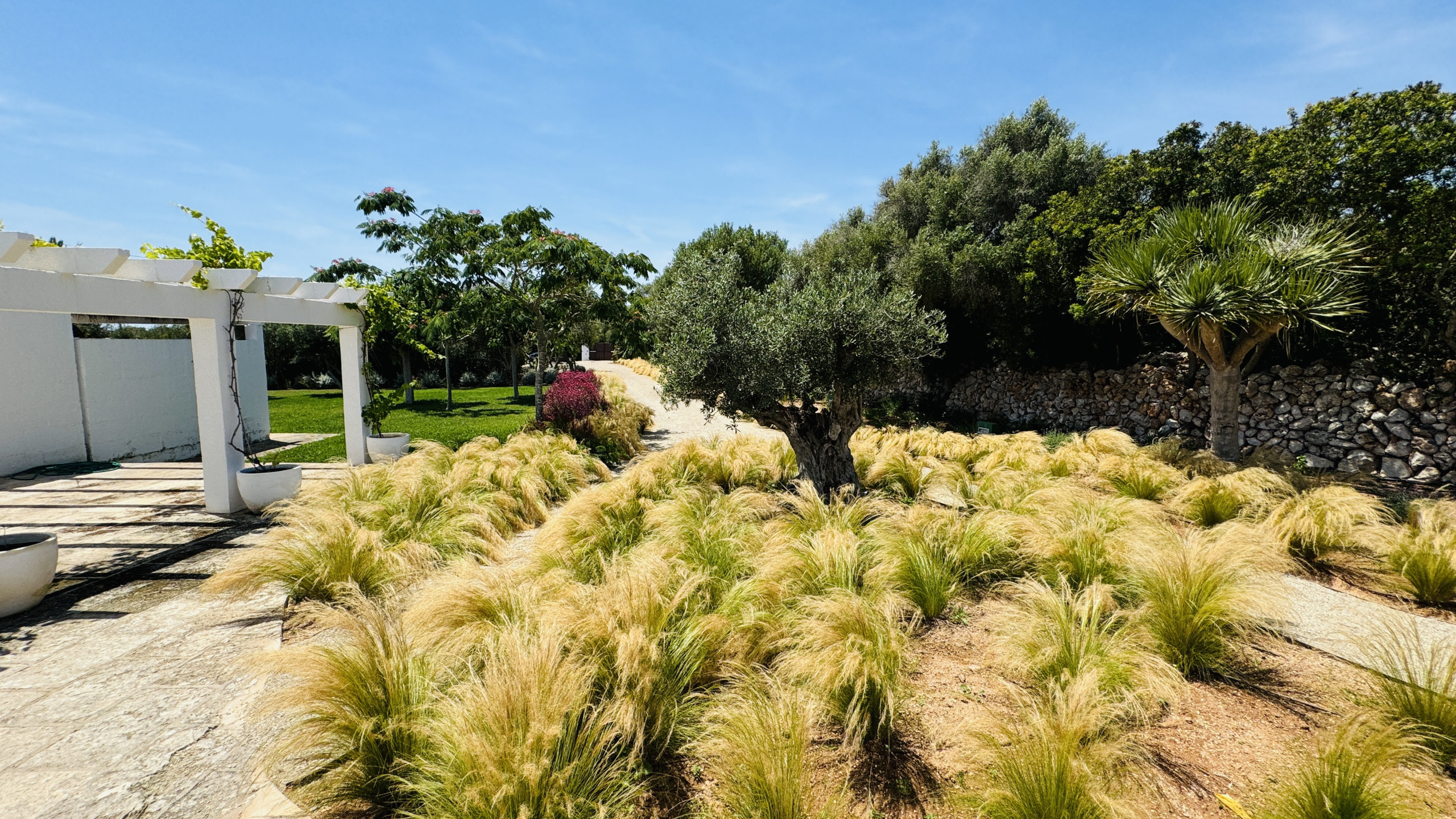 The land belonging to the house is approximately 11,000 square metres. The swimming pool is located on the east side of the house and measures 10 x 5 metres. Near the pool, there is a covered area for outdoor dining. The house's porch features typical Menorcan built-in sofas. The land has extensive lawn areas, olive trees, and several very peaceful areas where one can relax in the shade.