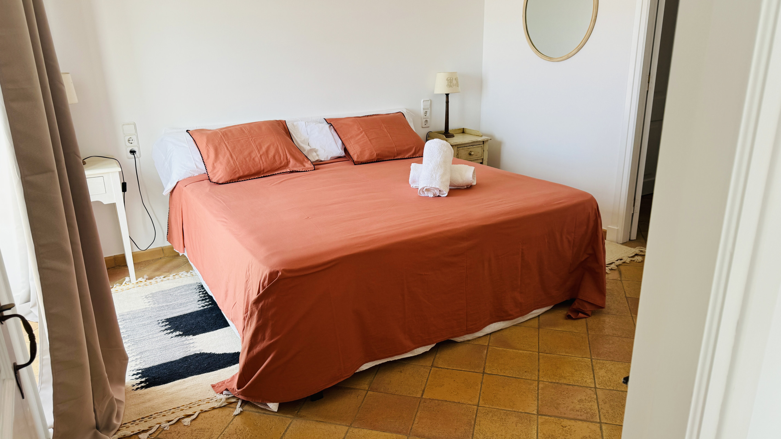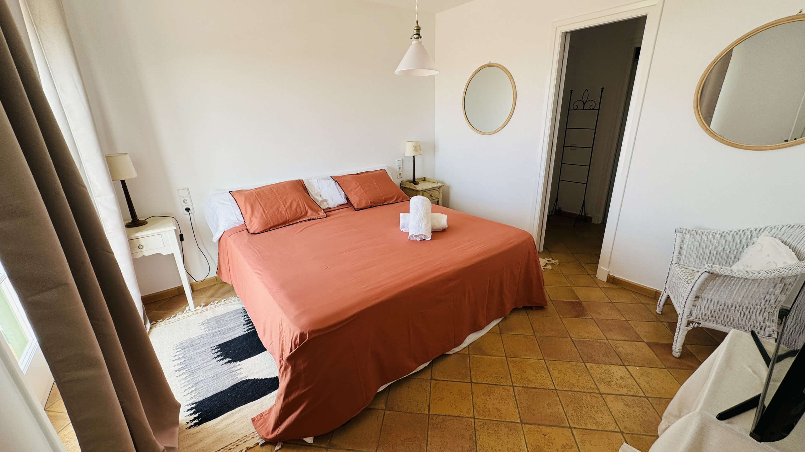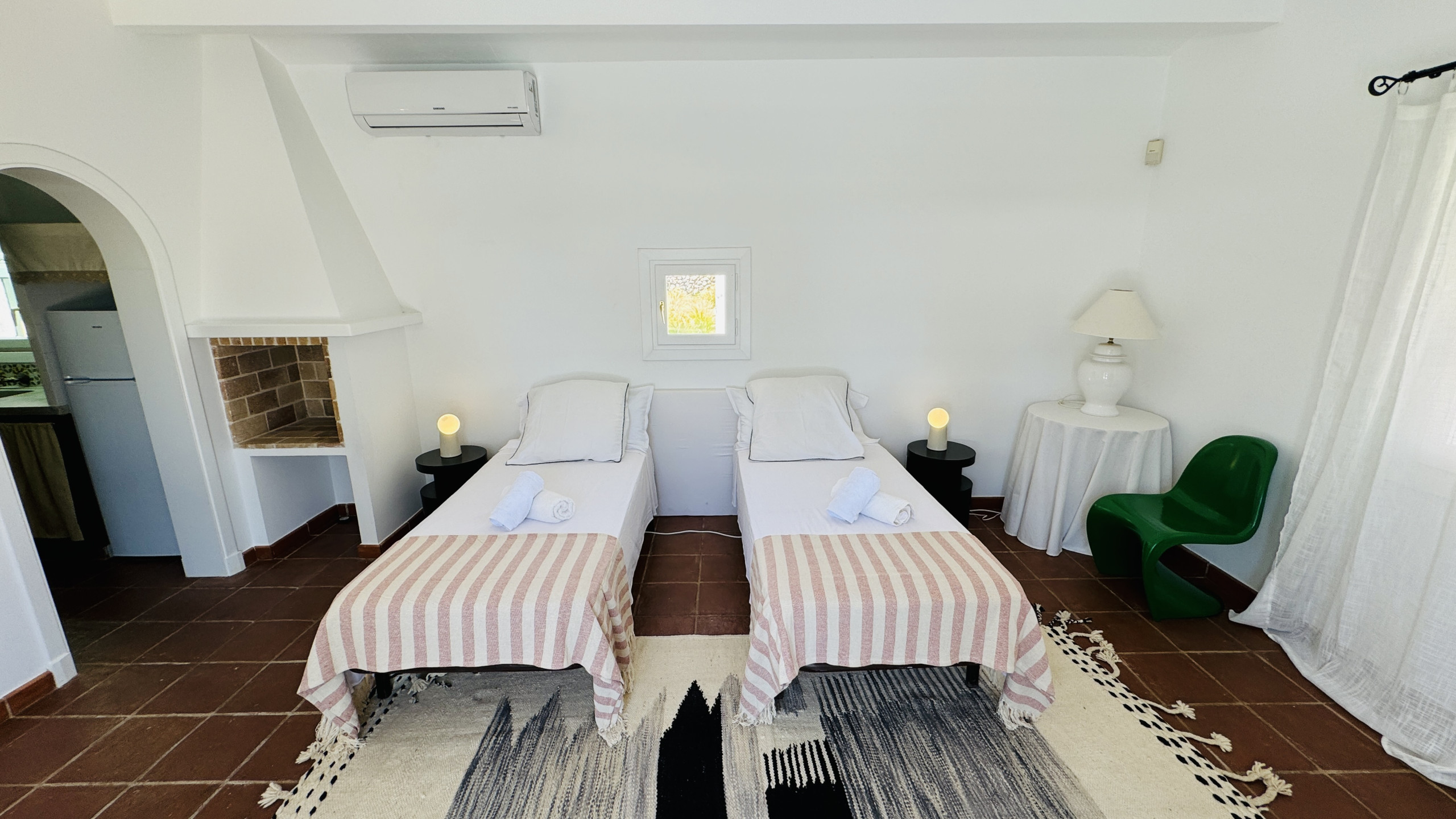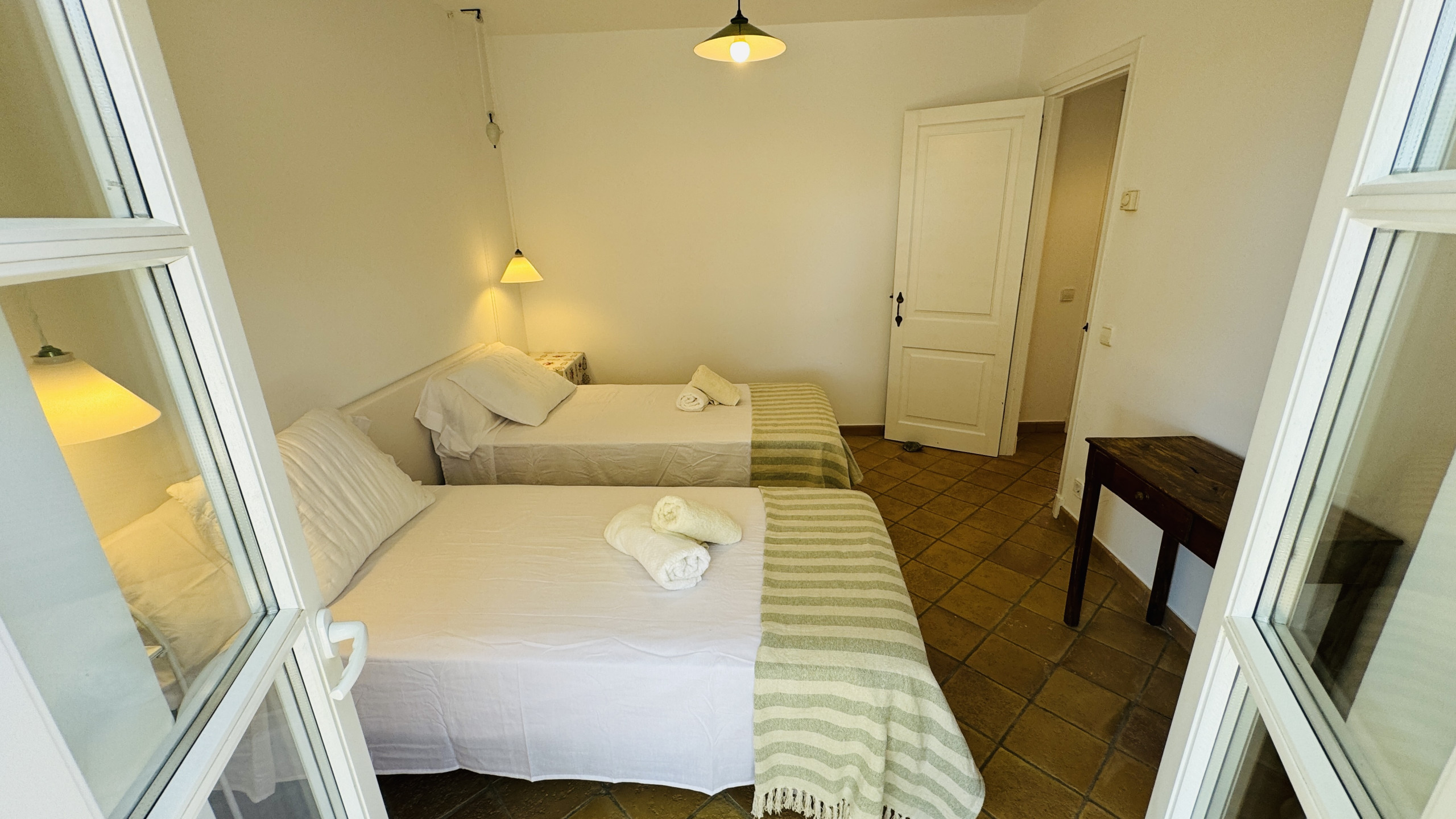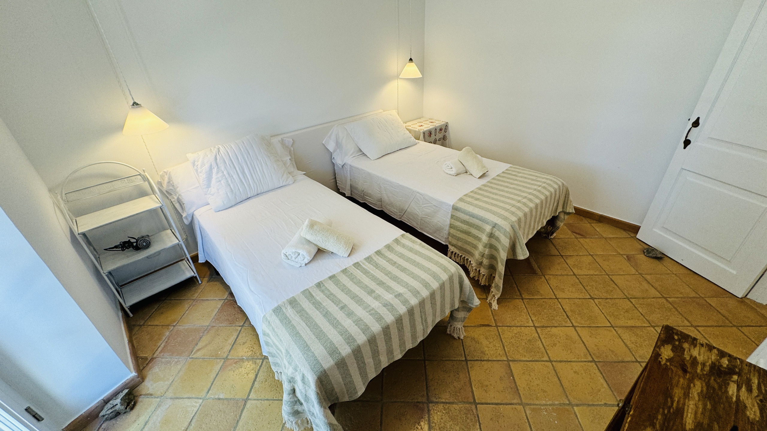 Ground Floor: in the central part of the house are the living room and kitchen, both with access to the front terrace. From here, access is gained to an area with 1 master bedroom (1.60m) with air conditioning and 1 double bedroom (two single beds) with ceiling fan, which share a full bathroom with bathtub. And in the other part of the house there is 1 double bedroom (2 single beds) with ceiling fan, 1 bathroom with shower, 1 toilet and the laundry room.