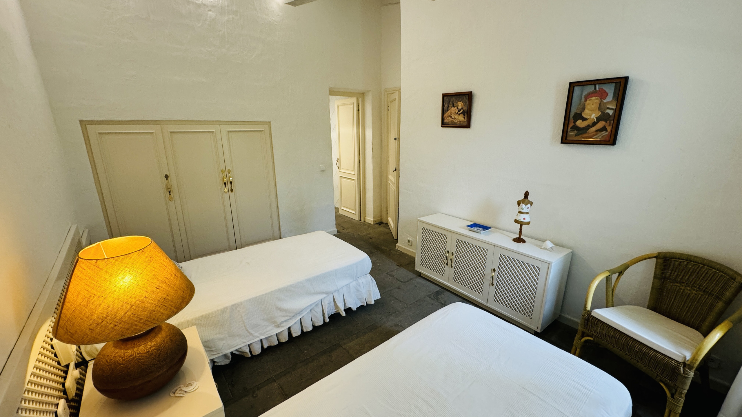 The lower floor or basement is equipped with 1 double room with a bathroom with a shower. This room is suitable for service or for children, as this room is not at the same quality level as the rooms on the main floor. This room does not have air conditioning but does have a portable fan.