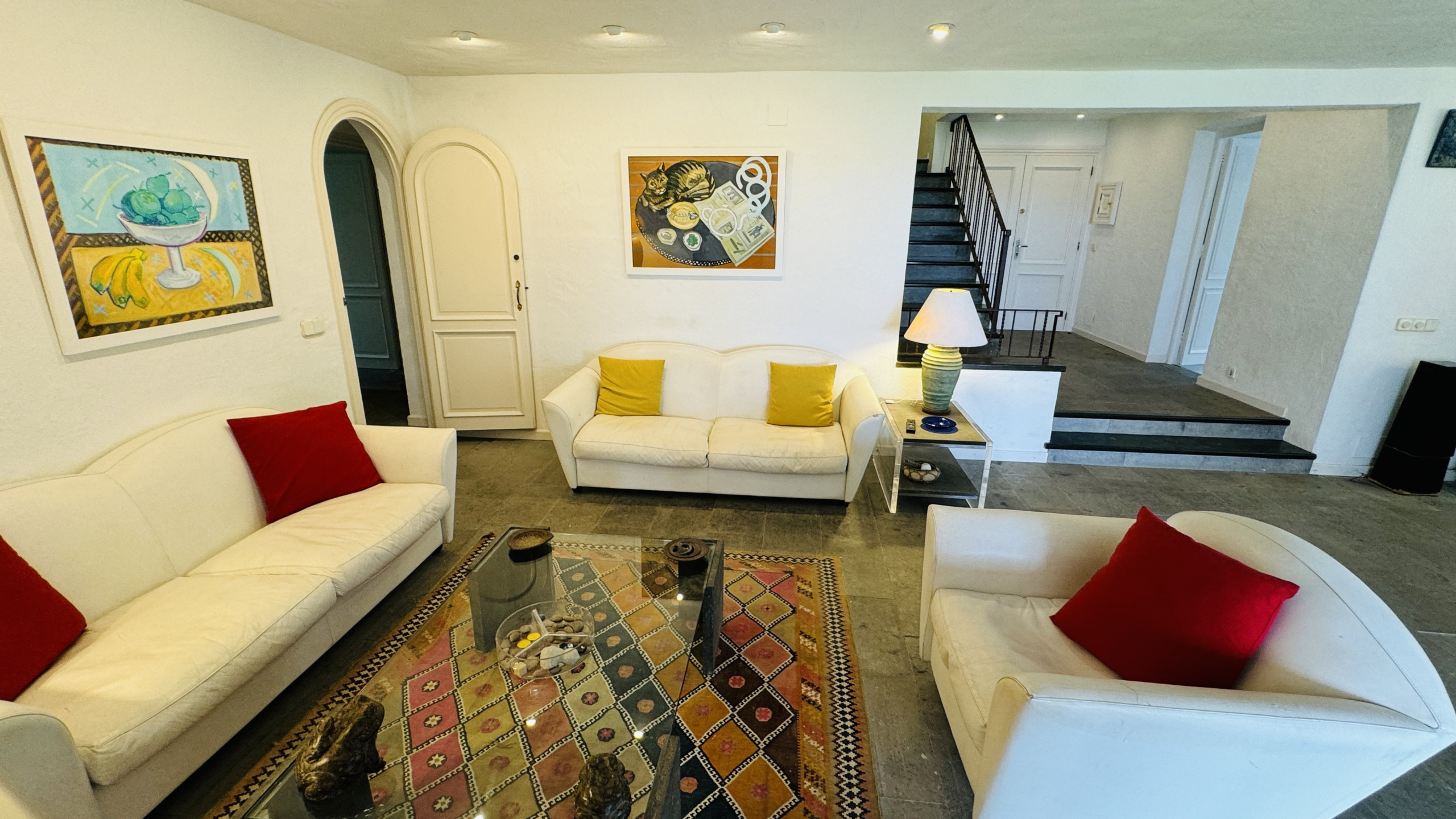 With access via an exterior staircase, on the first floor, there is a spacious terrace with views, fitted with built-in sofas, sun loungers and a breakfast table.