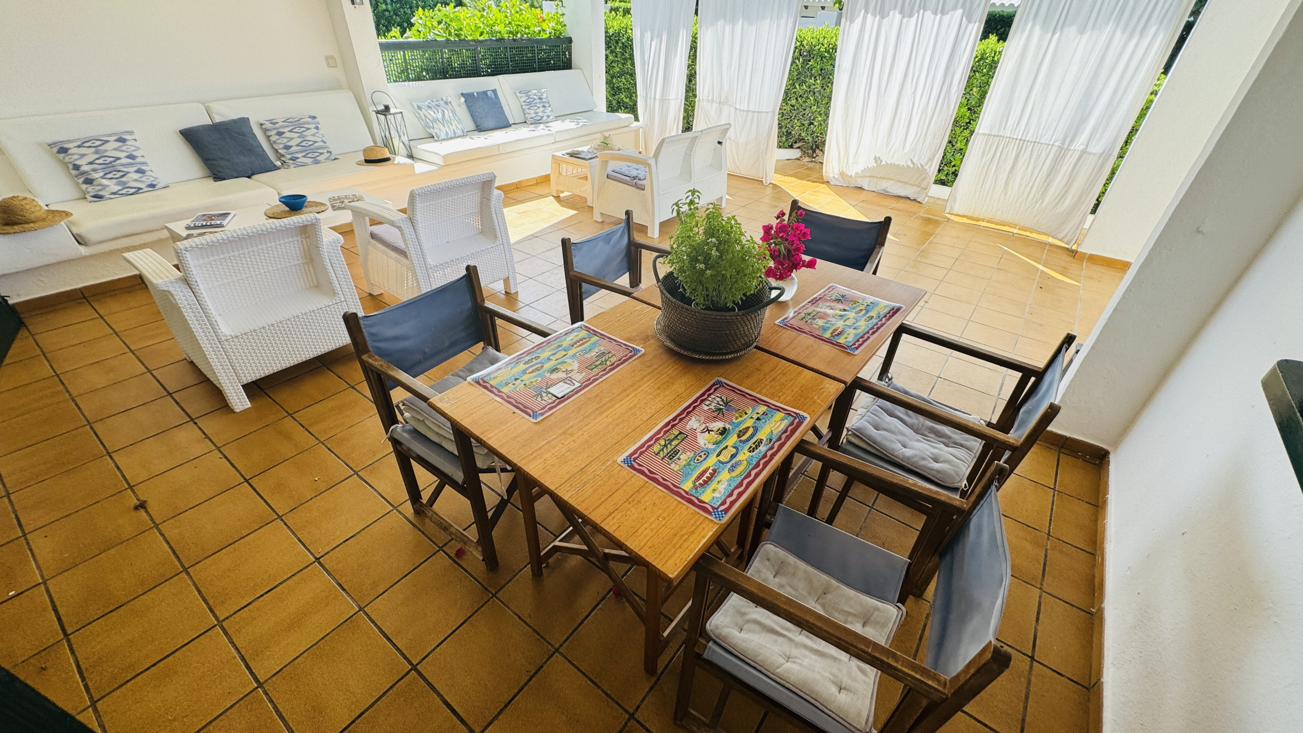 With access via an exterior staircase, on the first floor, there is a spacious terrace with views, fitted with built-in sofas, sun loungers and a breakfast table.