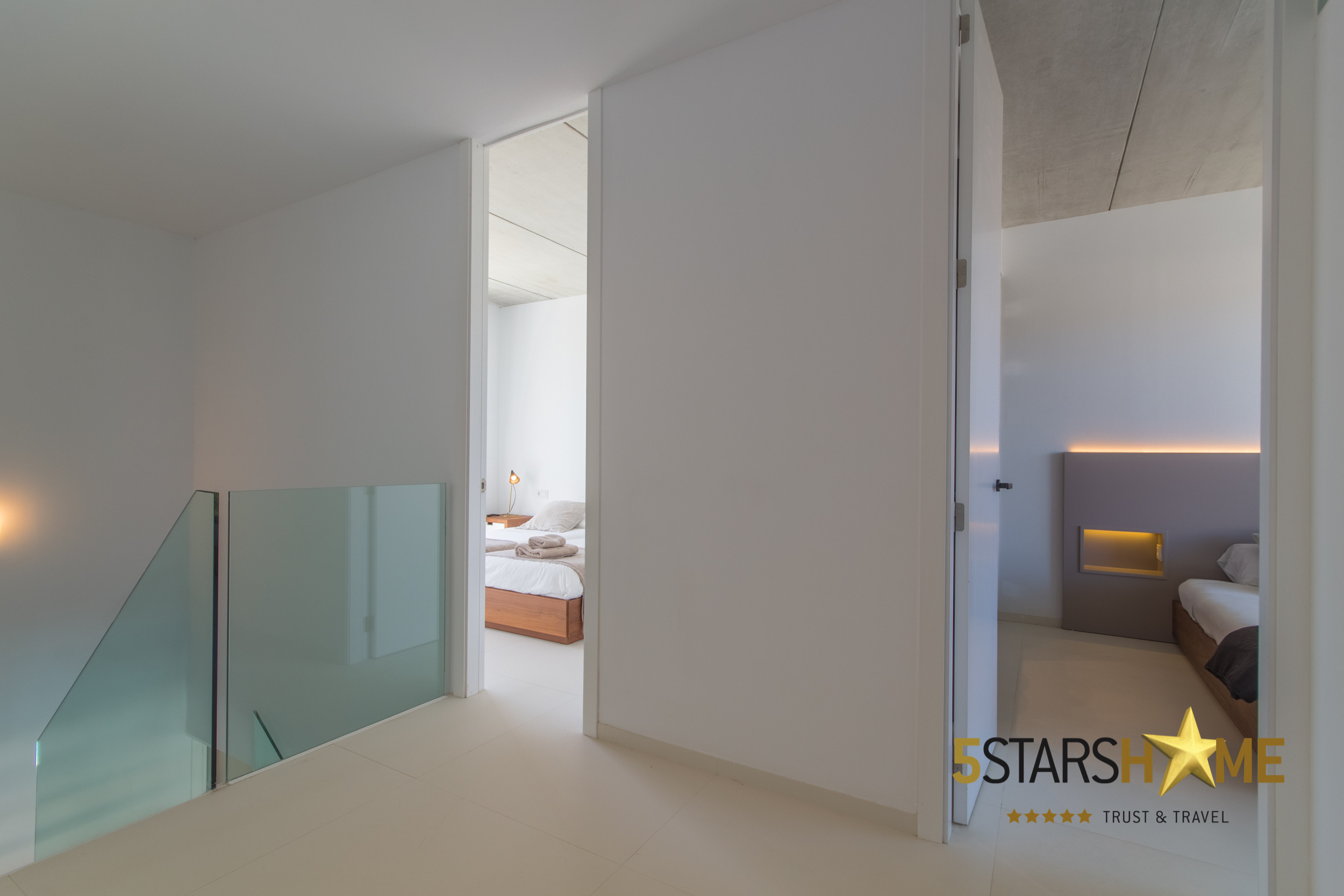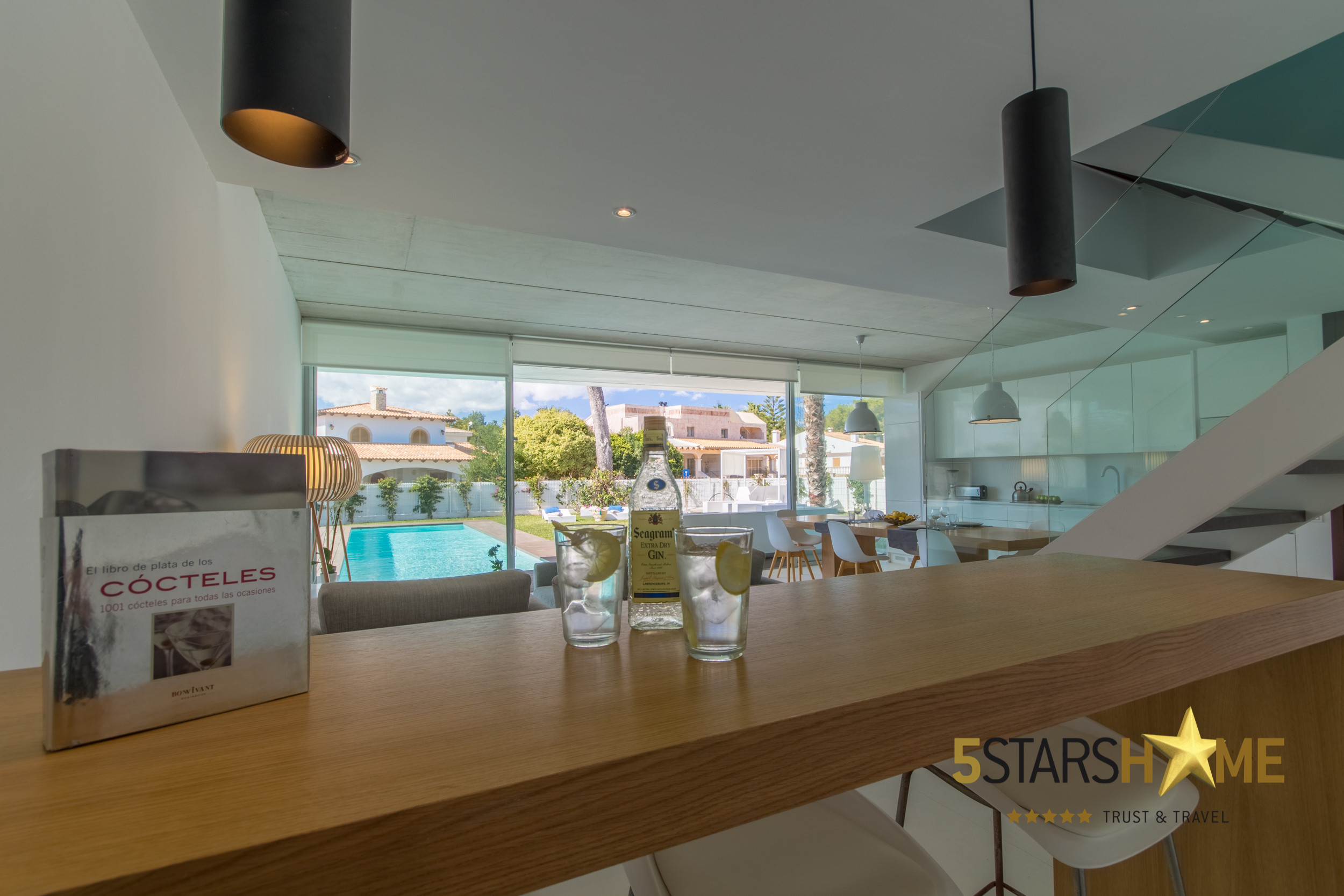 The stylish interior stretches over an impressive 170m² and is divided into 2 levels. The open-plan ground floor is very straightforward and modern. The living area is divided into cozy TV zone with sofa and satellite TV, bar area for delicious cocktail creations, dining area with long wooden table for the whole family and the minimalist kitchenette with everything that belongs to it, fully equipped. The entire interior was chosen very puristically to create a pleasant sense of space without sacrificing comfort and style. In the upper part of the villa are the 4 large double bedrooms ( 2 with 2 single beds each, 2 with 1 double bed each), all very modern and comfortably equipped. Each bedroom has its own TV, air conditioning and fitted wardrobe. The sleeping area of the villa is also very high quality and guarantees the desired holiday rest. Upon request we can provide you with baby cots and high chairs, so that our smallest guests feel well. Even in the cooler season you feel very comfortable here, because the entire house is heated in winter. At 5StarsHome we look forward to your visit and are always on hand, whether during the reservation process or on-site during your vacation ... You can count on us ...
