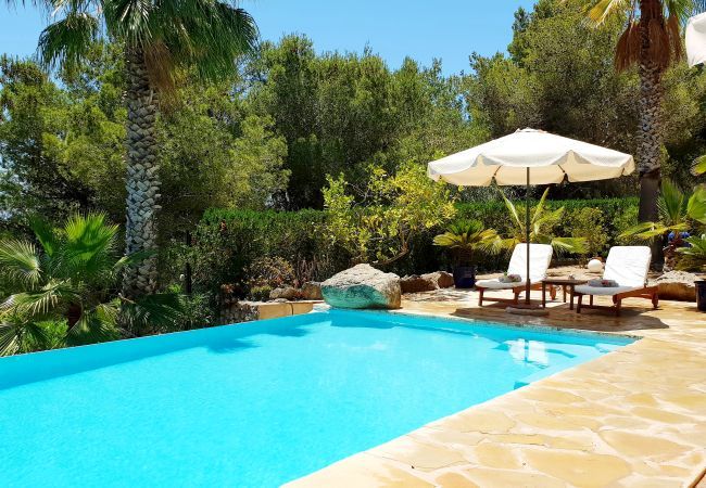 The pool, with its exquisite design and romantic atmosphere, invites you to relax and enjoy the spectacular Ibiza sunsets. Equipped with loungers and surrounded by lush vegetation, it's the perfect place to disconnect and recharge.