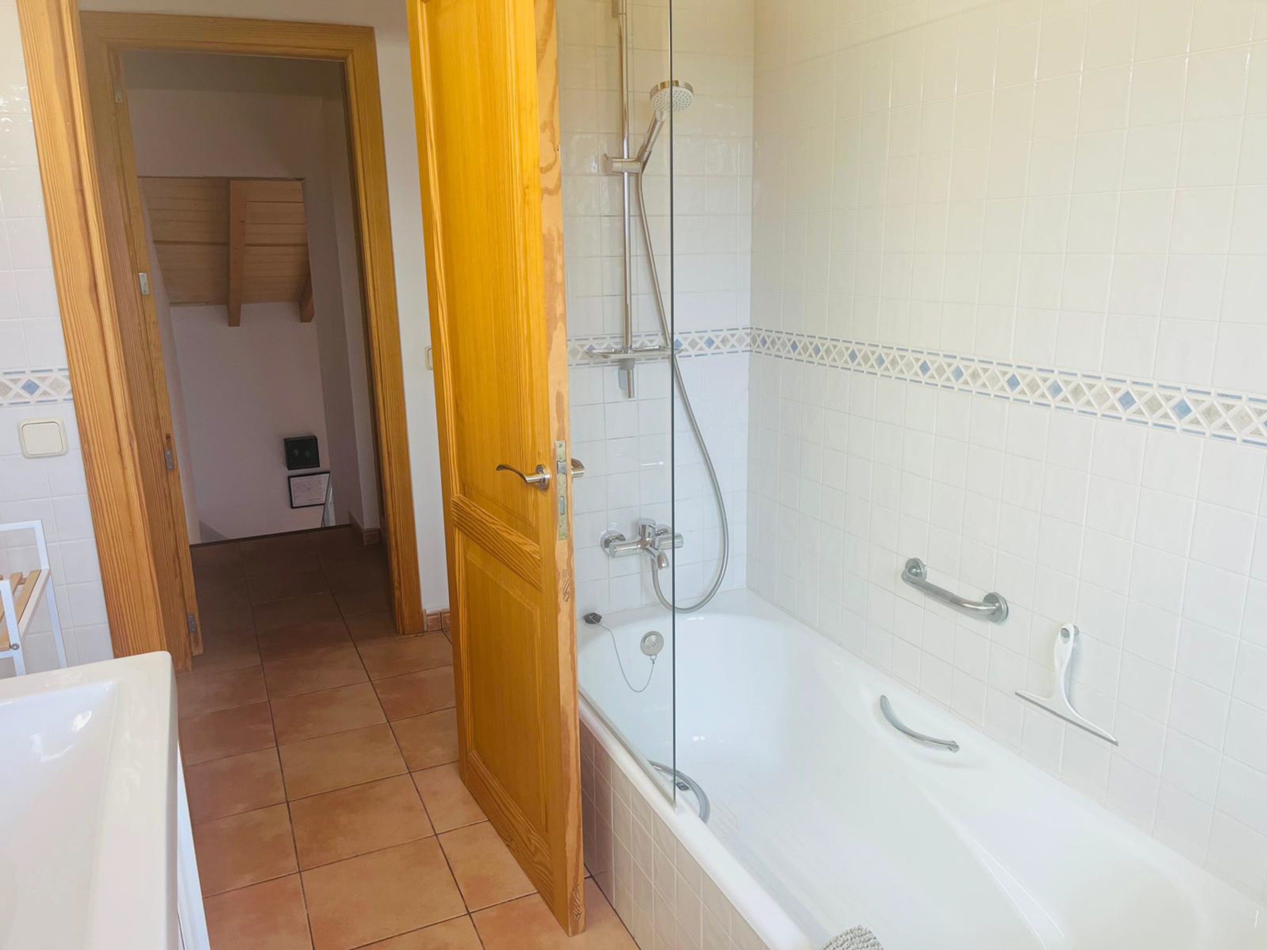 The villa, built on a plot of 7,000 m², features 130 m² distributed over two floors. On the ground floor, there are two double bedrooms, a full bathroom with a bathtub, a spacious living room with a fireplace and seating area, a dining room with direct access to an independent kitchen and exit to the porch, perfect for outdoor meals. The upper floor houses a master bedroom with an en-suite bathroom and bathtub, as well as a private terrace with views of the Serra de Tramuntana, ideal for enjoying Mallorcan sunsets. The interior stands out for its modern and bright design, combined with a cosy and functional decoration.