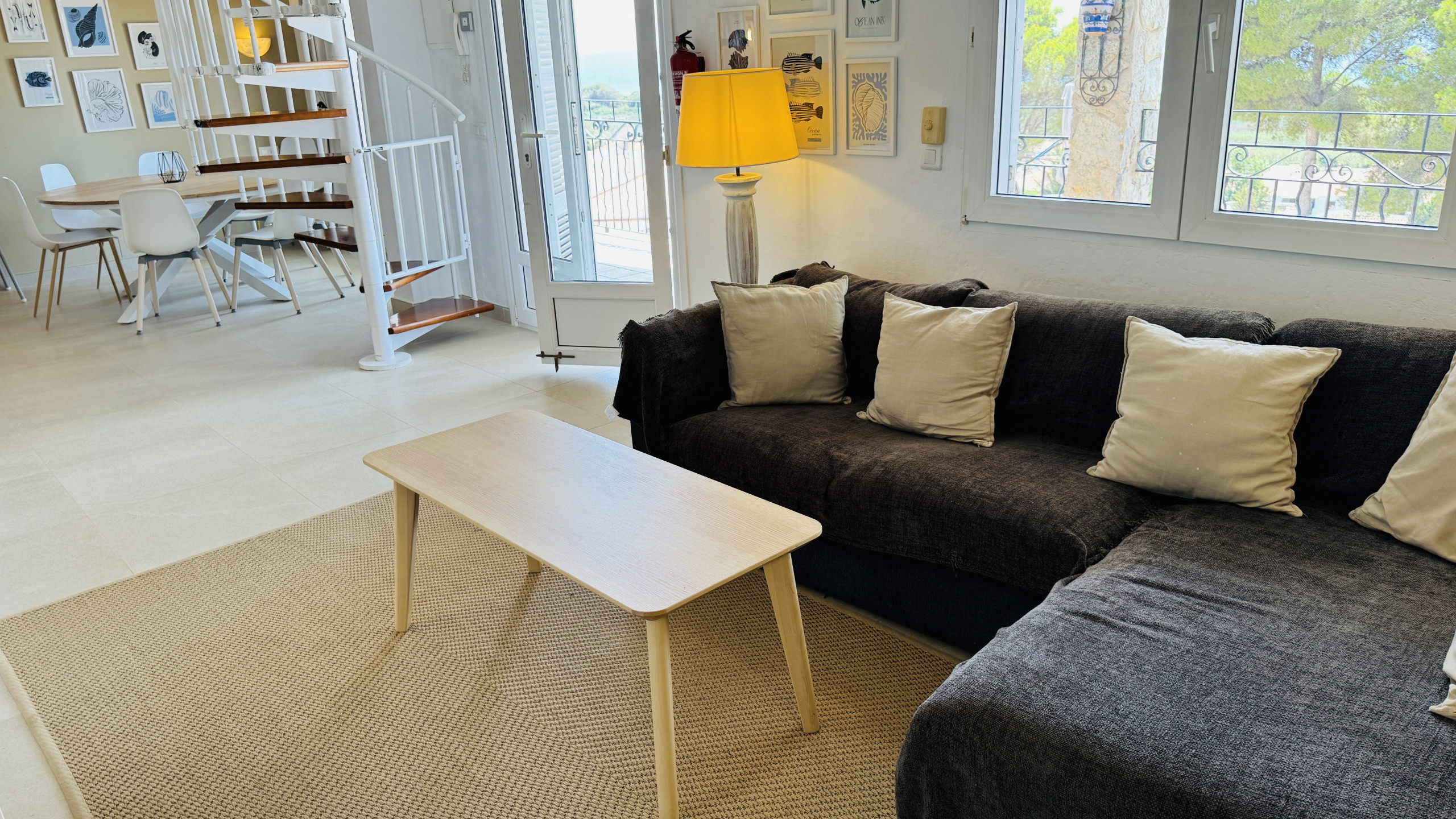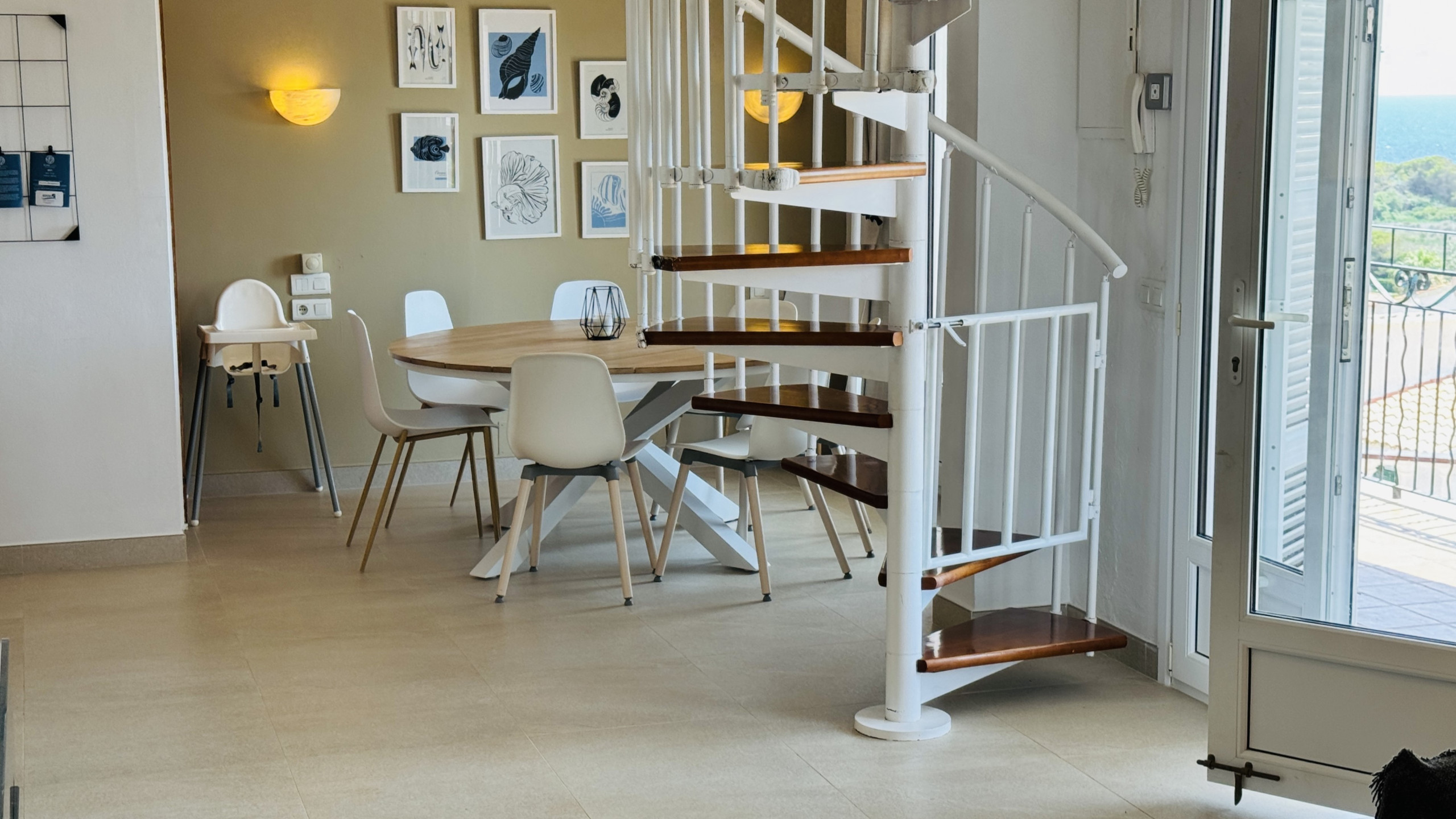 An internal spiral staircase leads to the upper level