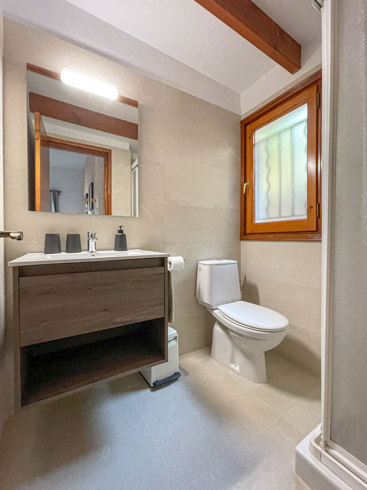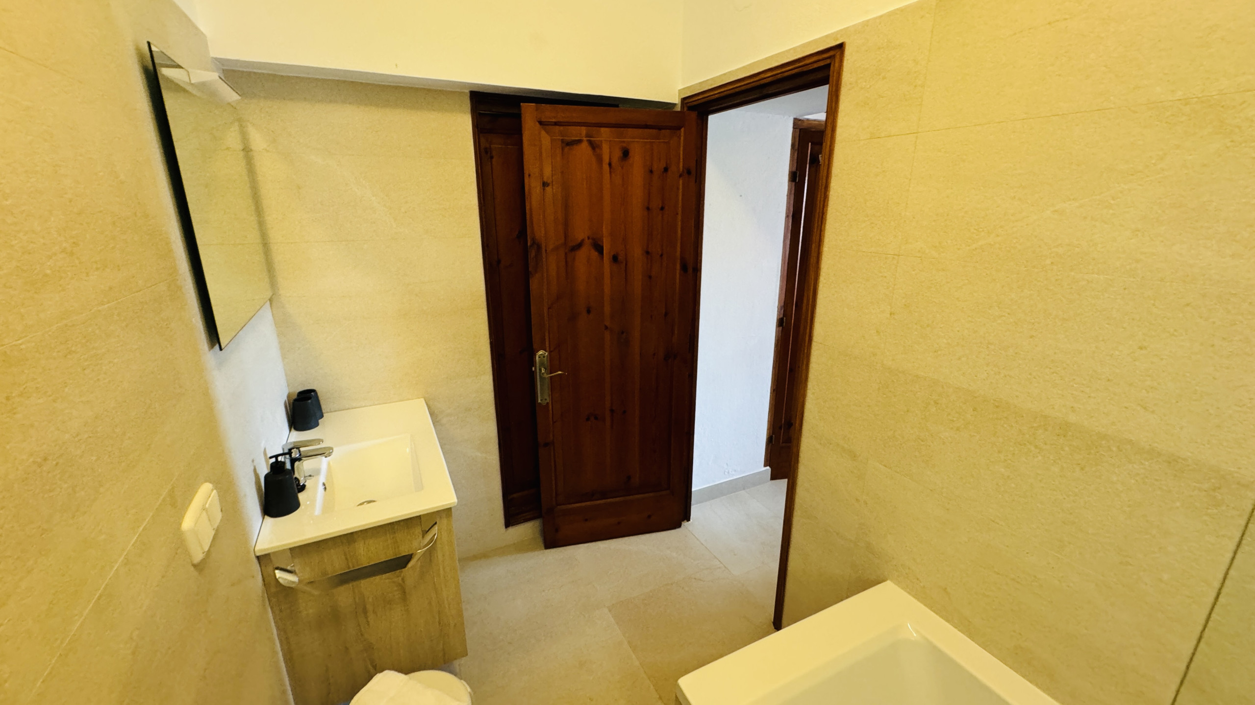 2. On the lower floor there is a double bedroom and a bedroom with two single beds and an independent bathroom (independent bathtub and shower) shared between the two bedrooms.