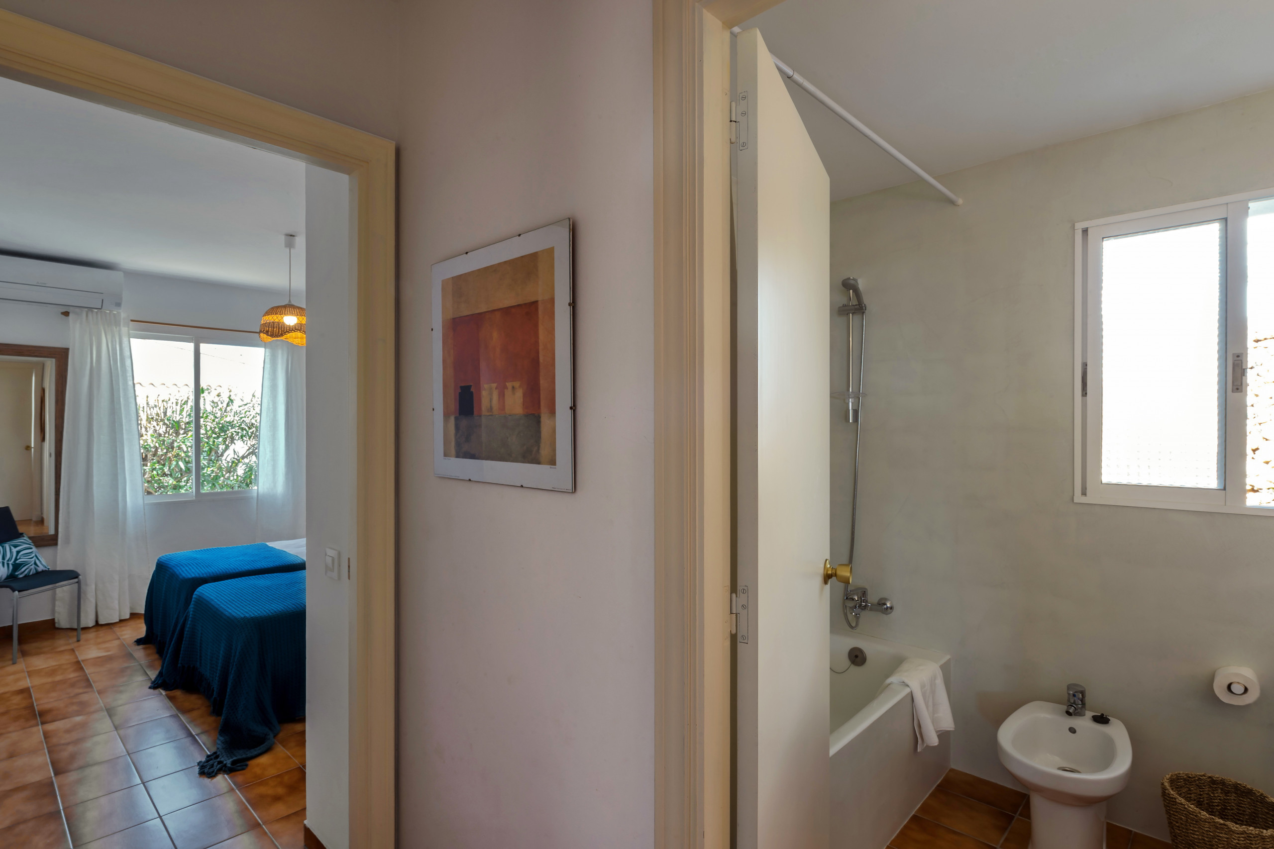 The villa has 3 bedrooms with capacity for 6 people, distributed in 1 double room and 4 single beds. It has 2 bathrooms, one with a shower and another with a bathtub, which ensures the comfort of all guests. The house is fully equipped with air conditioning in the bedrooms, WiFi and a television with channels in various languages.